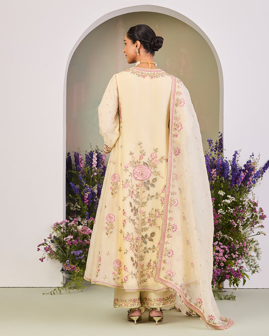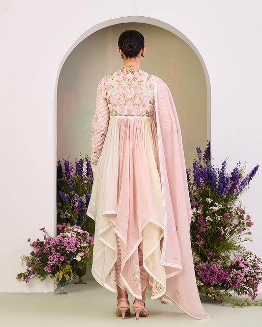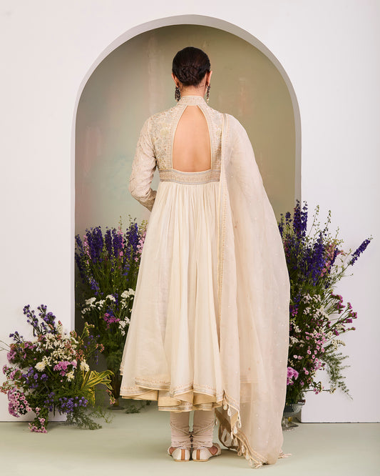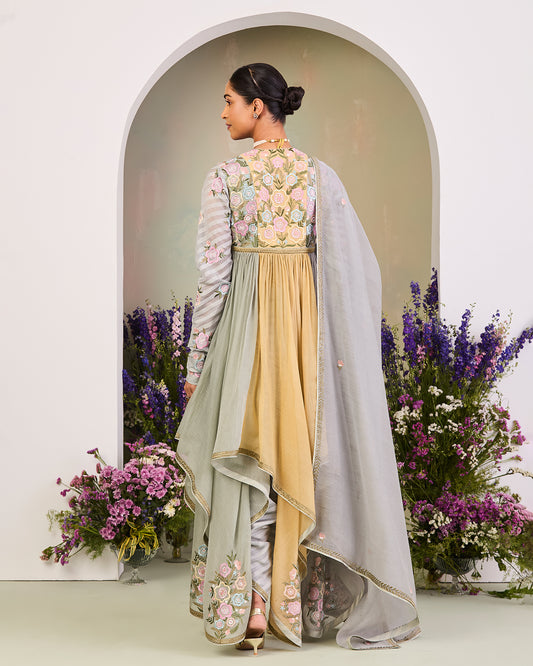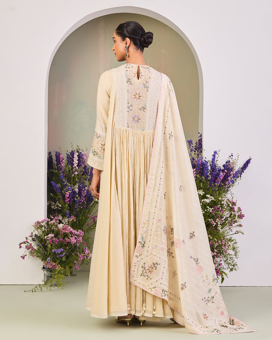 There are many types and pattern of anarkali dress that you can choose from. There are floor-length anarkali sets for formal events like weddings and receptions. Brides can choose a large anarkali for pre-wedding festivities such as mehendi or haldi, especially if they want to avoid wearing a lehenga or sari. Rich embellishments, layered flares, and sumptuous fabrics enhance the bridal look. We have many long pattern Anarklai dress sets. One of which is the very famous Kalidar sets made from raw silk and gorgeous chanderi mul mul fits too. These are so comfortable that you twirl in them. Very easy to carry and will suit most celebrated events in your life. Also, the very famous Radha Anarkali set from the Threads of Love collection is a beige raw silk, high-waisted Anarkali with multi-colored aari work, sequins, and pearl embroidery. Paired with an embroidered fuchsia Banarasi palazzo and a shaded handwoven cotton tissue dupatta.