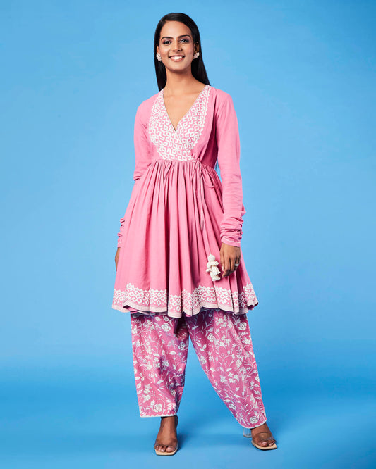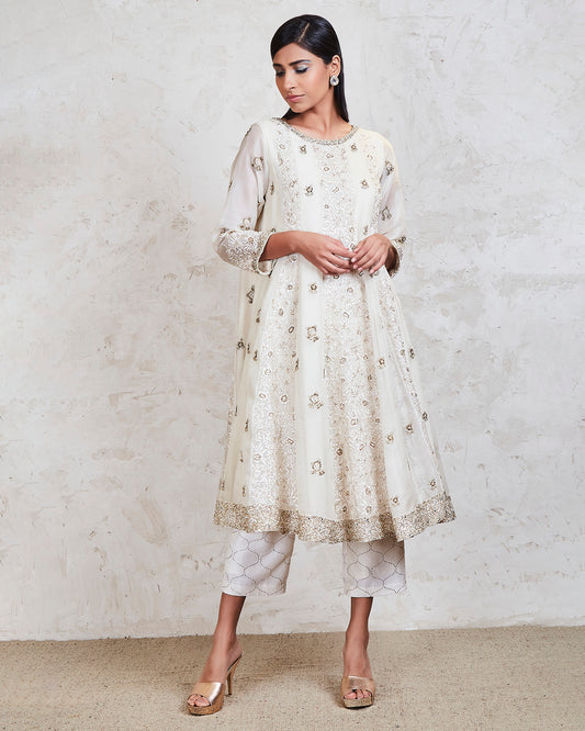 There are many types and pattern of anarkali dress that you can choose from. There are floor-length anarkali sets for formal events like weddings and receptions. Brides can choose a large anarkali for pre-wedding festivities such as mehendi or haldi, especially if they want to avoid wearing a lehenga or sari. Rich embellishments, layered flares, and sumptuous fabrics enhance the bridal look. We have many long pattern Anarklai dress sets. One of which is the very famous Kalidar sets made from raw silk and gorgeous chanderi mul mul fits too. These are so comfortable that you twirl in them. Very easy to carry and will suit most celebrated events in your life. Also, the very famous Radha Anarkali set from the Threads of Love collection is a beige raw silk, high-waisted Anarkali with multi-colored aari work, sequins, and pearl embroidery. Paired with an embroidered fuchsia Banarasi palazzo and a shaded handwoven cotton tissue dupatta.