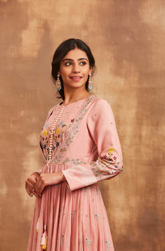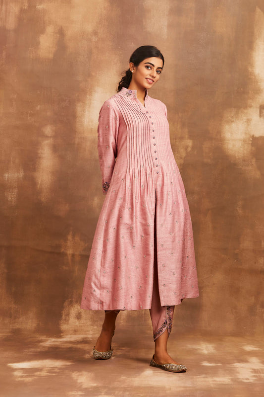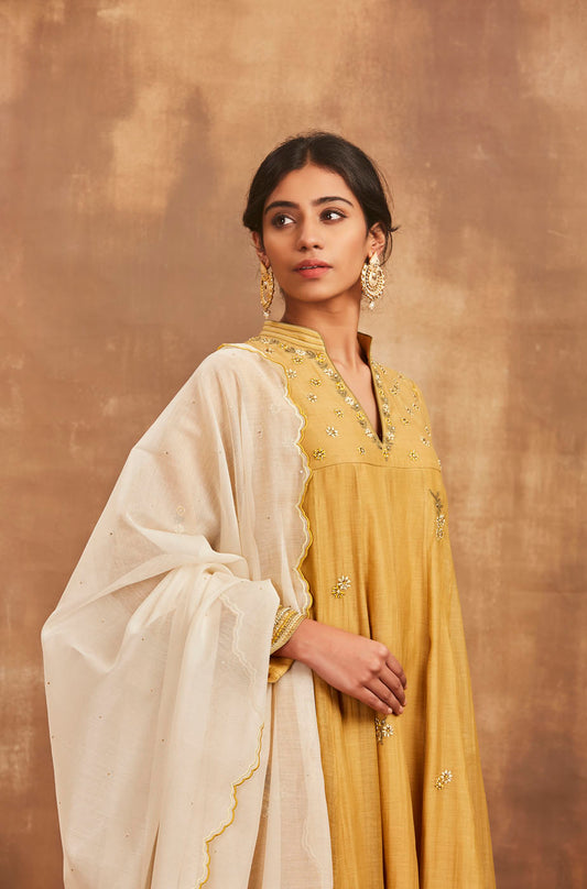 There are many types and pattern of anarkali dress that you can choose from. There are floor-length anarkali sets for formal events like weddings and receptions. Brides can choose a large anarkali for pre-wedding festivities such as mehendi or haldi, especially if they want to avoid wearing a lehenga or sari. Rich embellishments, layered flares, and sumptuous fabrics enhance the bridal look. We have many long pattern Anarklai dress sets. One of which is the very famous Kalidar sets made from raw silk and gorgeous chanderi mul mul fits too. These are so comfortable that you twirl in them. Very easy to carry and will suit most celebrated events in your life. Also, the very famous Radha Anarkali set from the Threads of Love collection is a beige raw silk, high-waisted Anarkali with multi-colored aari work, sequins, and pearl embroidery. Paired with an embroidered fuchsia Banarasi palazzo and a shaded handwoven cotton tissue dupatta.