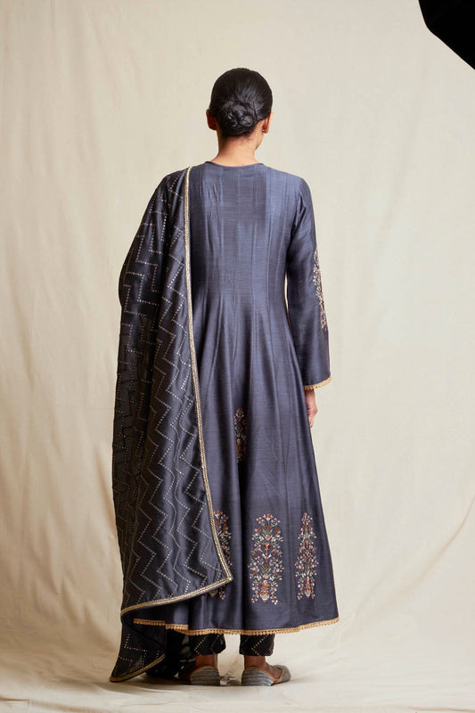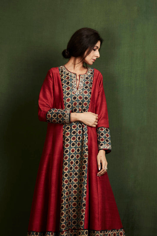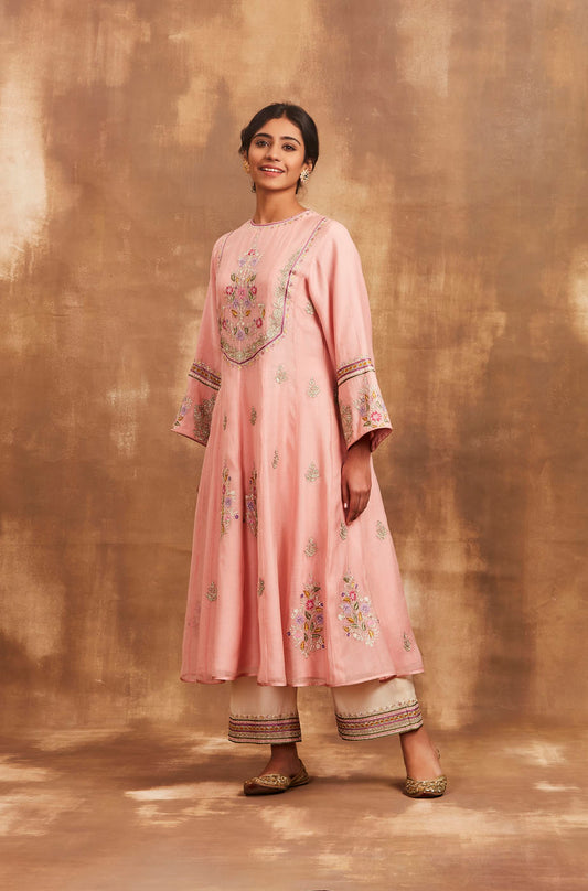 There are many types and pattern of anarkali dress that you can choose from. There are floor-length anarkali sets for formal events like weddings and receptions. Brides can choose a large anarkali for pre-wedding festivities such as mehendi or haldi, especially if they want to avoid wearing a lehenga or sari. Rich embellishments, layered flares, and sumptuous fabrics enhance the bridal look. We have many long pattern Anarklai dress sets. One of which is the very famous Kalidar sets made from raw silk and gorgeous chanderi mul mul fits too. These are so comfortable that you twirl in them. Very easy to carry and will suit most celebrated events in your life. Also, the very famous Radha Anarkali set from the Threads of Love collection is a beige raw silk, high-waisted Anarkali with multi-colored aari work, sequins, and pearl embroidery. Paired with an embroidered fuchsia Banarasi palazzo and a shaded handwoven cotton tissue dupatta.