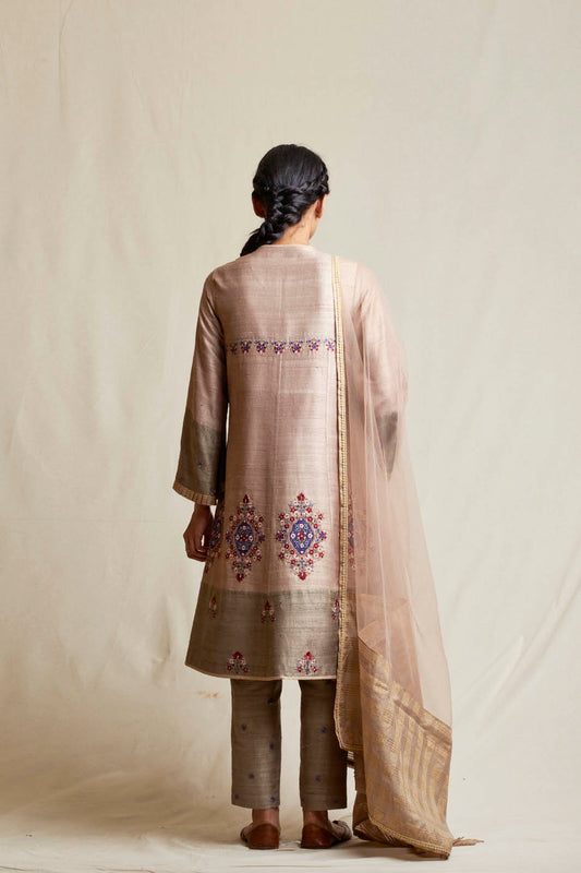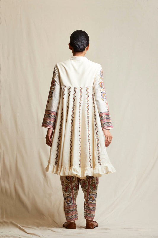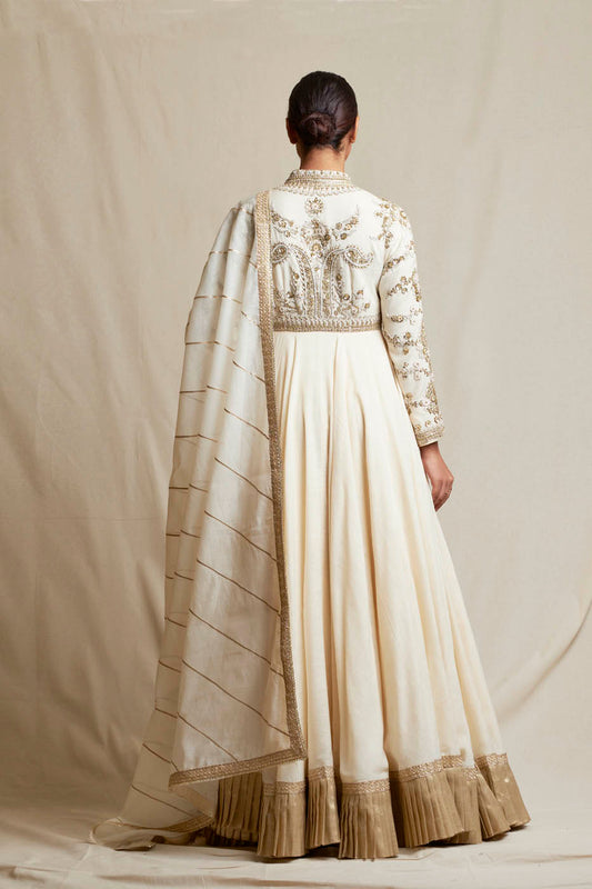 There are many types and pattern of anarkali dress that you can choose from. There are floor-length anarkali sets for formal events like weddings and receptions. Brides can choose a large anarkali for pre-wedding festivities such as mehendi or haldi, especially if they want to avoid wearing a lehenga or sari. Rich embellishments, layered flares, and sumptuous fabrics enhance the bridal look. We have many long pattern Anarklai dress sets. One of which is the very famous Kalidar sets made from raw silk and gorgeous chanderi mul mul fits too. These are so comfortable that you twirl in them. Very easy to carry and will suit most celebrated events in your life. Also, the very famous Radha Anarkali set from the Threads of Love collection is a beige raw silk, high-waisted Anarkali with multi-colored aari work, sequins, and pearl embroidery. Paired with an embroidered fuchsia Banarasi palazzo and a shaded handwoven cotton tissue dupatta.
