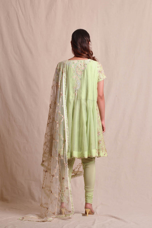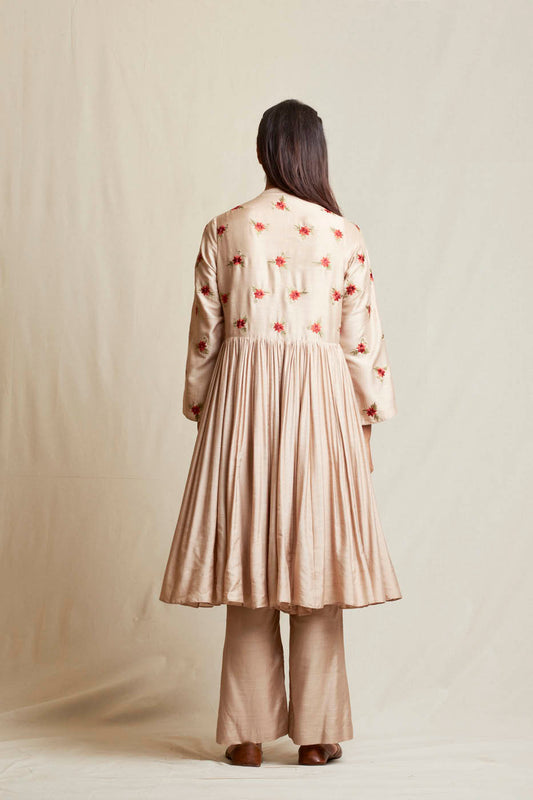 There are many types and pattern of anarkali dress that you can choose from. There are floor-length anarkali sets for formal events like weddings and receptions. Brides can choose a large anarkali for pre-wedding festivities such as mehendi or haldi, especially if they want to avoid wearing a lehenga or sari. Rich embellishments, layered flares, and sumptuous fabrics enhance the bridal look. We have many long pattern Anarklai dress sets. One of which is the very famous Kalidar sets made from raw silk and gorgeous chanderi mul mul fits too. These are so comfortable that you twirl in them. Very easy to carry and will suit most celebrated events in your life. Also, the very famous Radha Anarkali set from the Threads of Love collection is a beige raw silk, high-waisted Anarkali with multi-colored aari work, sequins, and pearl embroidery. Paired with an embroidered fuchsia Banarasi palazzo and a shaded handwoven cotton tissue dupatta.