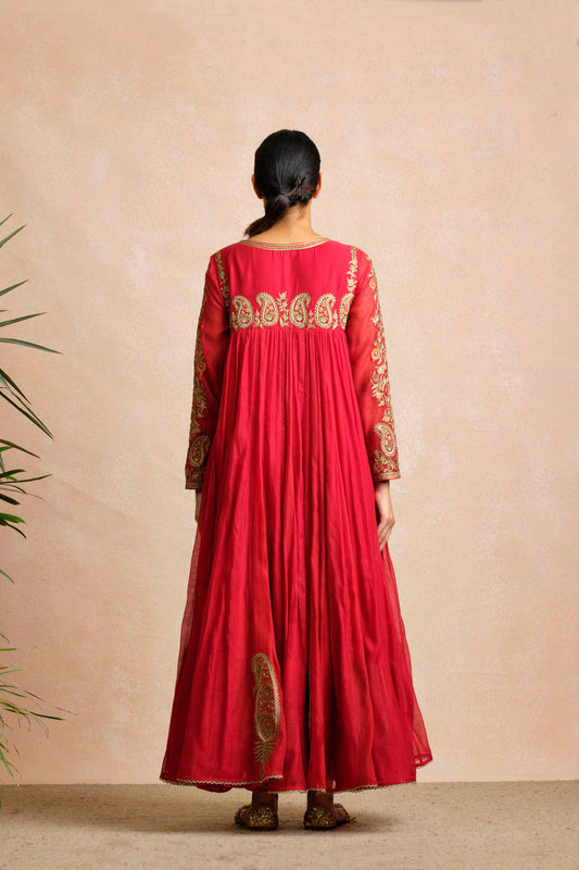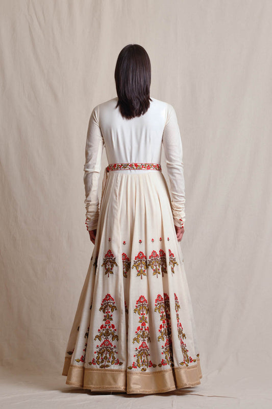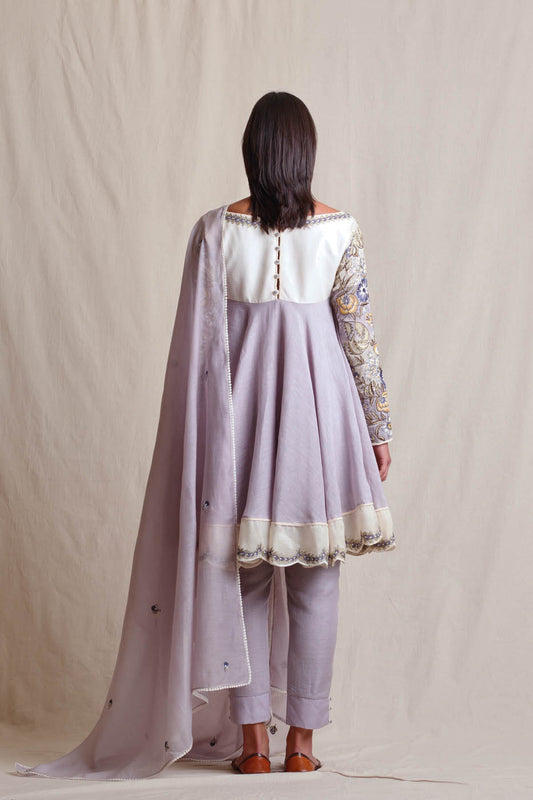 There are many types and pattern of anarkali dress that you can choose from. There are floor-length anarkali sets for formal events like weddings and receptions. Brides can choose a large anarkali for pre-wedding festivities such as mehendi or haldi, especially if they want to avoid wearing a lehenga or sari. Rich embellishments, layered flares, and sumptuous fabrics enhance the bridal look. We have many long pattern Anarklai dress sets. One of which is the very famous Kalidar sets made from raw silk and gorgeous chanderi mul mul fits too. These are so comfortable that you twirl in them. Very easy to carry and will suit most celebrated events in your life. Also, the very famous Radha Anarkali set from the Threads of Love collection is a beige raw silk, high-waisted Anarkali with multi-colored aari work, sequins, and pearl embroidery. Paired with an embroidered fuchsia Banarasi palazzo and a shaded handwoven cotton tissue dupatta.