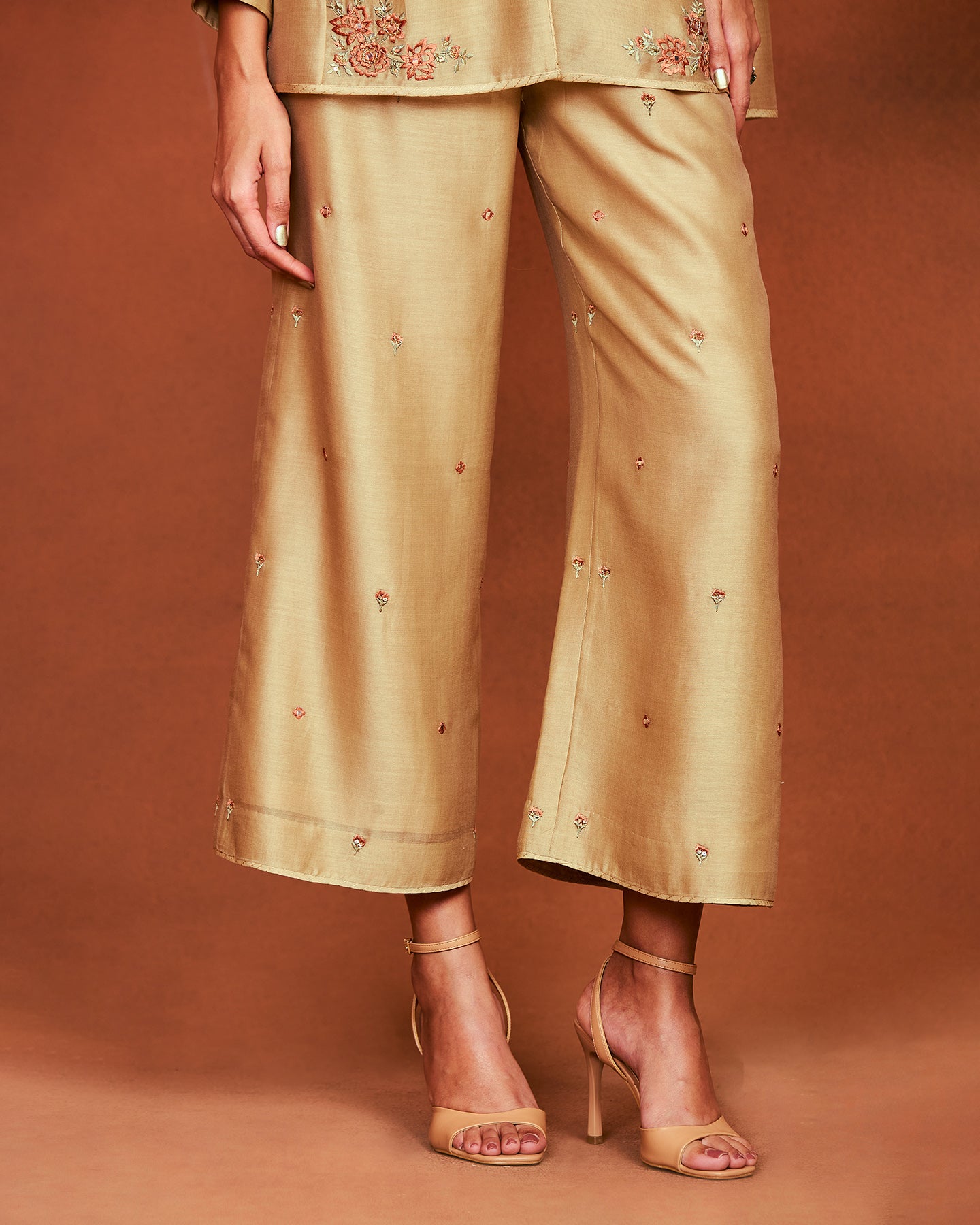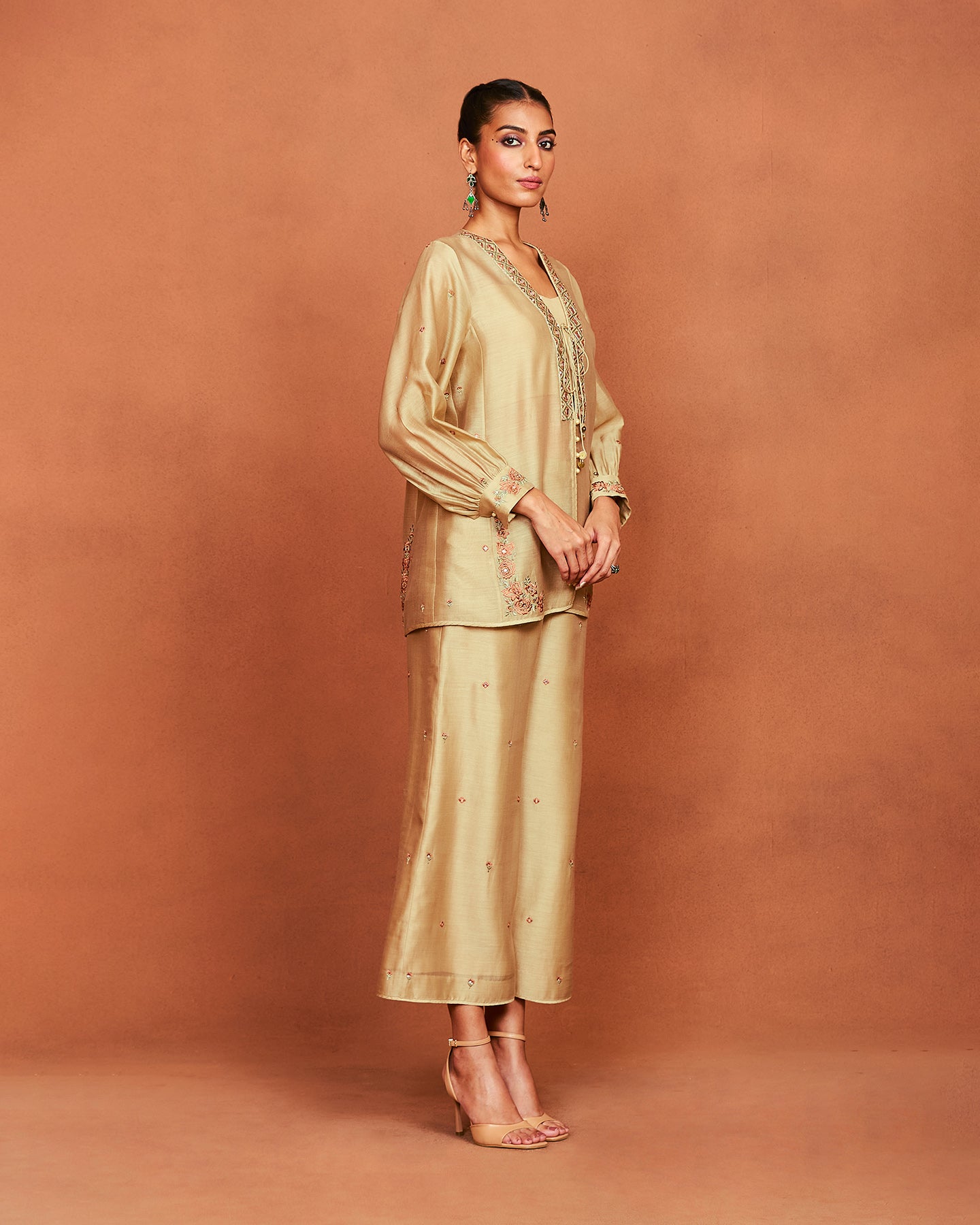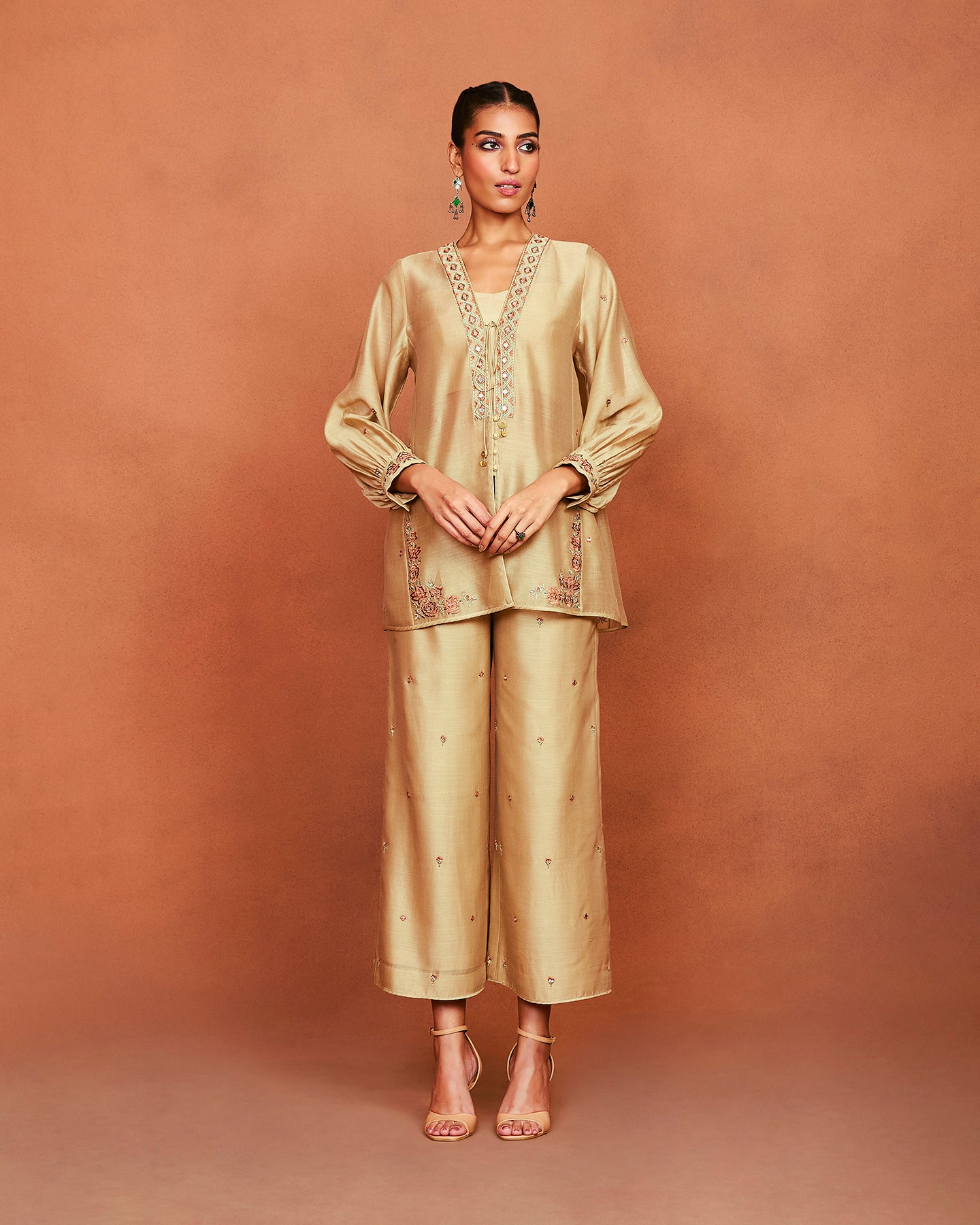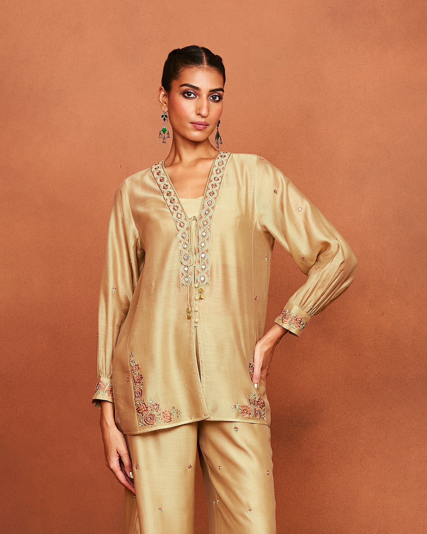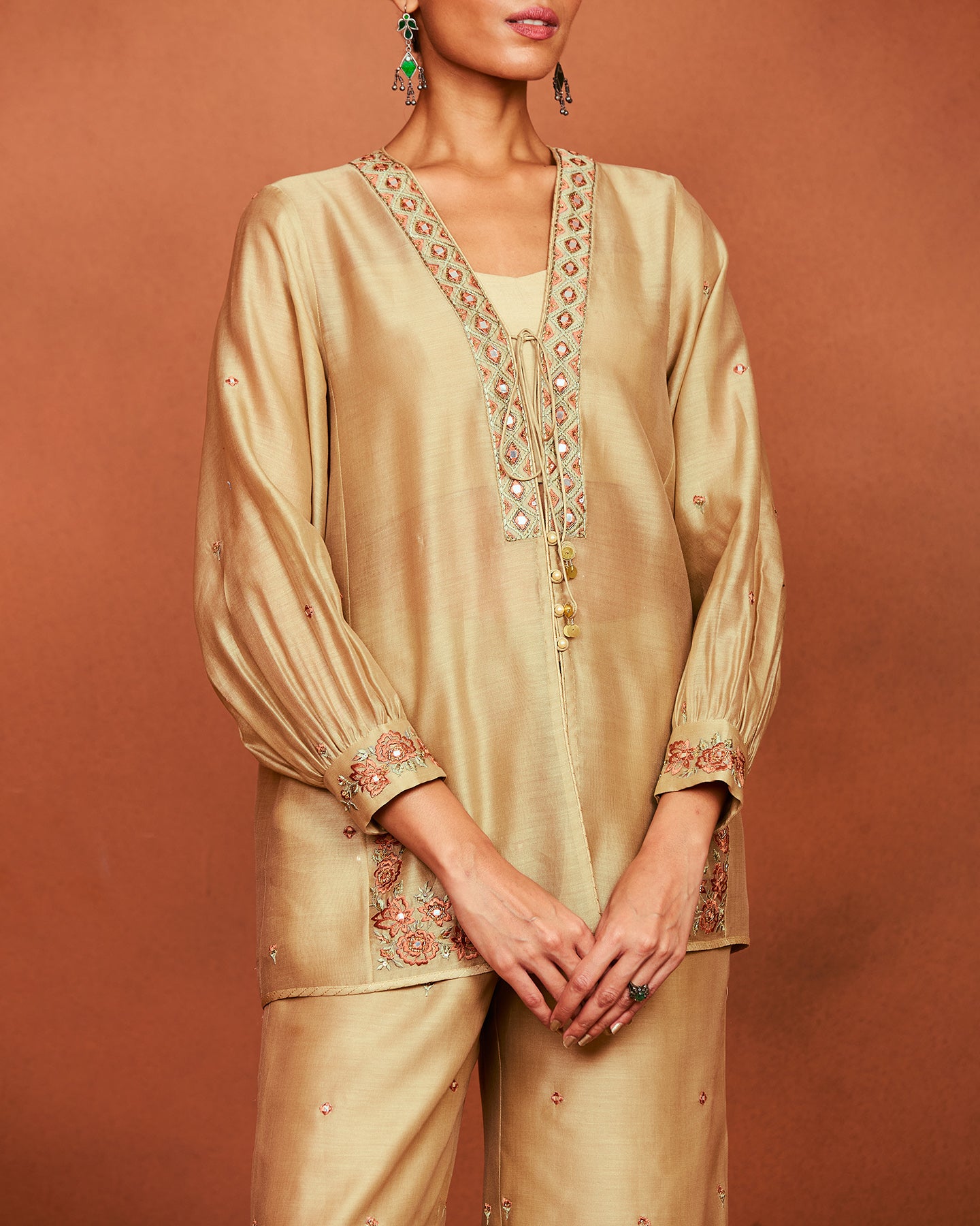 This is a beige handwoven silk chanderi co-ordinate set. The front-open top has a tassel tie at the centre, pearl buttons, and cuff sleeves. It is paired with loose fit pants featuring side pockets. The set is adorned with a tribal inspired geometric and floral pattern using multi-colour silk threads, patri work, beads, and sequins. Option of an under slip or a bustier is available to complete the look.