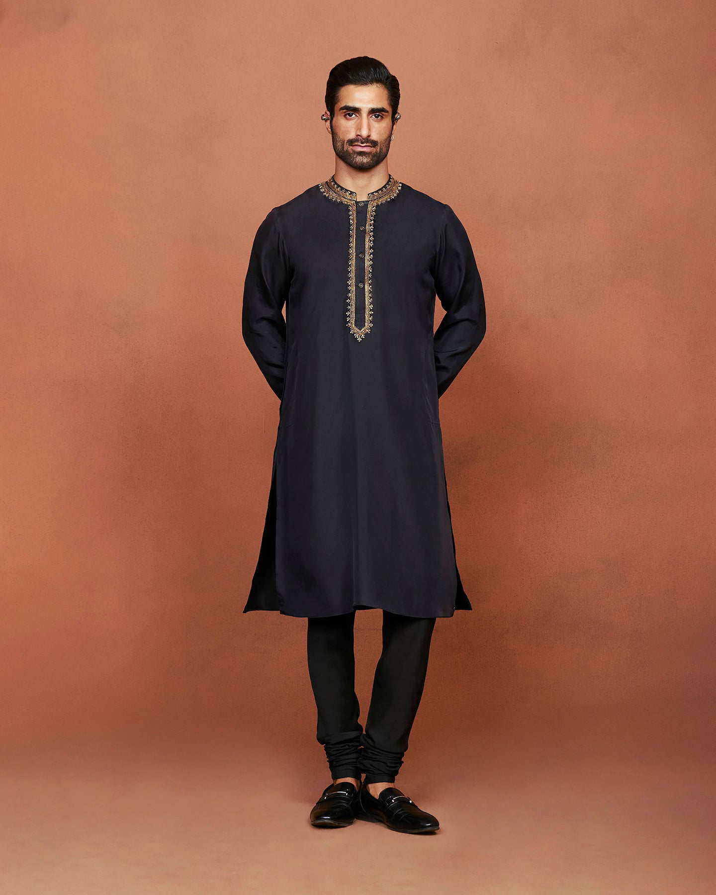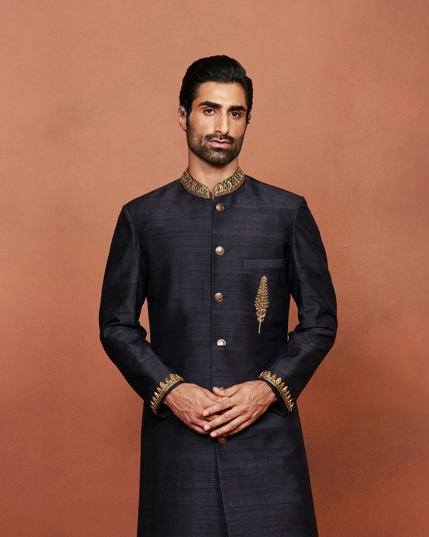 A black raw silk achkan is paired with a matching pure silk kurta and churidhar. The set is adorned with delicate embroidery handcrafted using zardozi and aari technique with zari, dabka, sequins and beads.