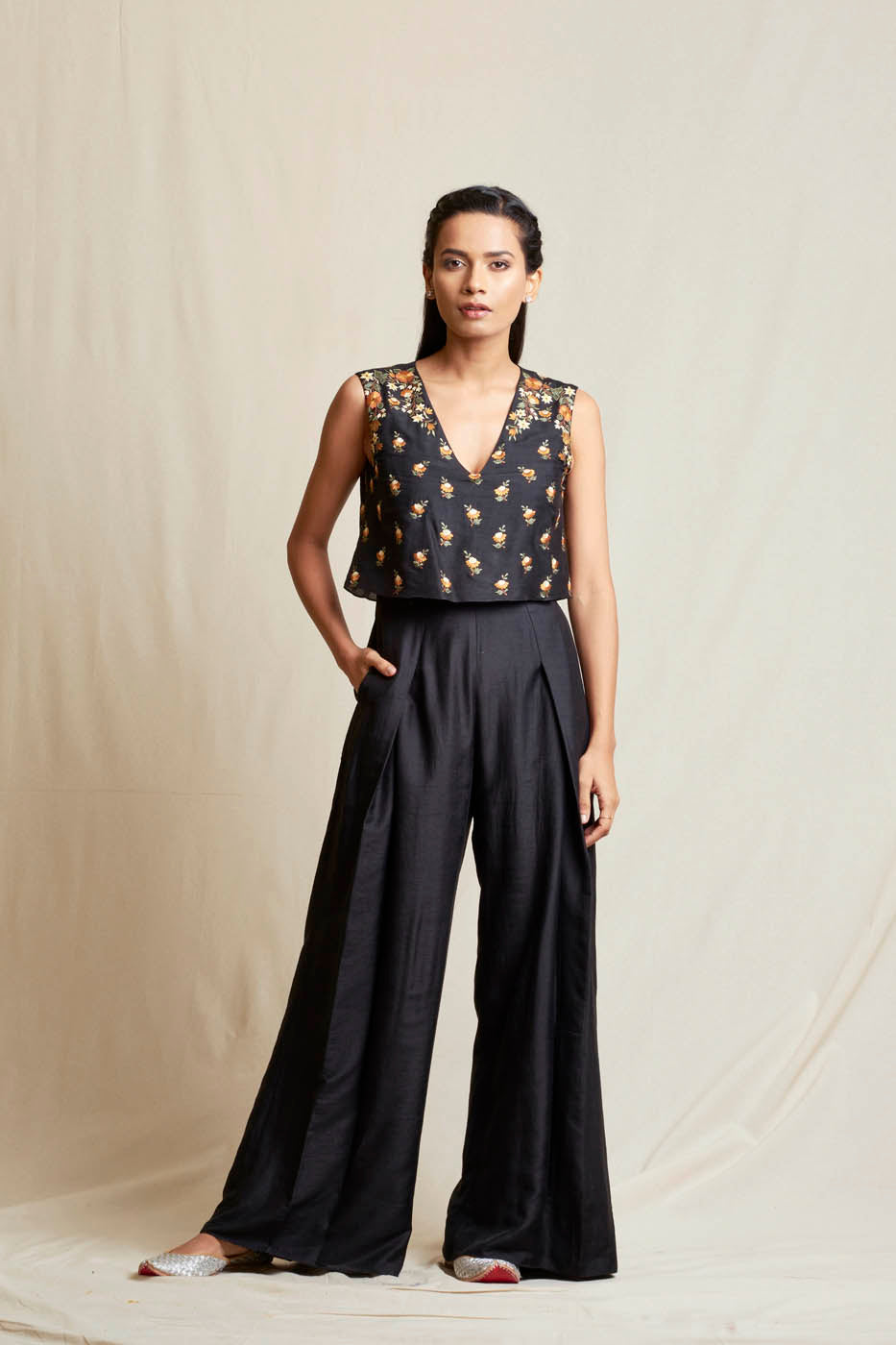 Cosmic black embroidered jumpsuit in tussar georgette with silk threadwork.