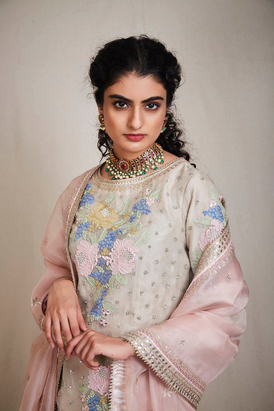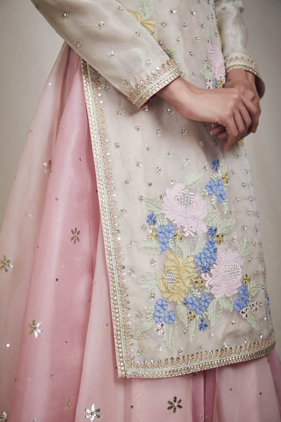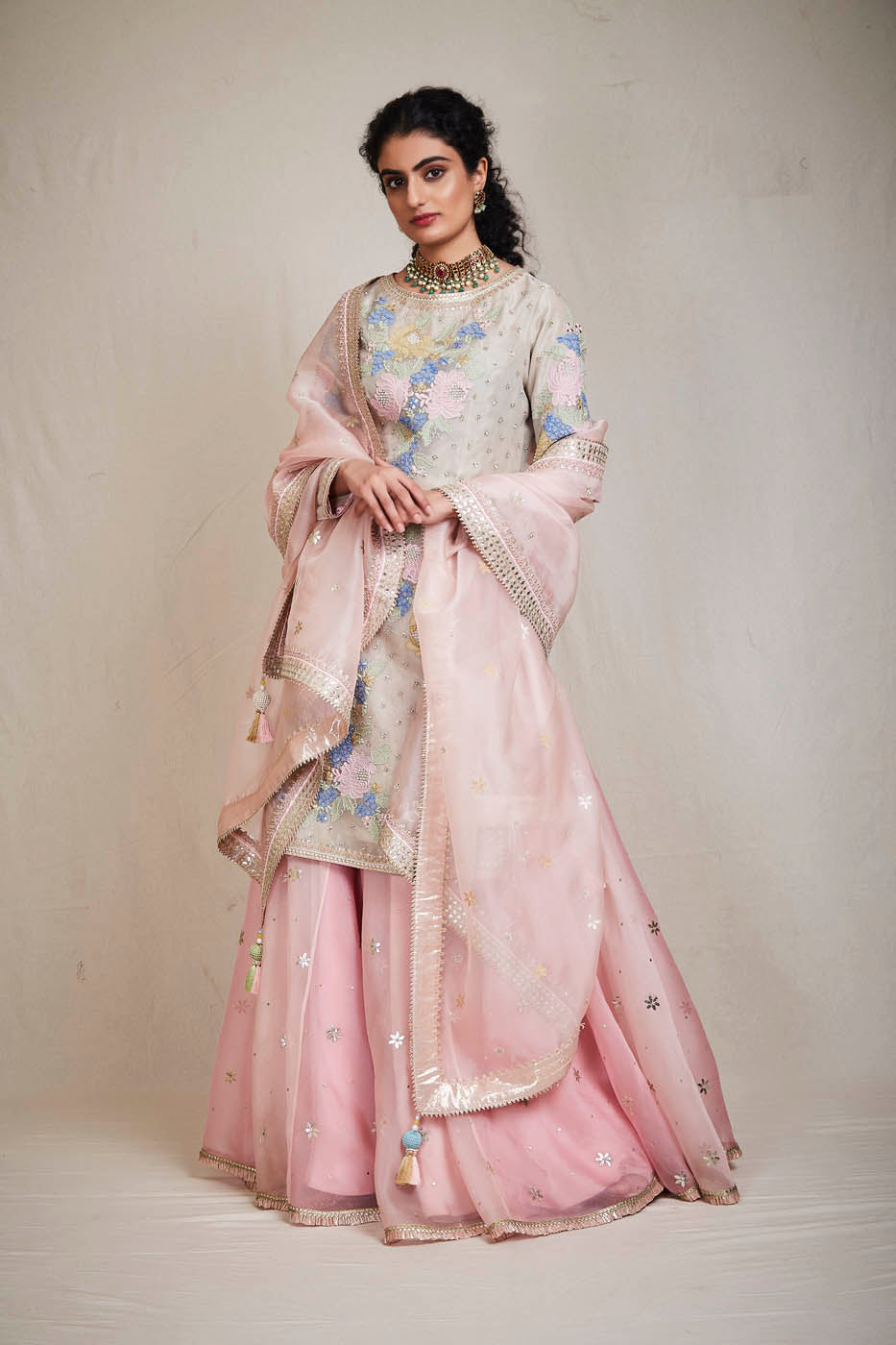 This set features a beige colour organza kurta enhanced with embroidered floral bunches. It comes with pink organza sharara and a dupatta.