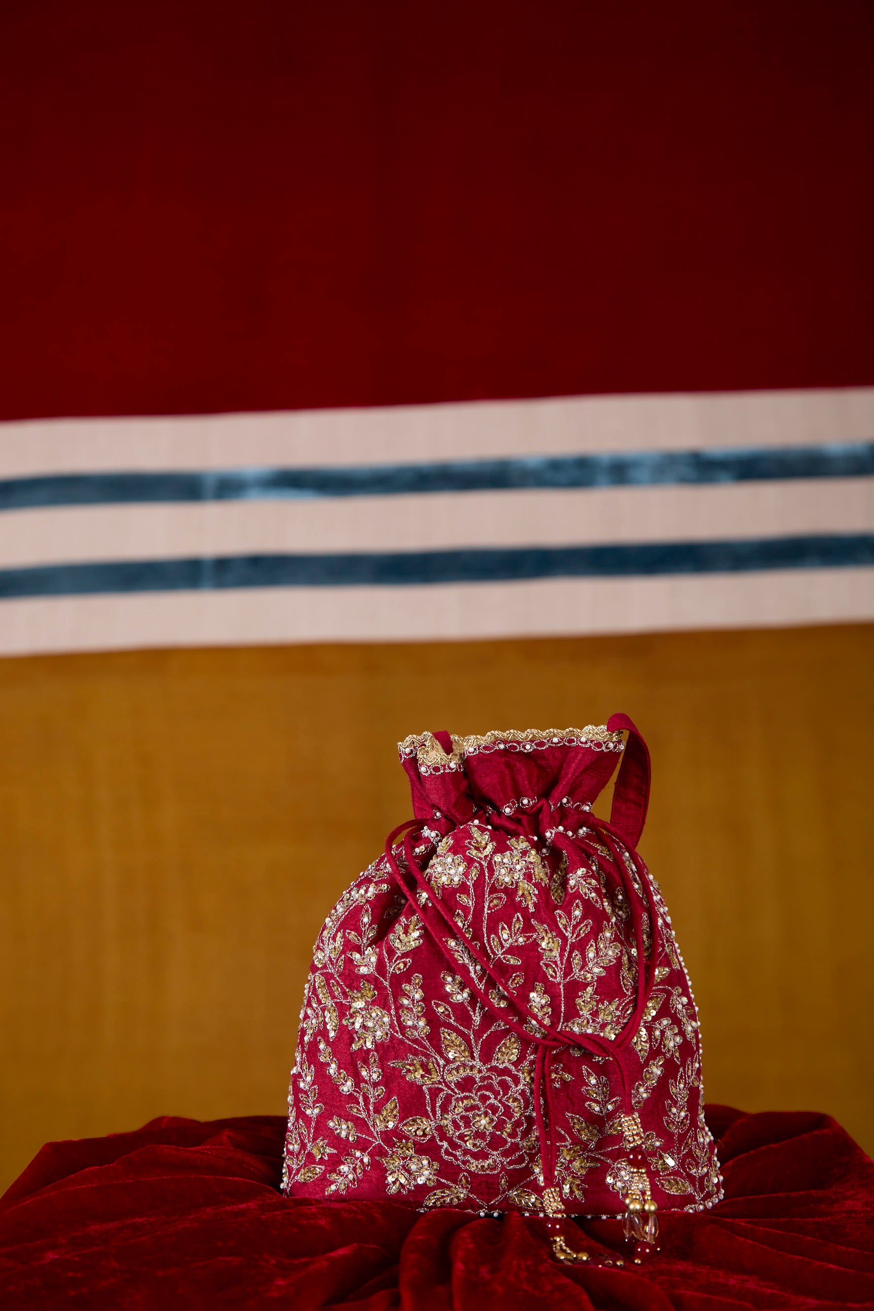 This deep red rawsilk potli features intricate gold zari and silk thread embroidery, adorned with gold sequins, beads, pearls and lace. (Dimensions- H-10.5, L-9.5, W-3.5 Inches)