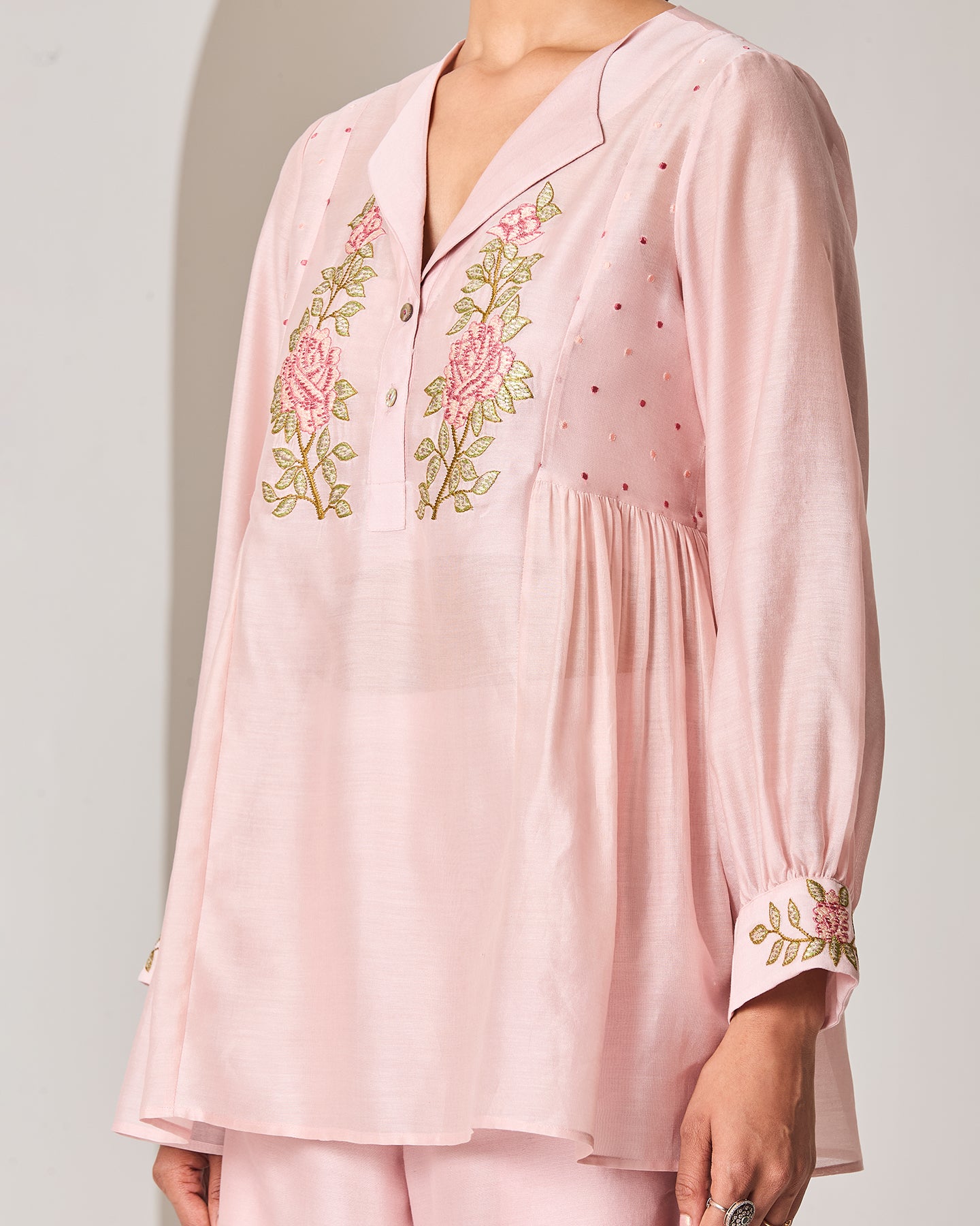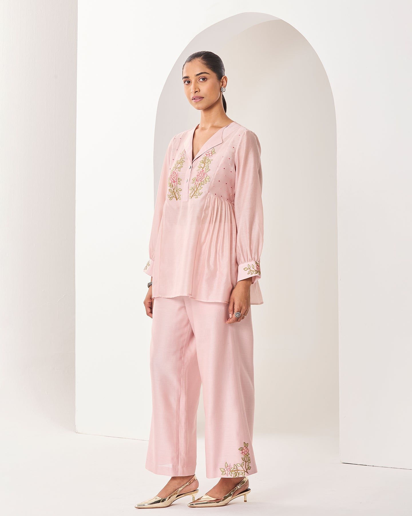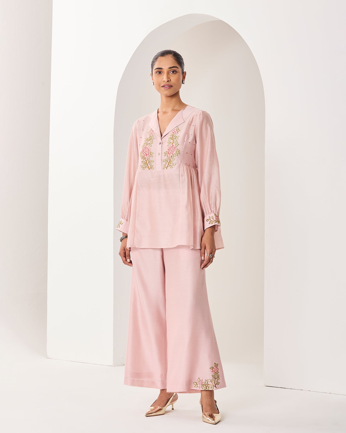 This is a pastel pink handwoven silk chanderi co-ordinate set. The top features a buttoned lapel collar, full-length sleeves with gathered cuffs, and sideseam gathers. It is paired with flared pants featuring functional pockets. The ensemble is adorned with multi-coloured silk thread rose flower motifs. Option of an underslip or a bustier is available to complete the look.