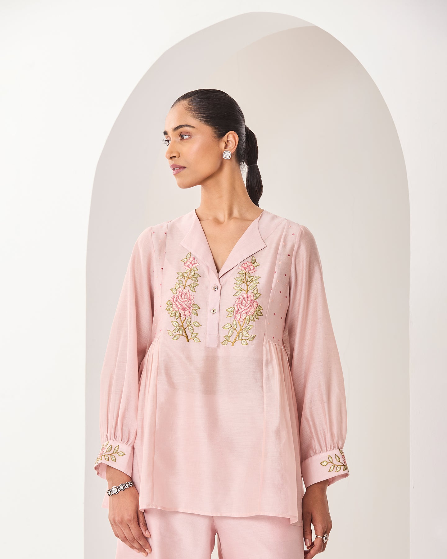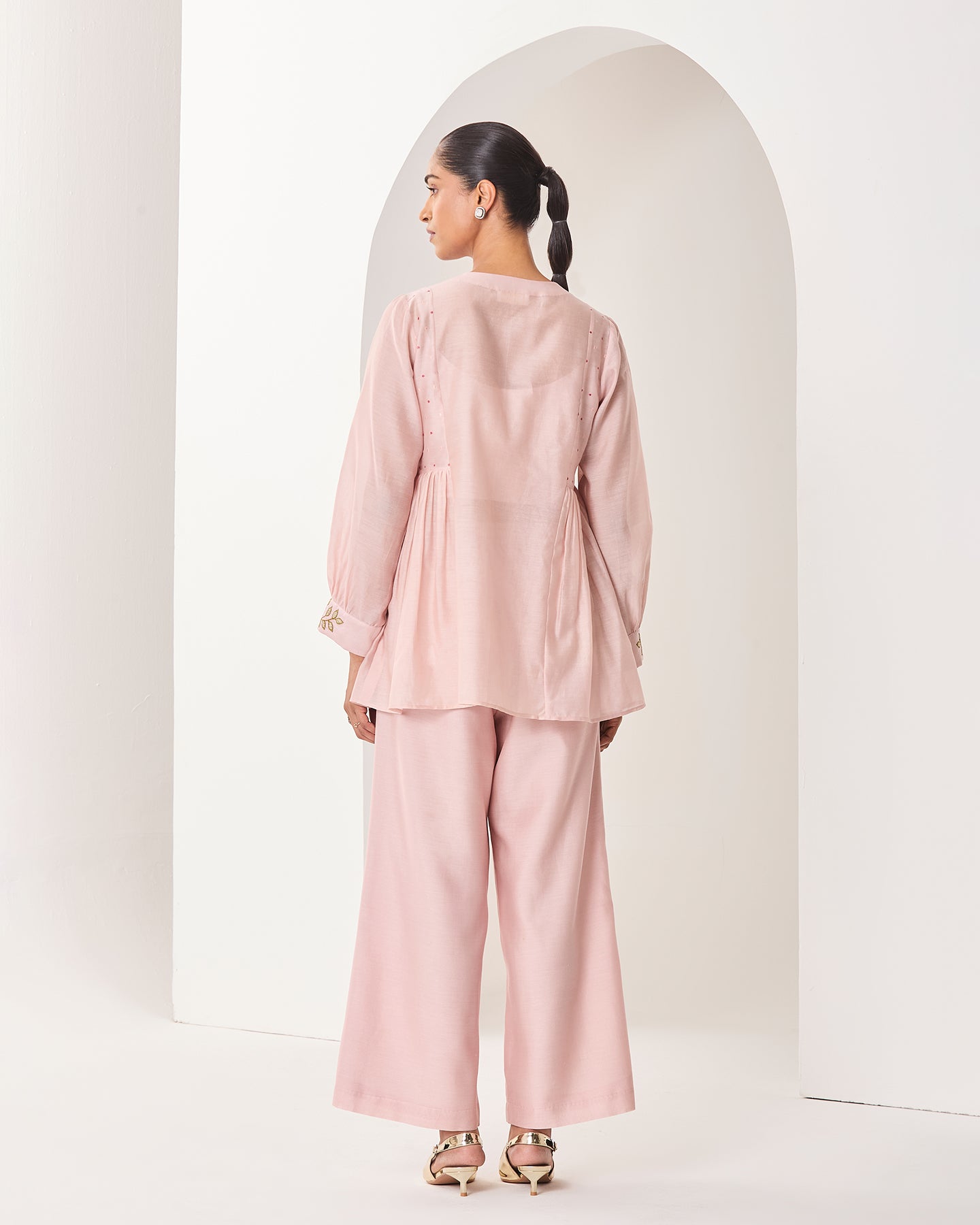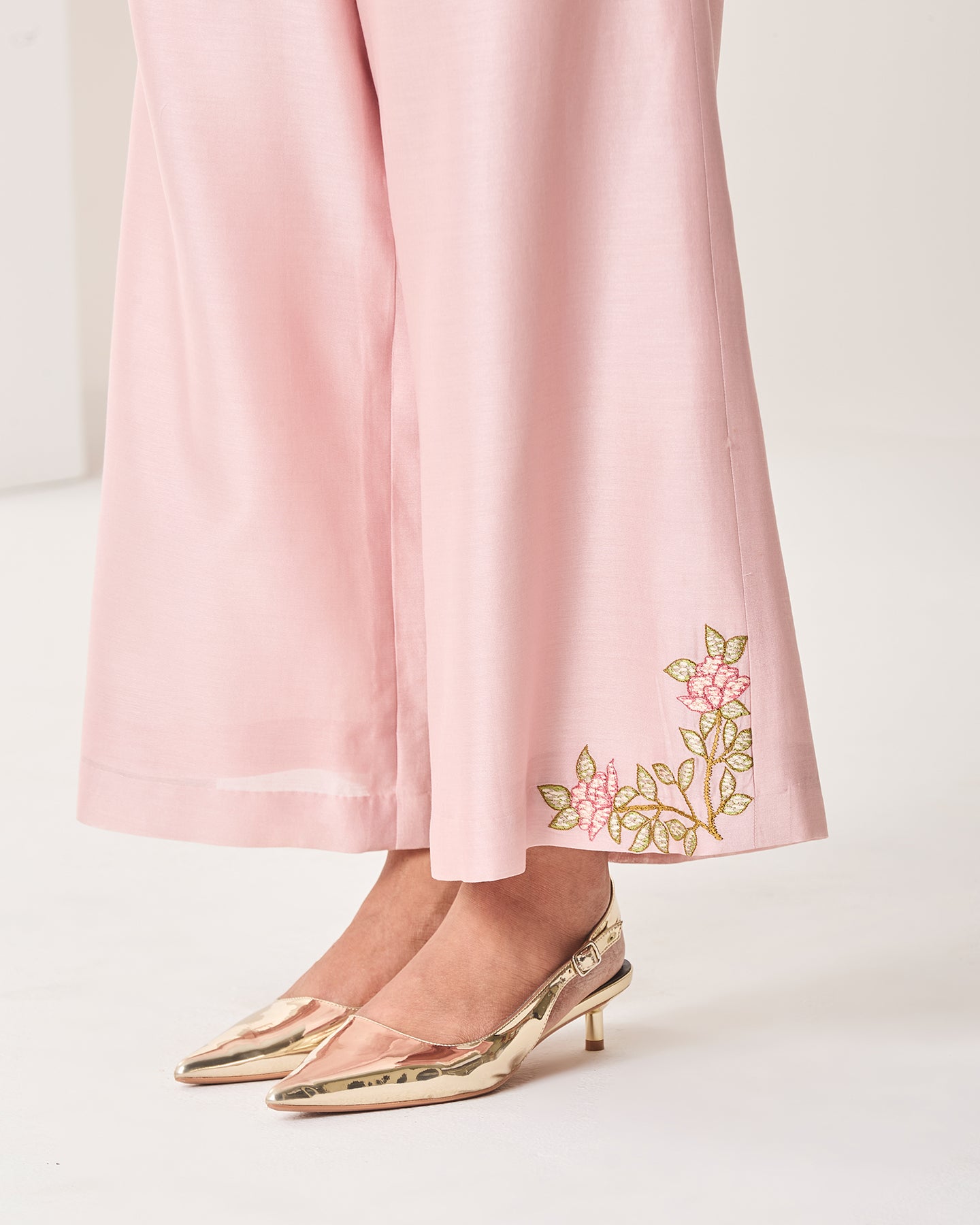 This is a pastel pink handwoven silk chanderi co-ordinate set. The top features a buttoned lapel collar, full-length sleeves with gathered cuffs, and sideseam gathers. It is paired with flared pants featuring functional pockets. The ensemble is adorned with multi-coloured silk thread rose flower motifs. Option of an underslip or a bustier is available to complete the look.