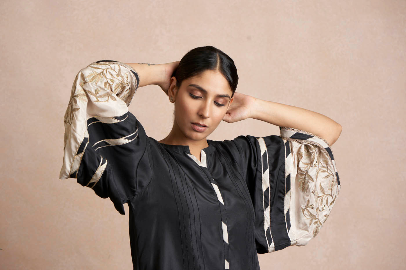 Mid length color blocked and embroidered tunic, paired with an embroidered beige pant.