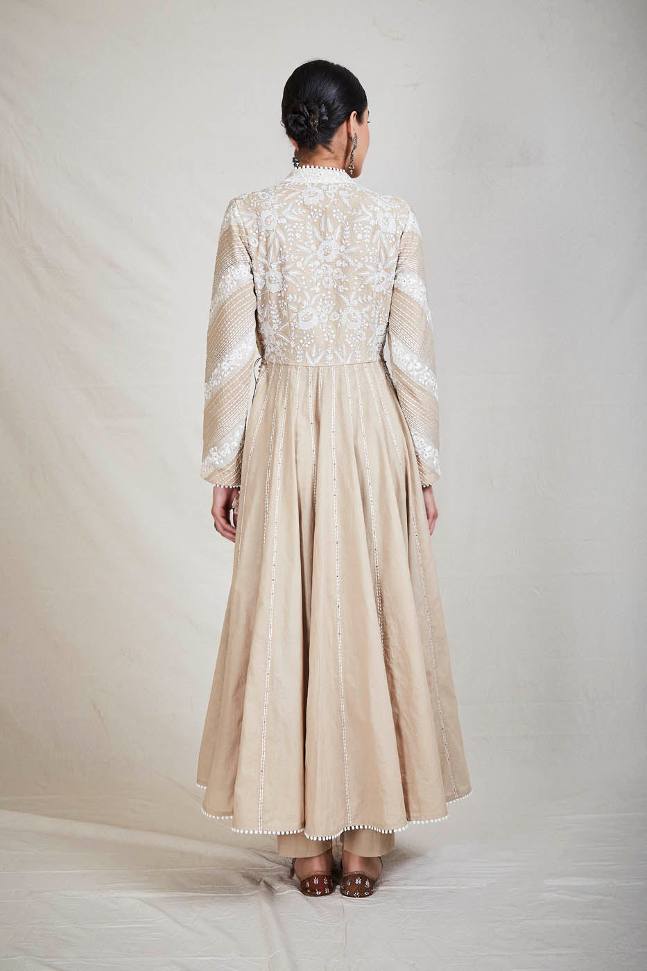 This is a beige colour cotton anarkali enhanced with embroidered floral motifs. It comes with a pair of cotton pants and a mul dupatta.