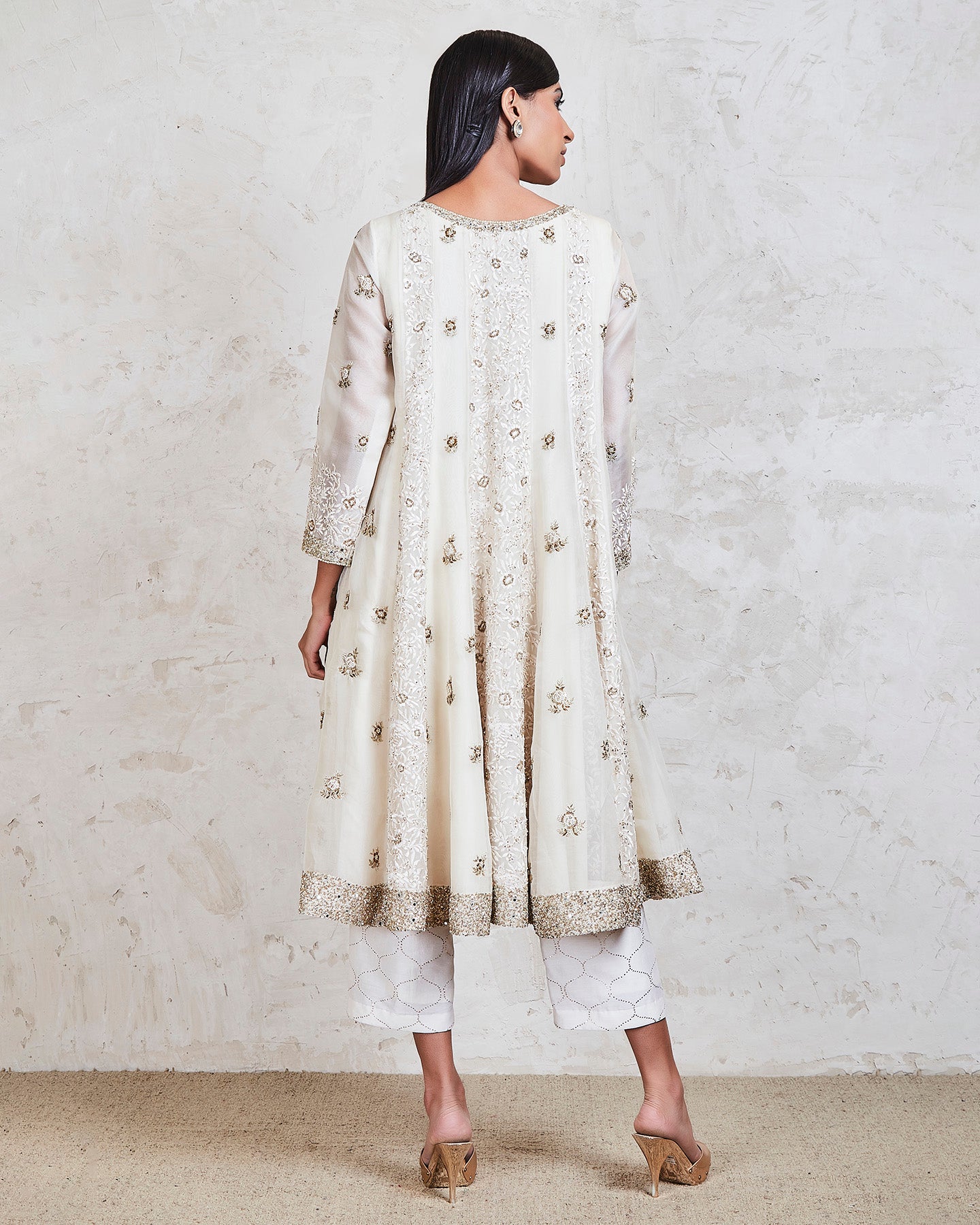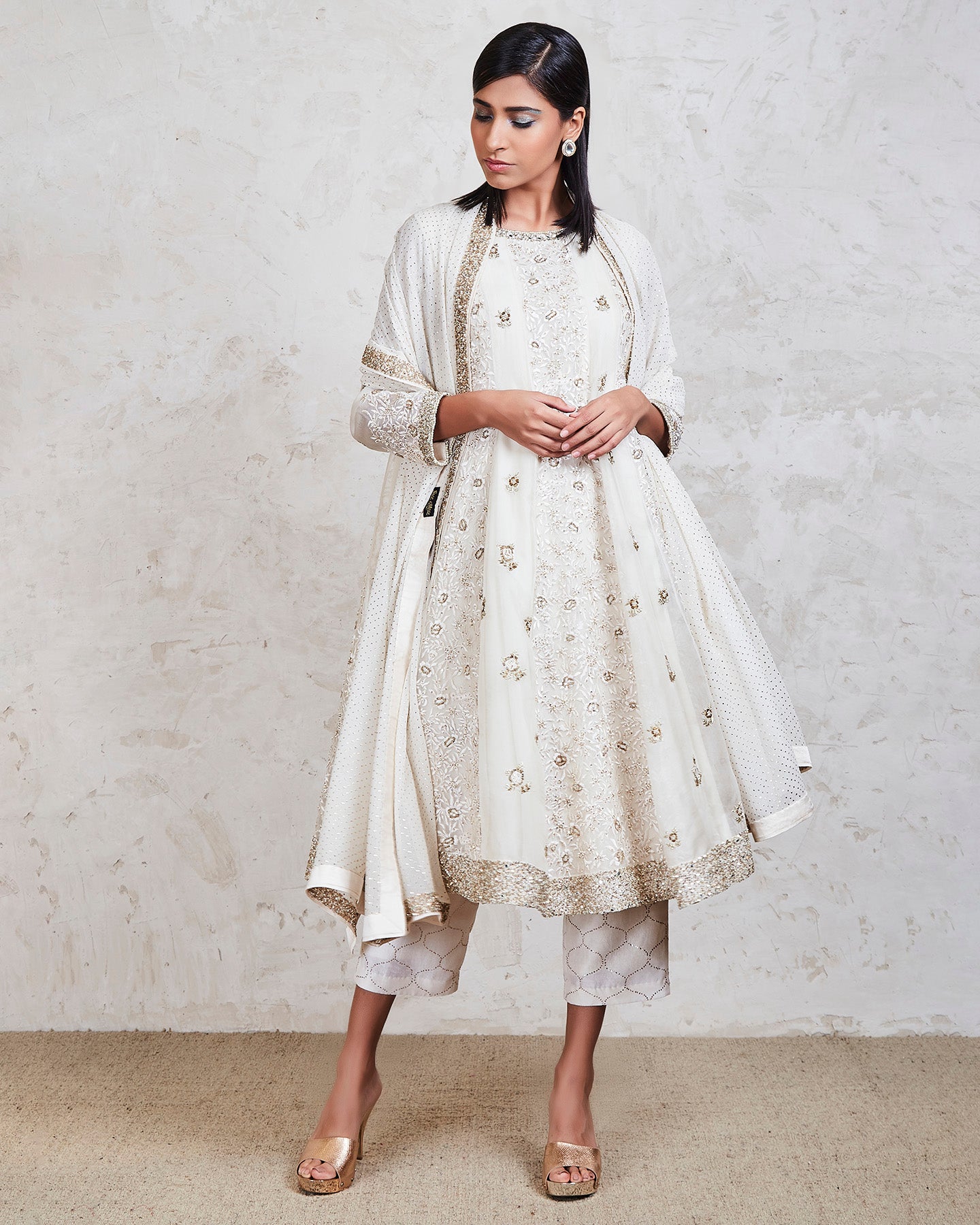 This off-white organza kurta set has been accentuated with Parsi gara embroidery. It comes with a chiffon mukaish dupatta.