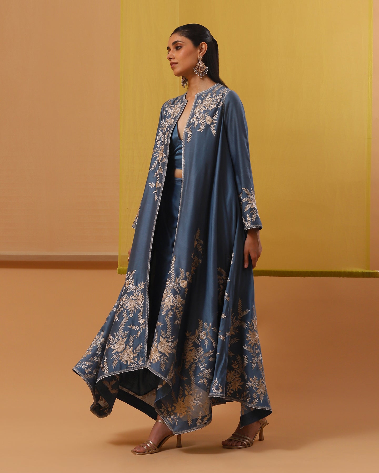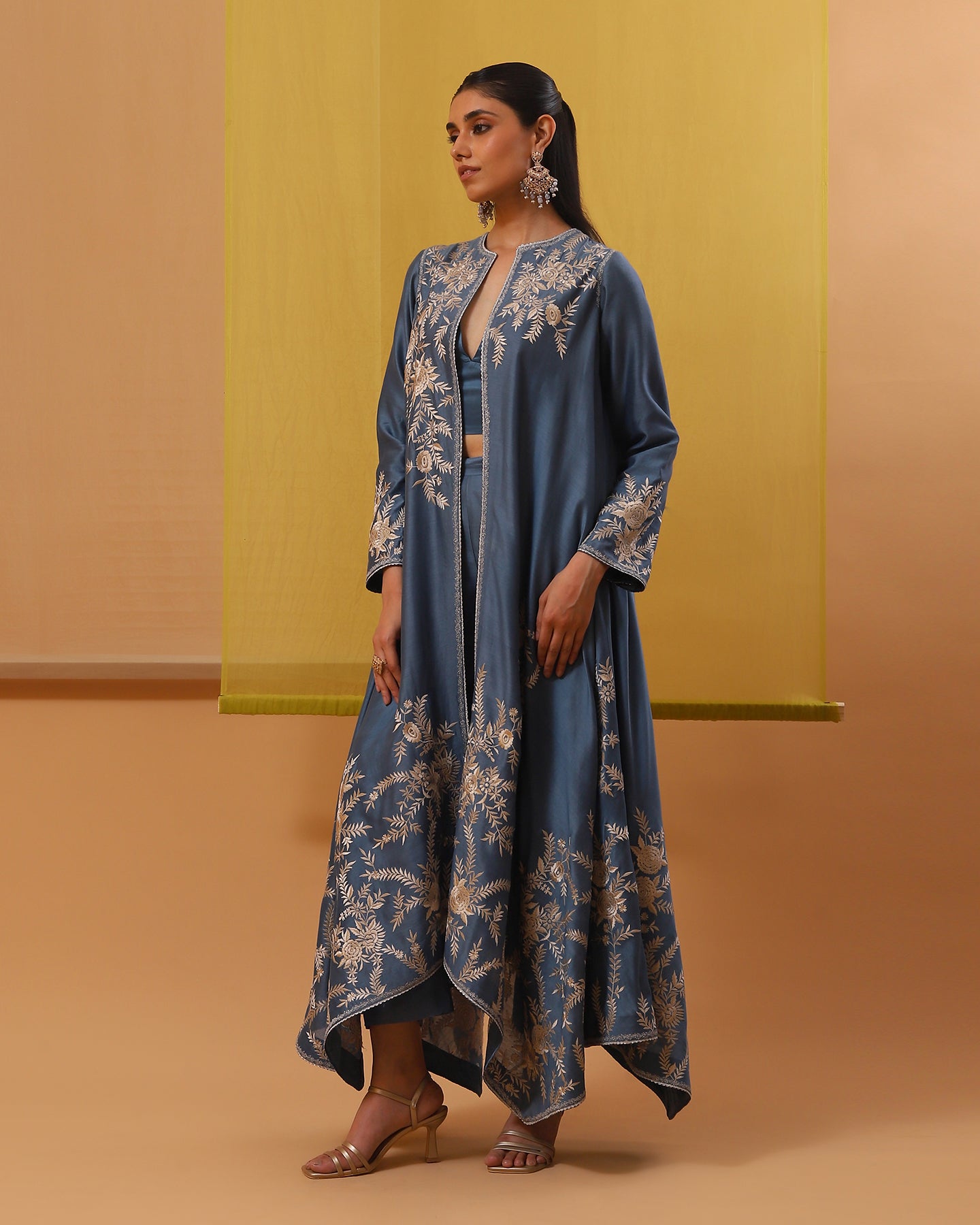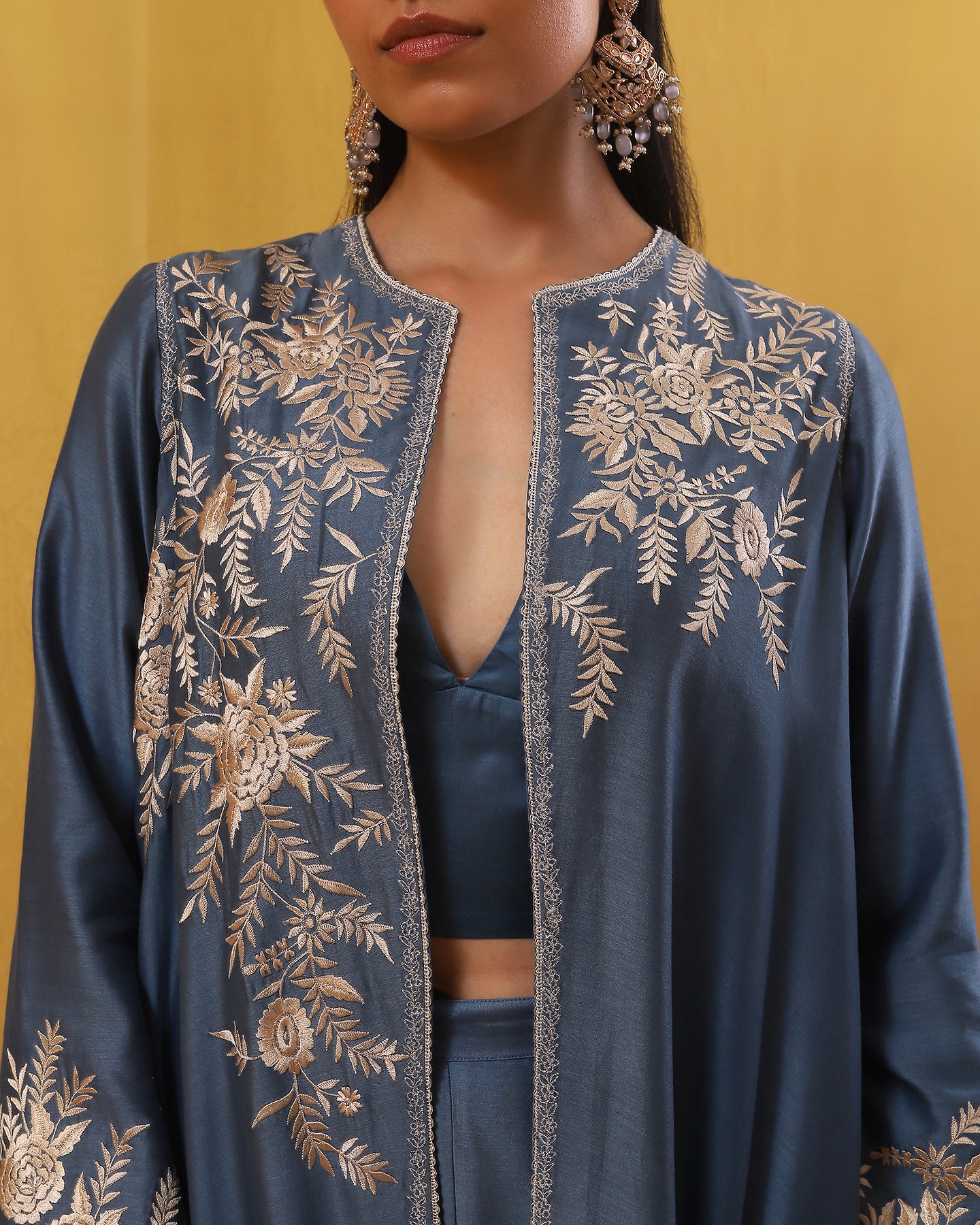 Introducing our enchanting blue handwoven silk chanderi jacket set, a masterpiece of allure and sophistication. The asymmetrical cape-style jacket opens in the front and has full sleeves. It is adorned with delicate off-white and beige gara embroidery, intertwining silk threads to weave tales of elegance. Each hemline is kissed by silver zari work, casting a spell of opulence. Paired with matching luxurious handwoven silk chanderi straight-fit pants and a stylish pure silk satin bustier. This ensemble is a symphony of romance and timeless beauty, perfect for those who wish to dance through life in exquisite style.