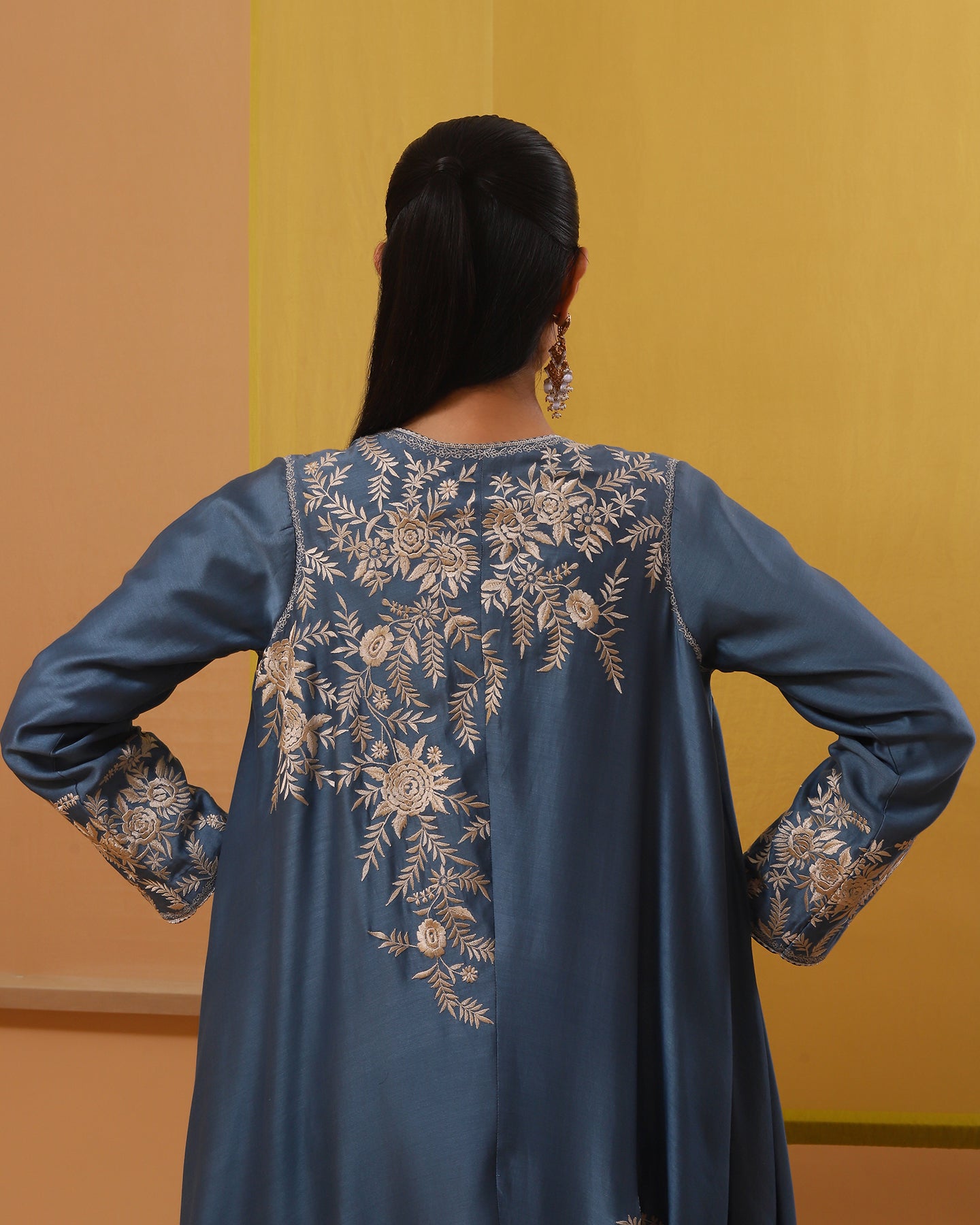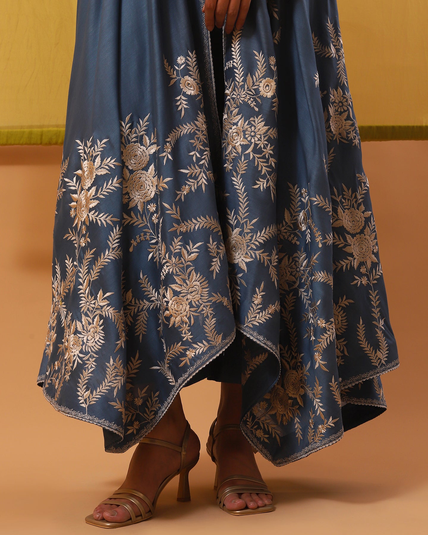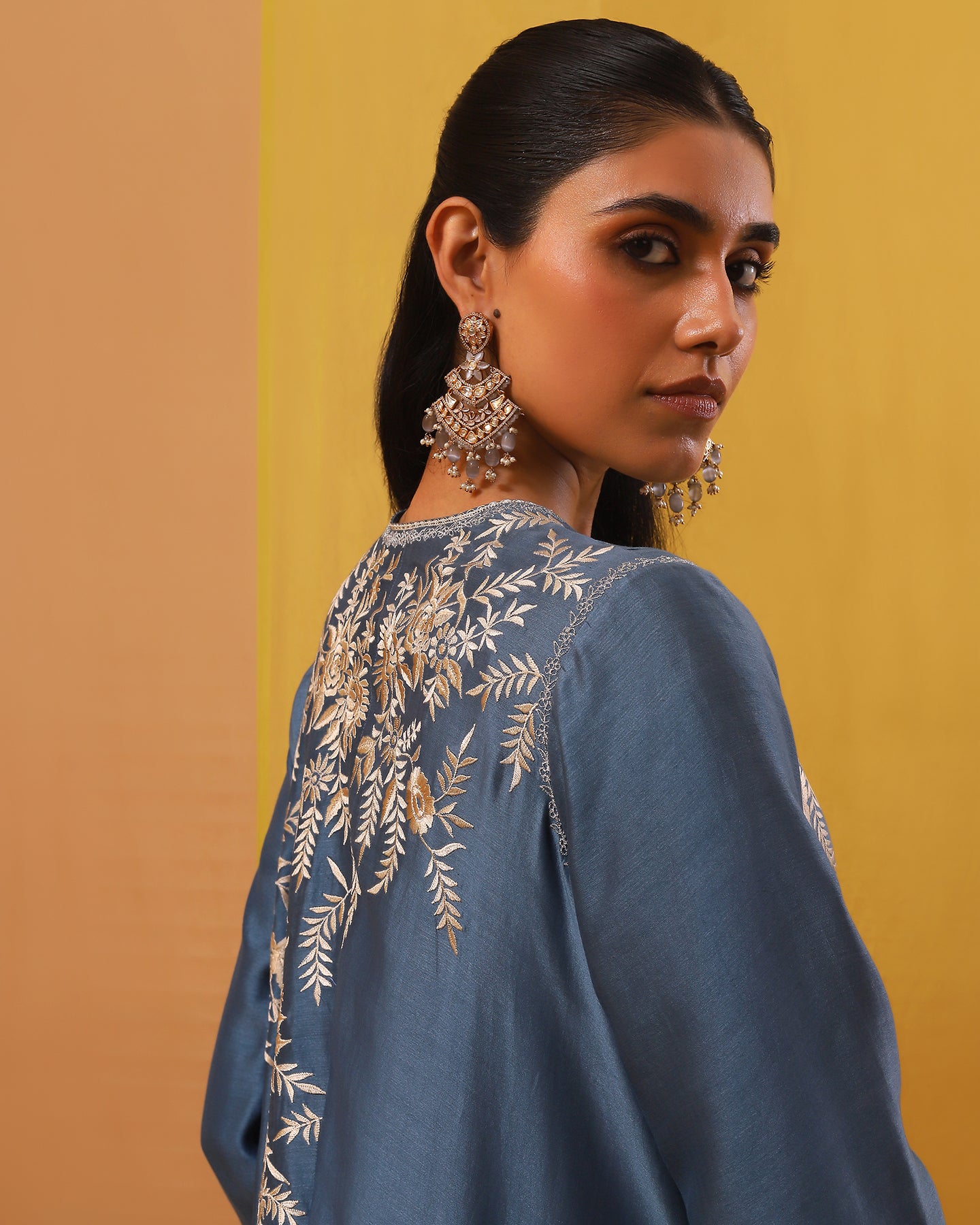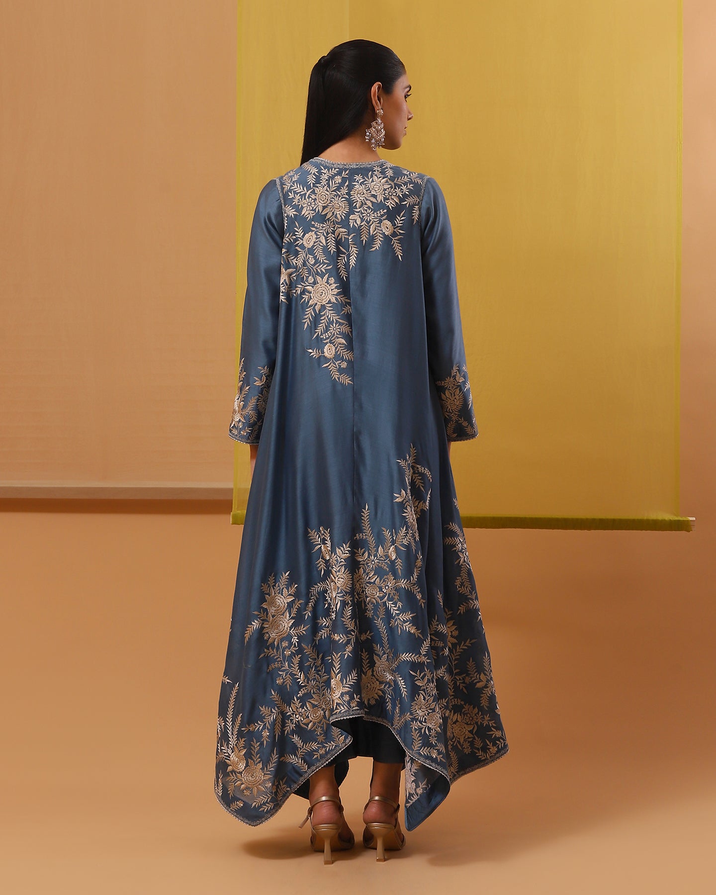 Introducing our enchanting blue handwoven silk chanderi jacket set, a masterpiece of allure and sophistication. The asymmetrical cape-style jacket opens in the front and has full sleeves. It is adorned with delicate off-white and beige gara embroidery, intertwining silk threads to weave tales of elegance. Each hemline is kissed by silver zari work, casting a spell of opulence. Paired with matching luxurious handwoven silk chanderi straight-fit pants and a stylish pure silk satin bustier. This ensemble is a symphony of romance and timeless beauty, perfect for those who wish to dance through life in exquisite style.
