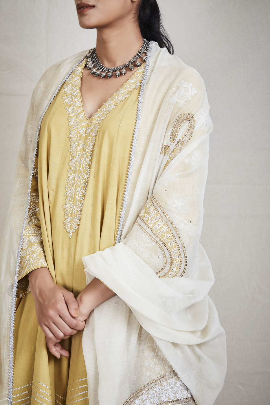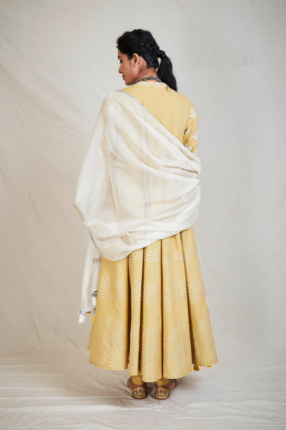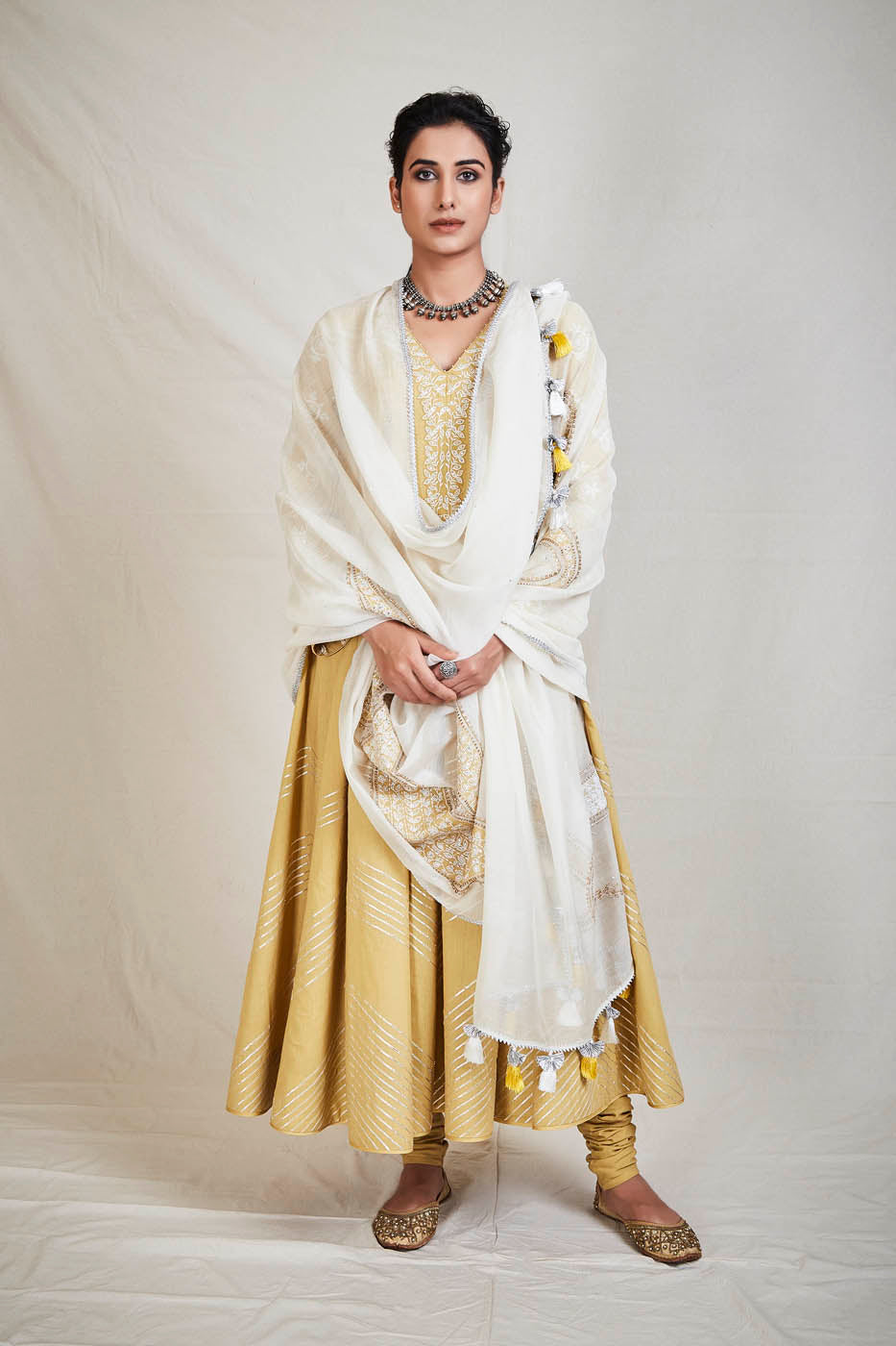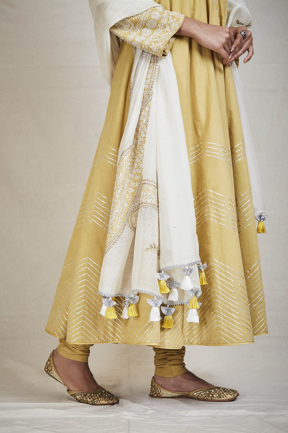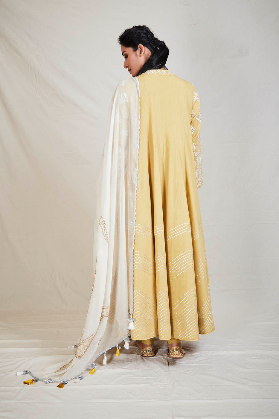 This is a goldenrod colour cotton anarkali embroidered with floral and paisely butis. It comes a pair of cotton churidar and a mul dupatta.