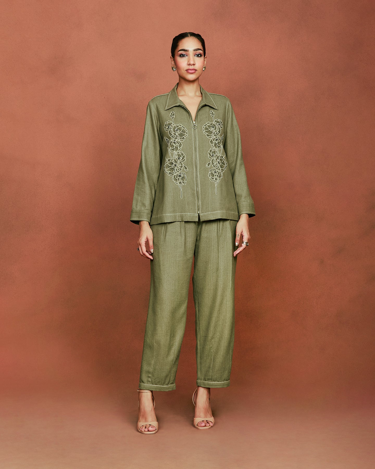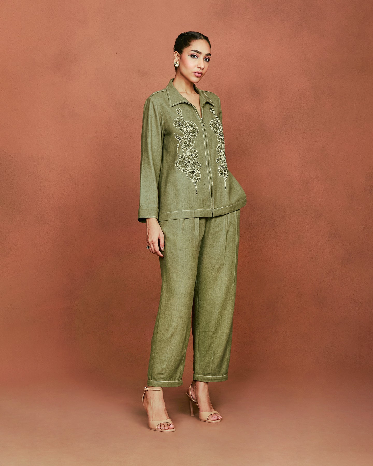 This is an olive green matka silk co-ordinate set. The shirt has a classic shirt collar, front zip, and cuff sleeves. Paired with carrot fit pants featuring front pleats and side pockets. The set is adorned with floral bunch motifs using dori work, silk threads, cotton threads, and beads.