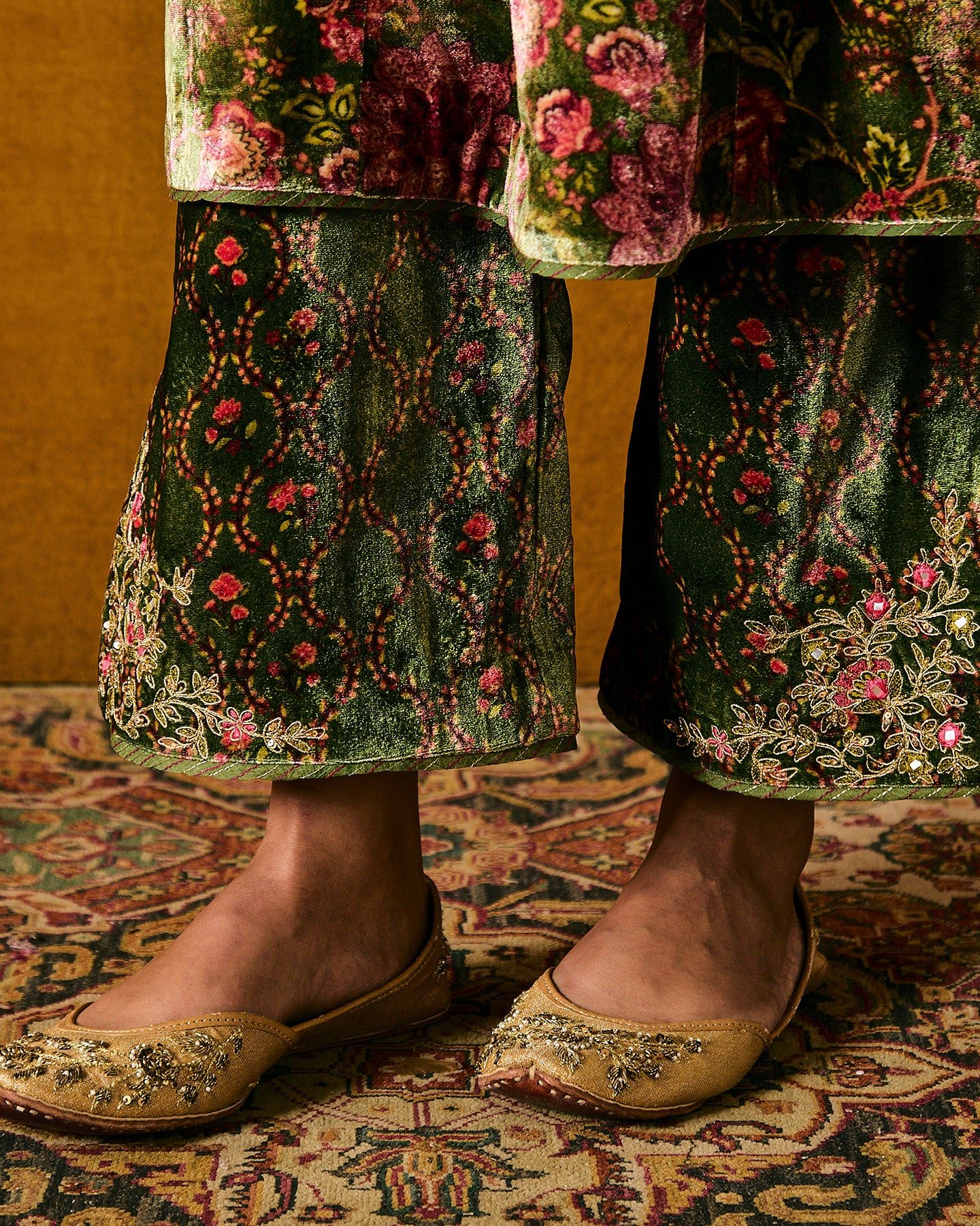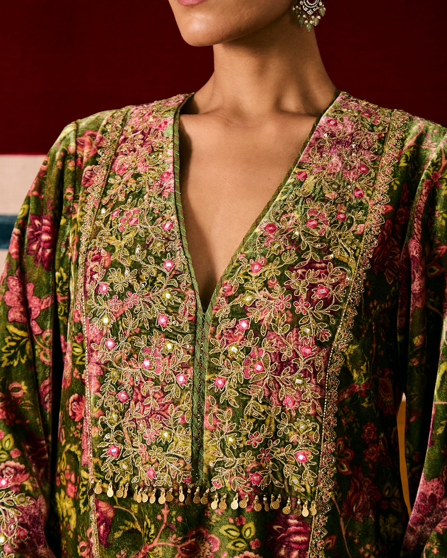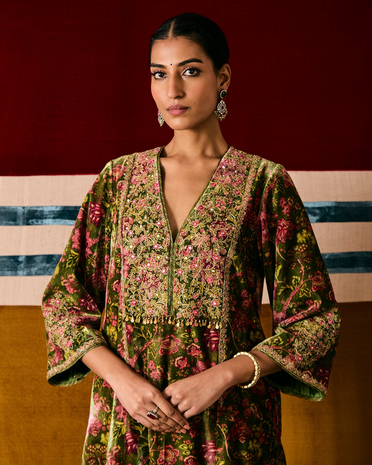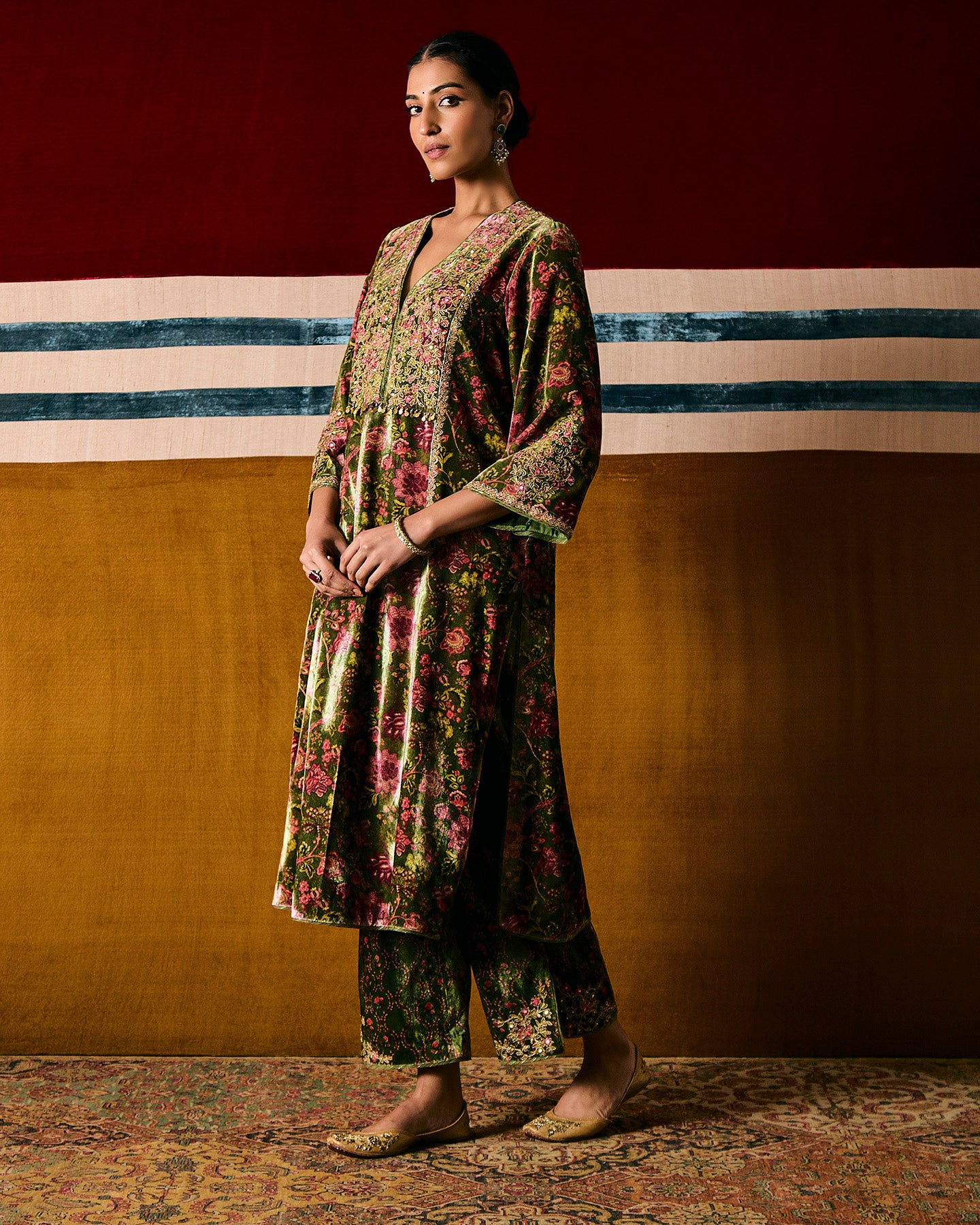 This is a green silk velvet kurta set featuring an exclusive in-house tapestry-print. The panelled kurta has a V-neckline, three-quarter sleeves, pockets and is paired with straight-fit pants. The set is adorned with beautiful floral motifs embroidered using gold dori, multi-colour silk threads, patri work, sequins and beads. The look of the set is further enhanced with matching silk organza piping.