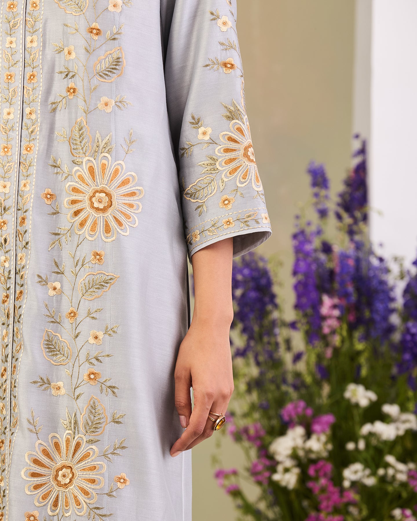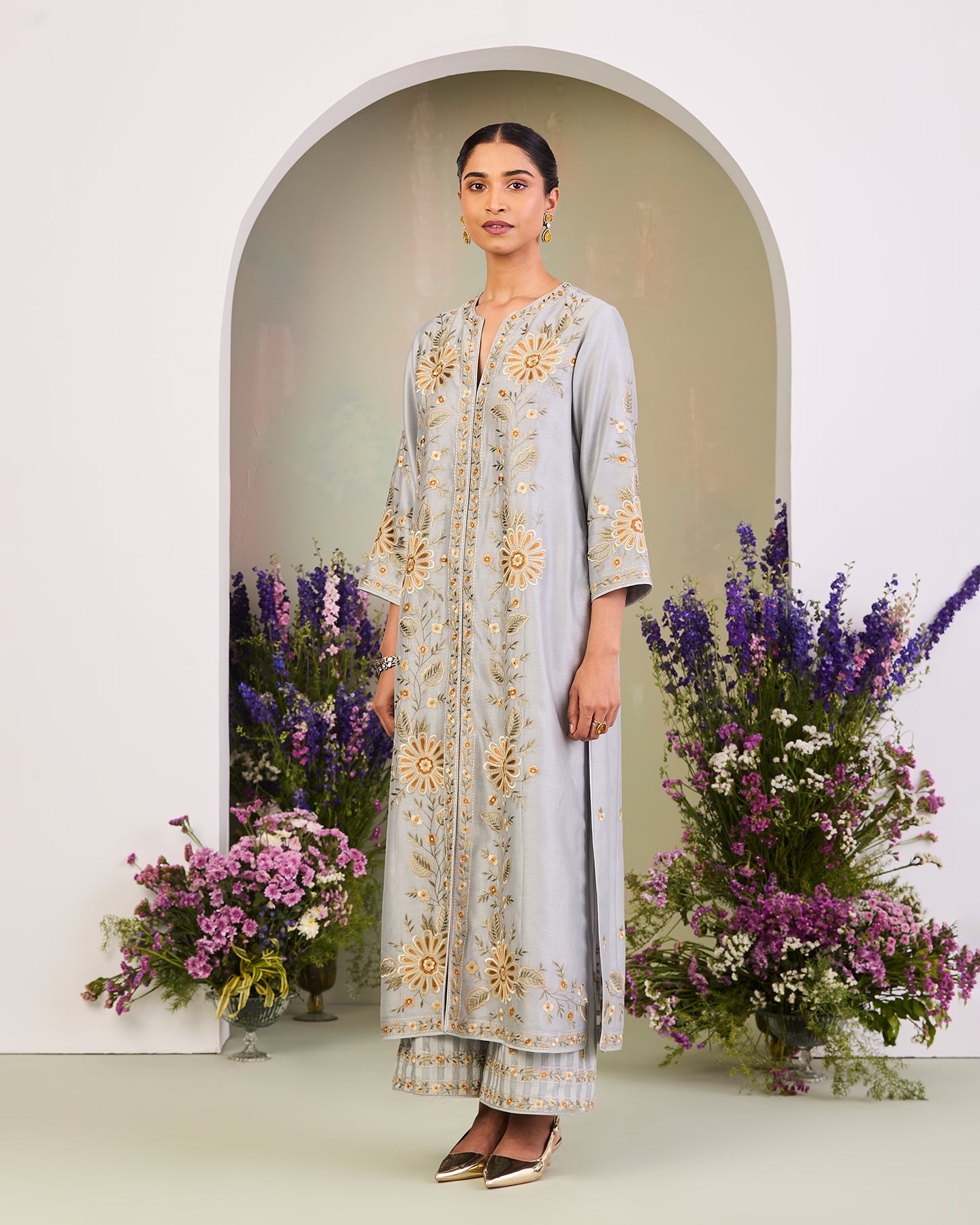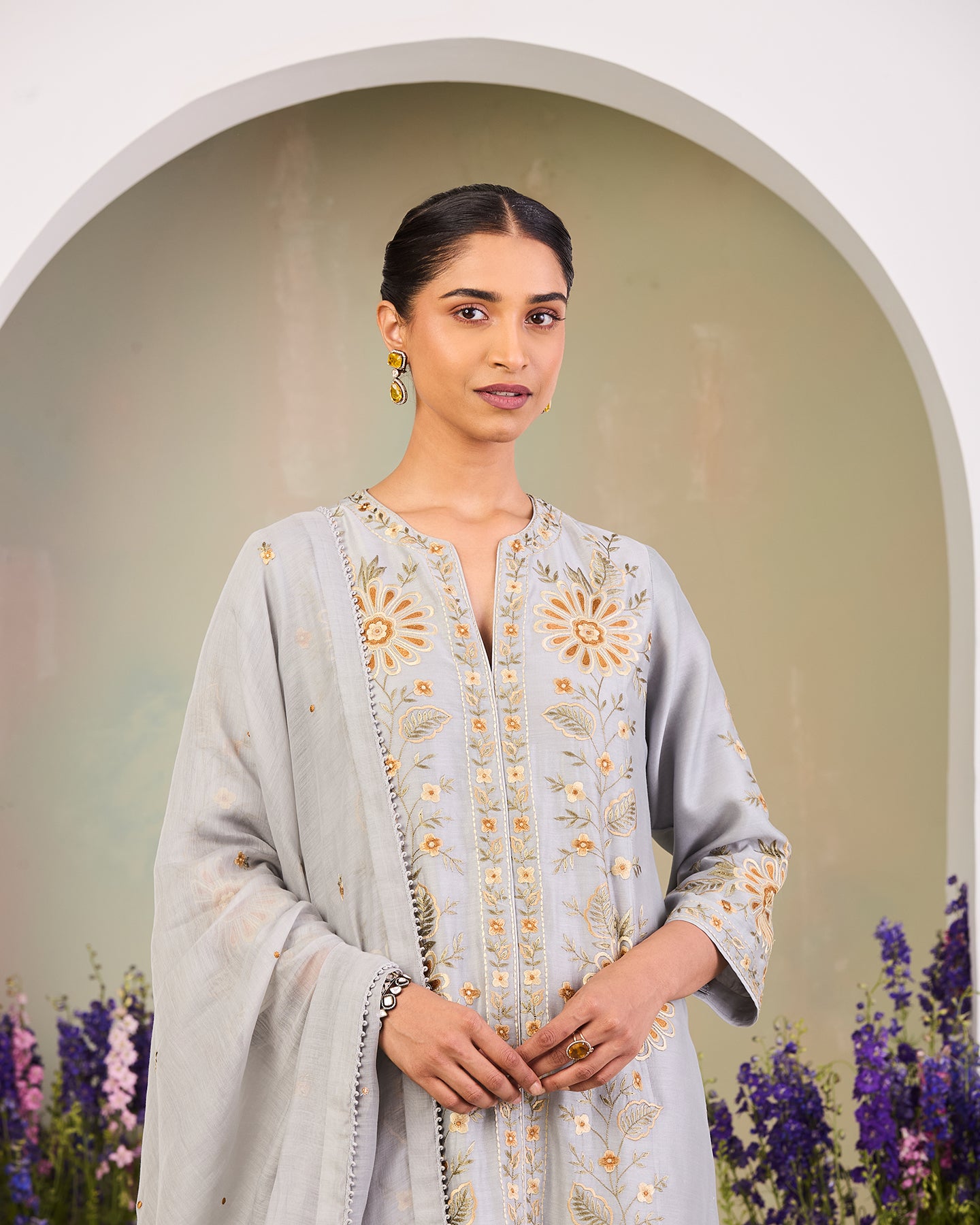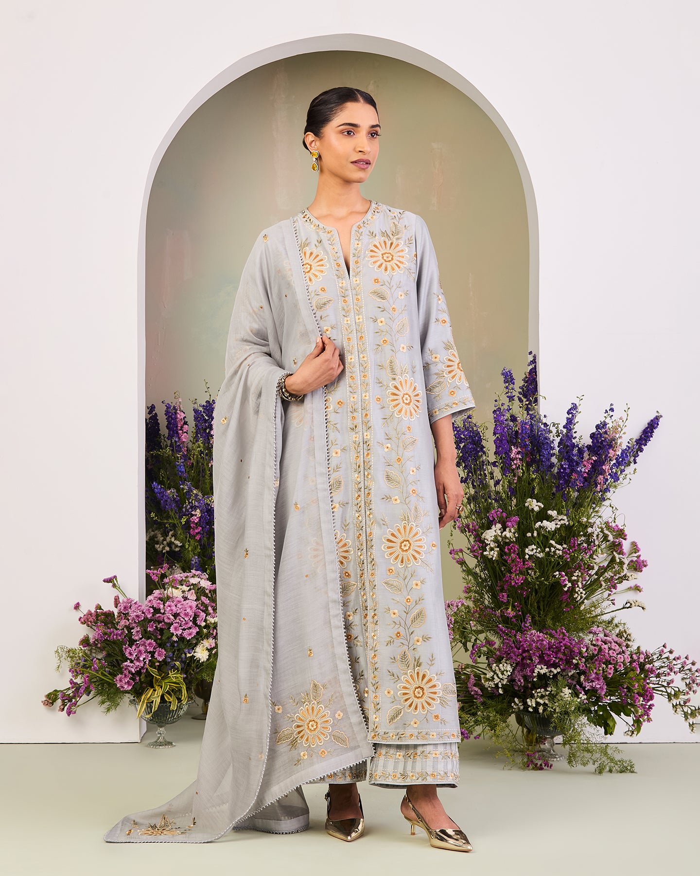 This is an ice-blue handwoven silk chanderi long kurta with a round neck, small slit in front and three-quarter sleeves. It comes with a pair of matching loose-fit pants and a handwoven chanderi mulmul dupatta. The set is decorated with floral motifs embroidered using multi-colour silk threads. Finished with matching piping and lace detailing.