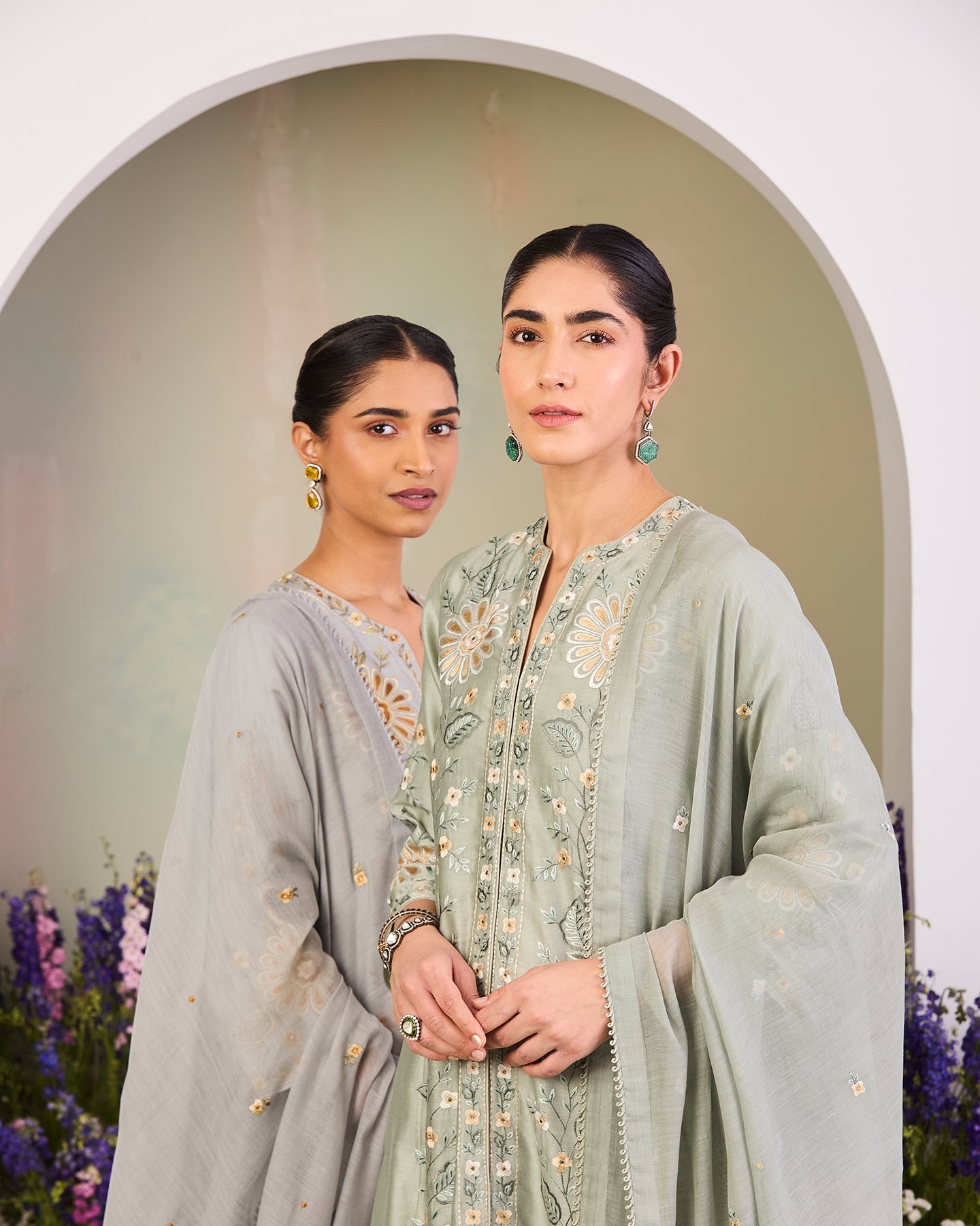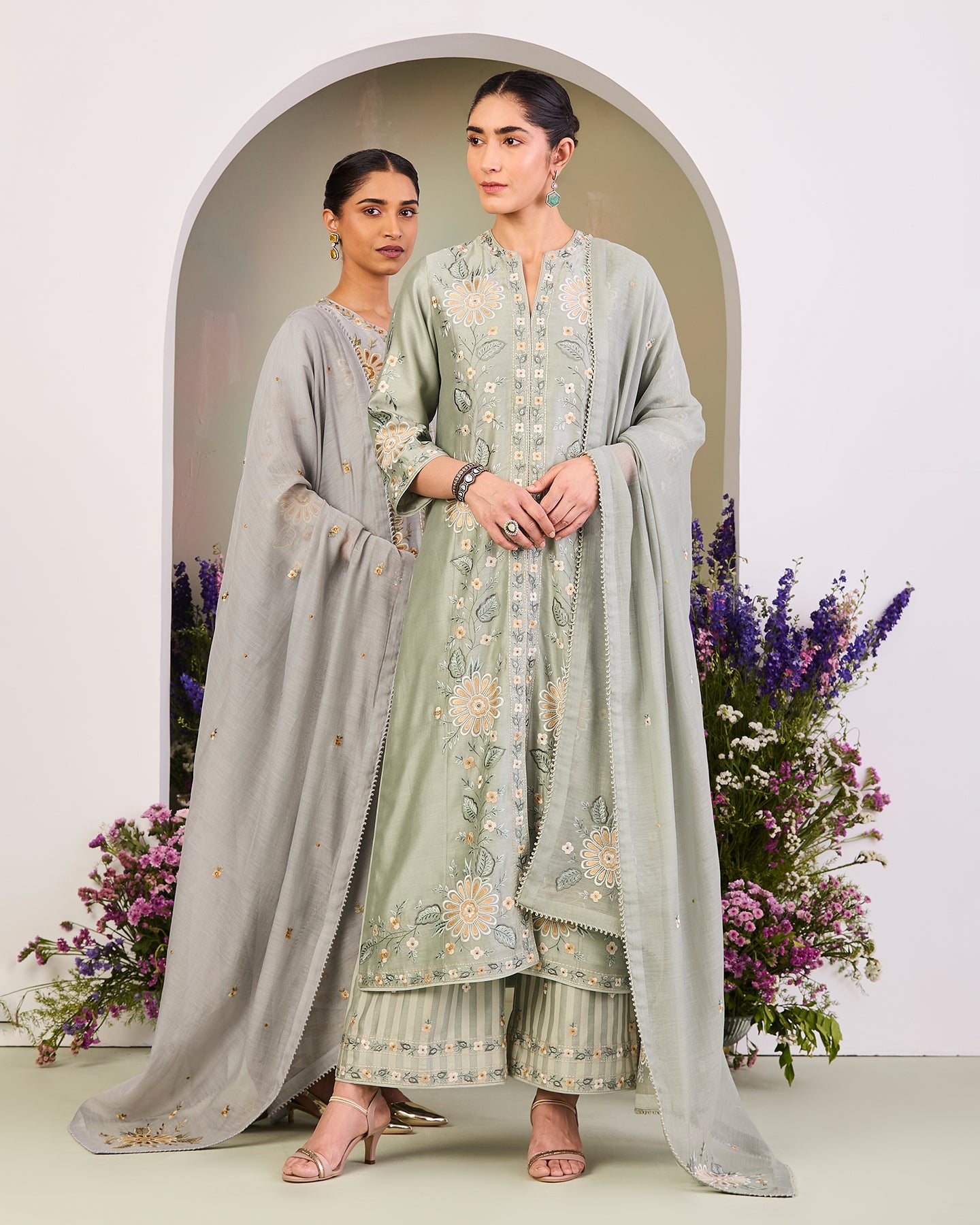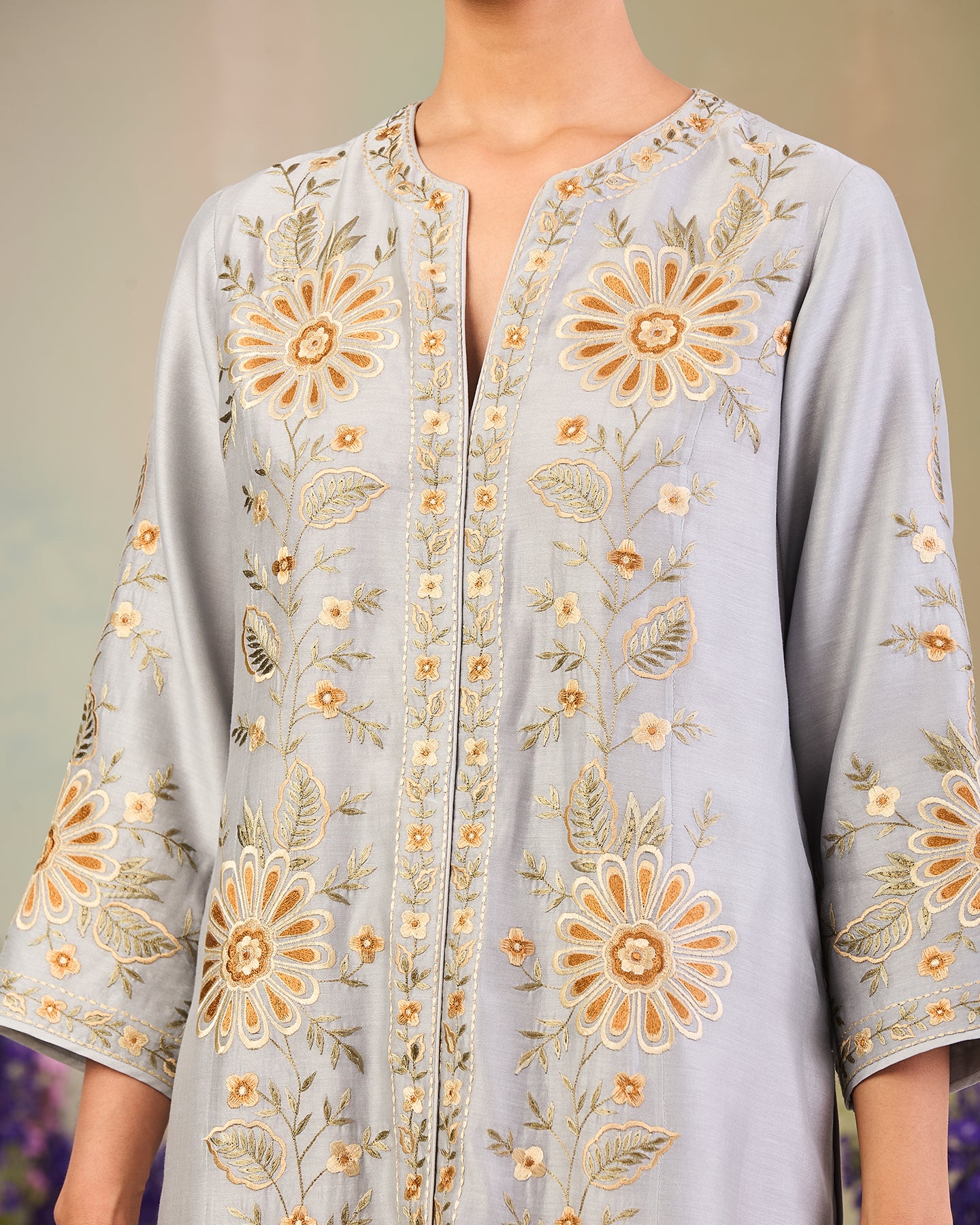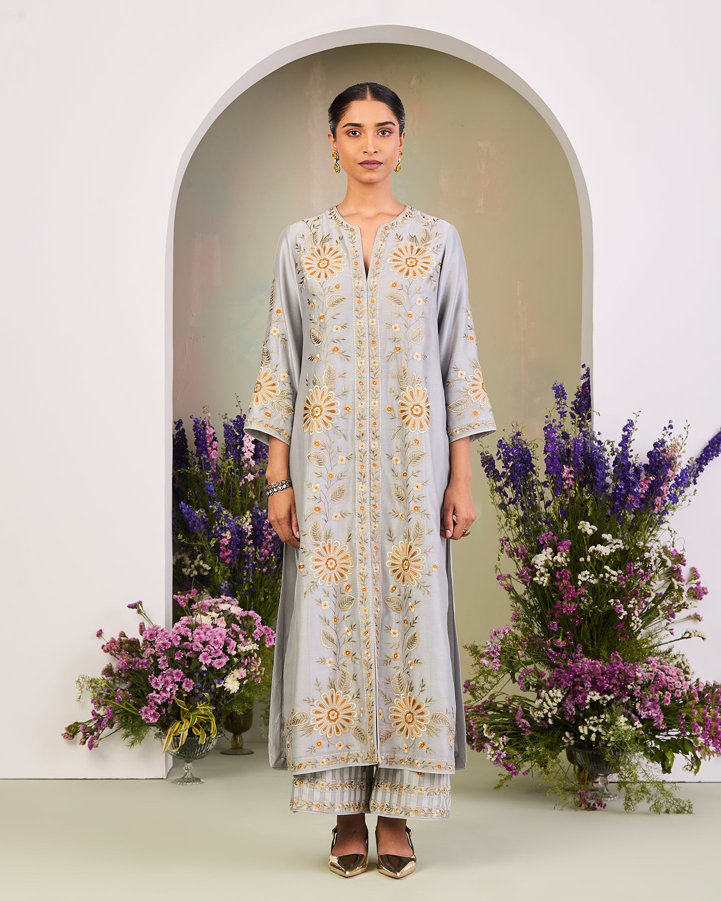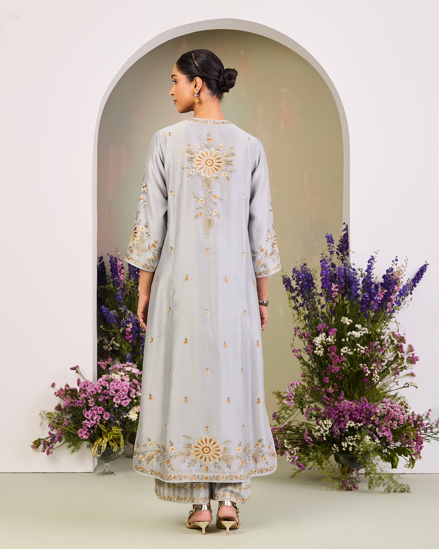 This is an ice-blue handwoven silk chanderi long kurta with a round neck, small slit in front and three-quarter sleeves. It comes with a pair of matching loose-fit pants and a handwoven chanderi mulmul dupatta. The set is decorated with floral motifs embroidered using multi-colour silk threads. Finished with matching piping and lace detailing.