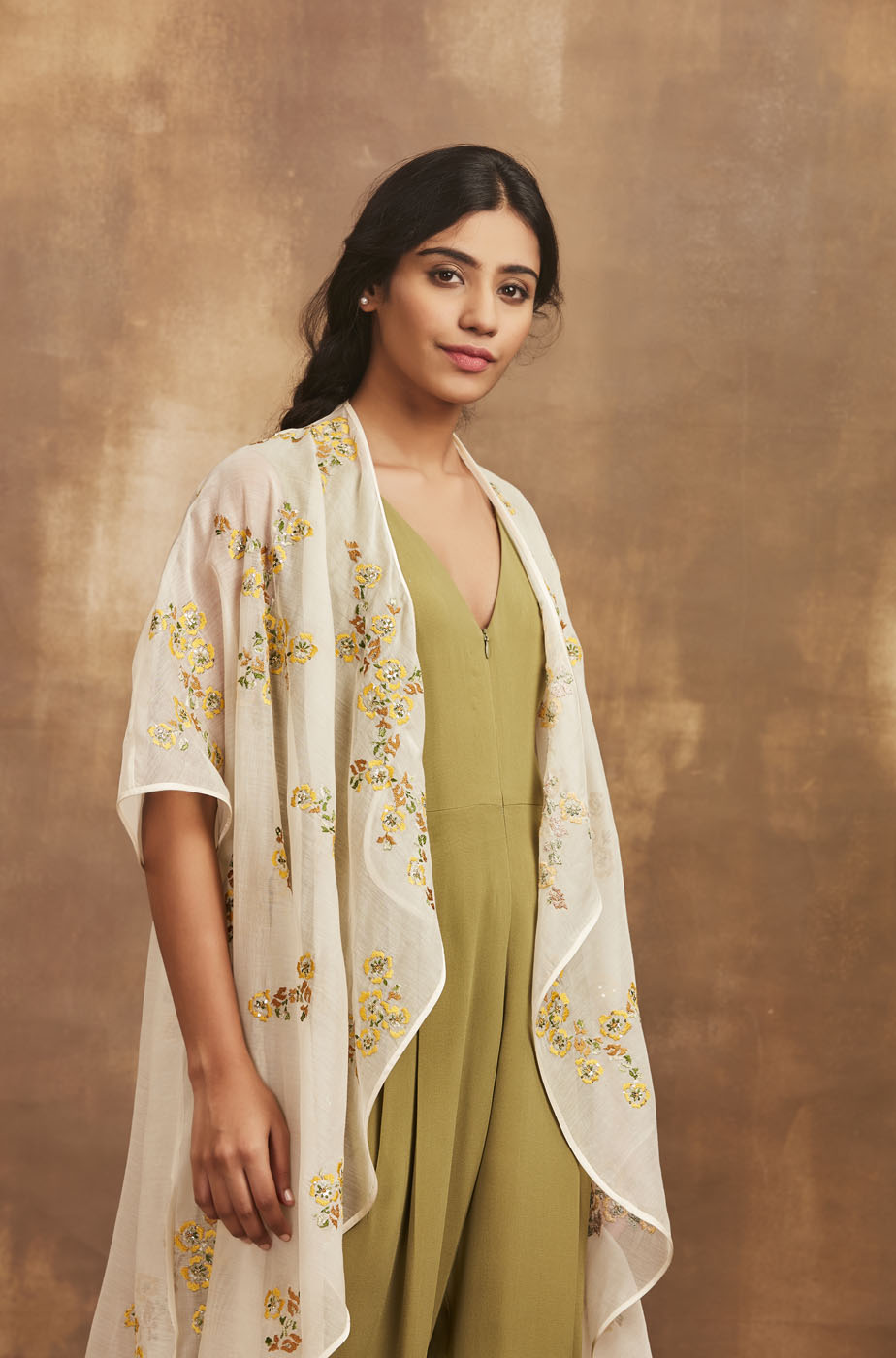 Featuring ivory mal embroidered shrug paired with olive green georgette jumpsuit.