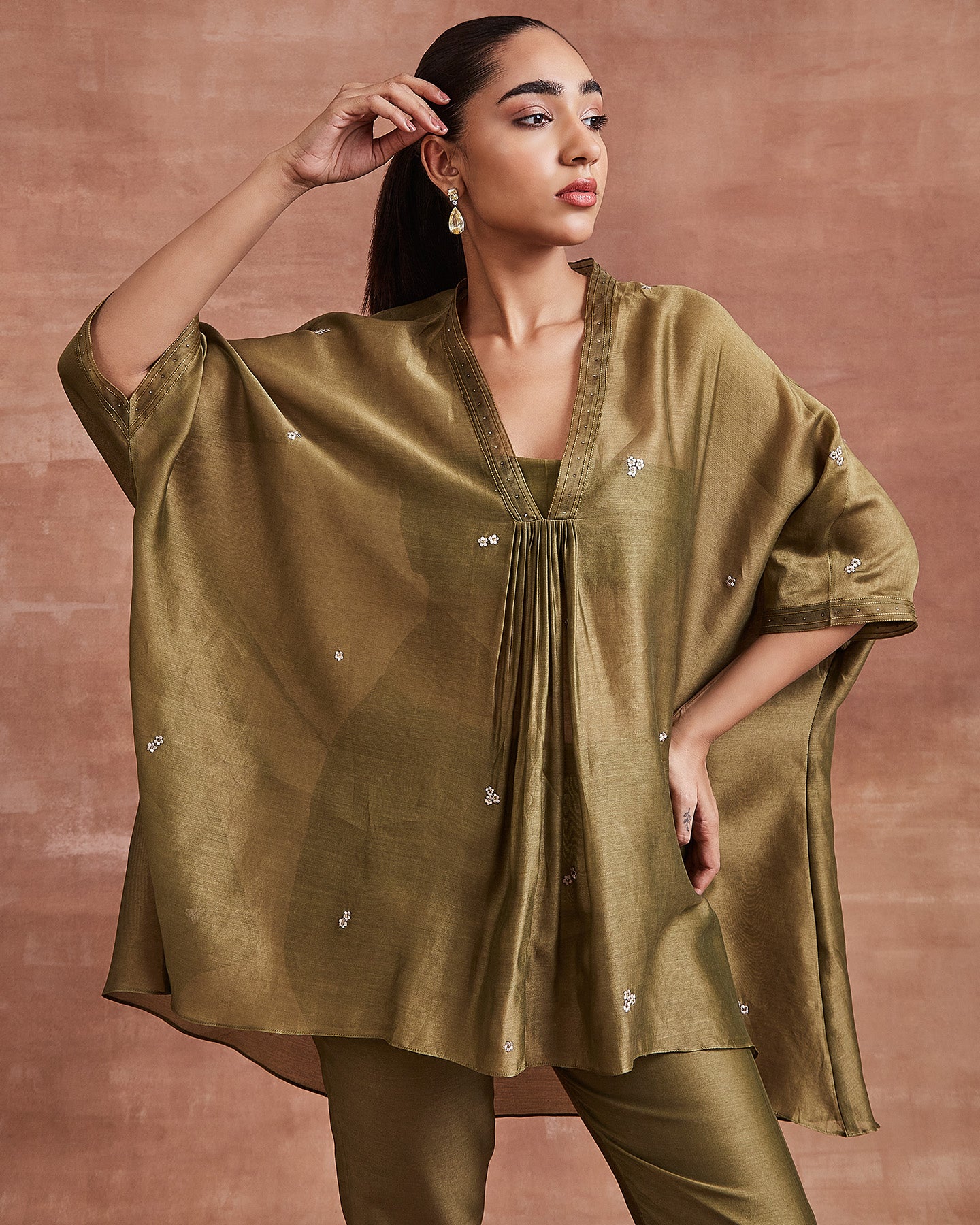Radiate charm in our Olive Chanderi Pleated Coordinate Set, adorned with silk thread floral motifs on the shirt and Swarovski highlighting. This ensemble offers a vibrant and stylish look.