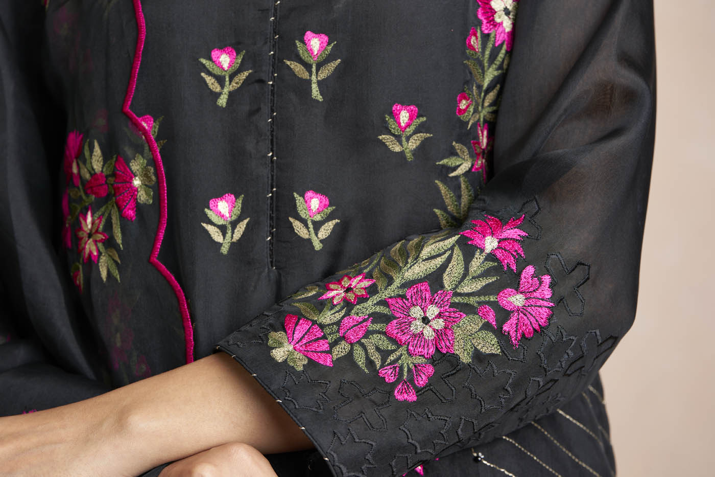 Embroidery Mixed geometric and floral pattern embroidred using silk threads.