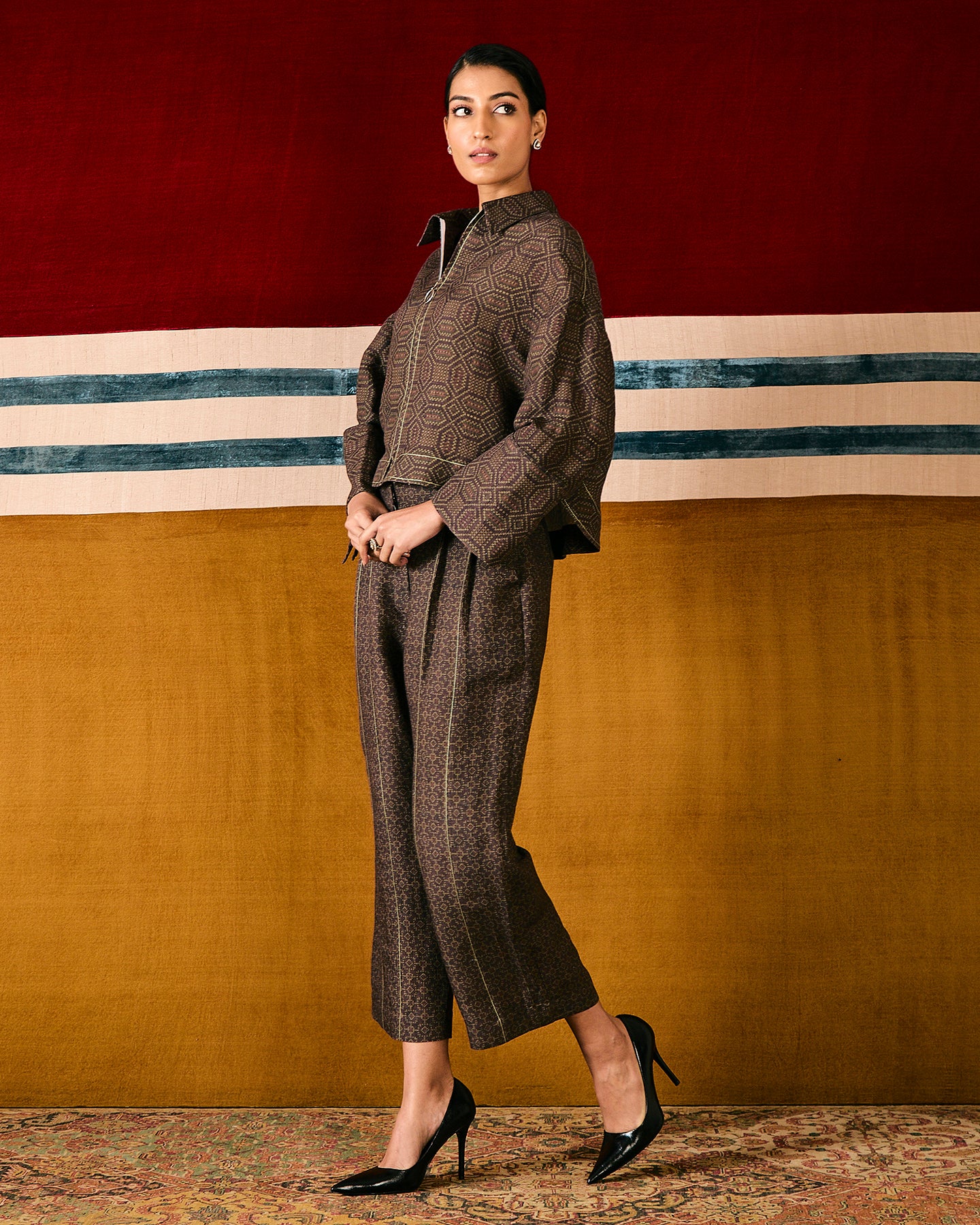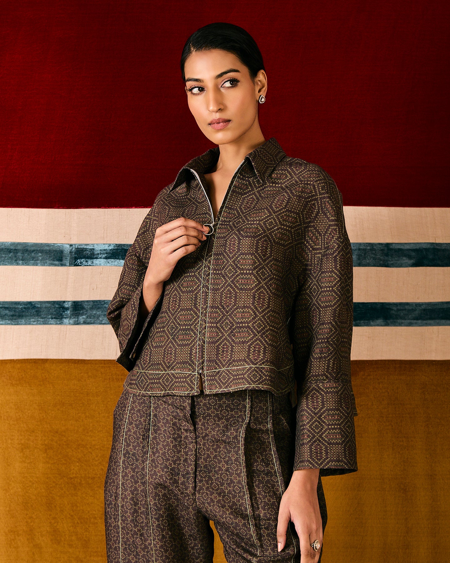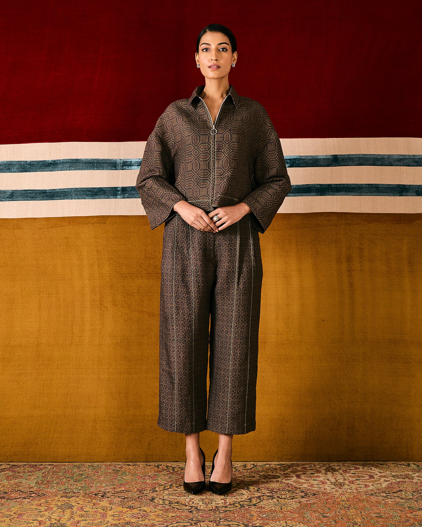 This deep brown pure linen co-ordinate set features an exclusive in-house geometric print. The shirt has a classic collar with front zip, and cuffed full sleeves. It is paired with loose-fit pants. The set is finished with intricate thread work.