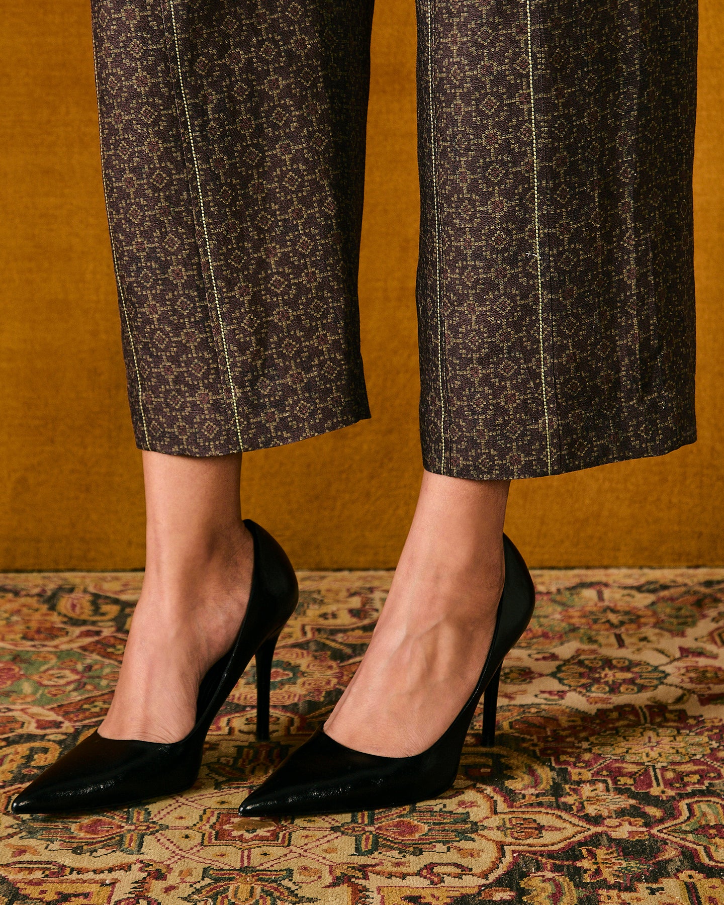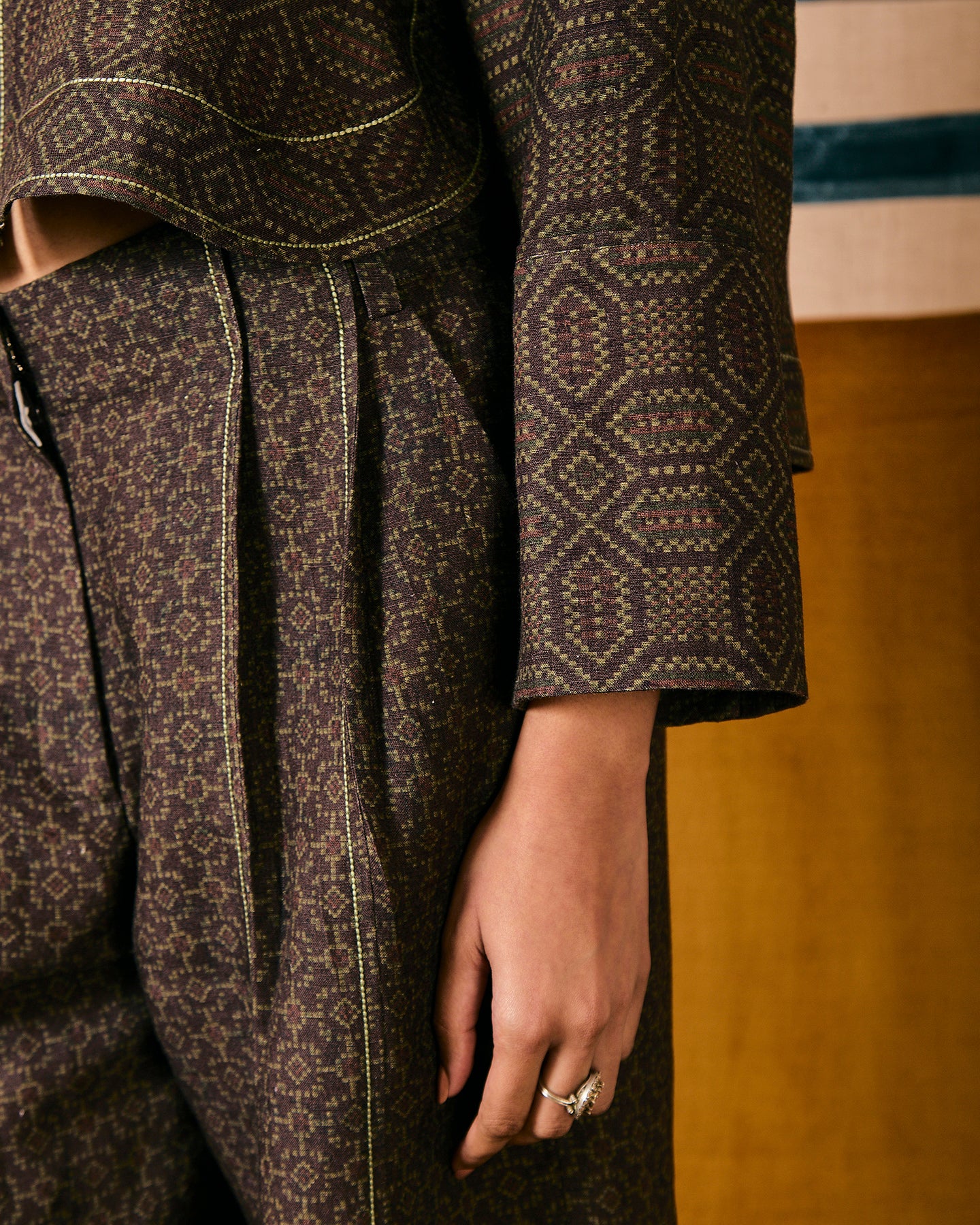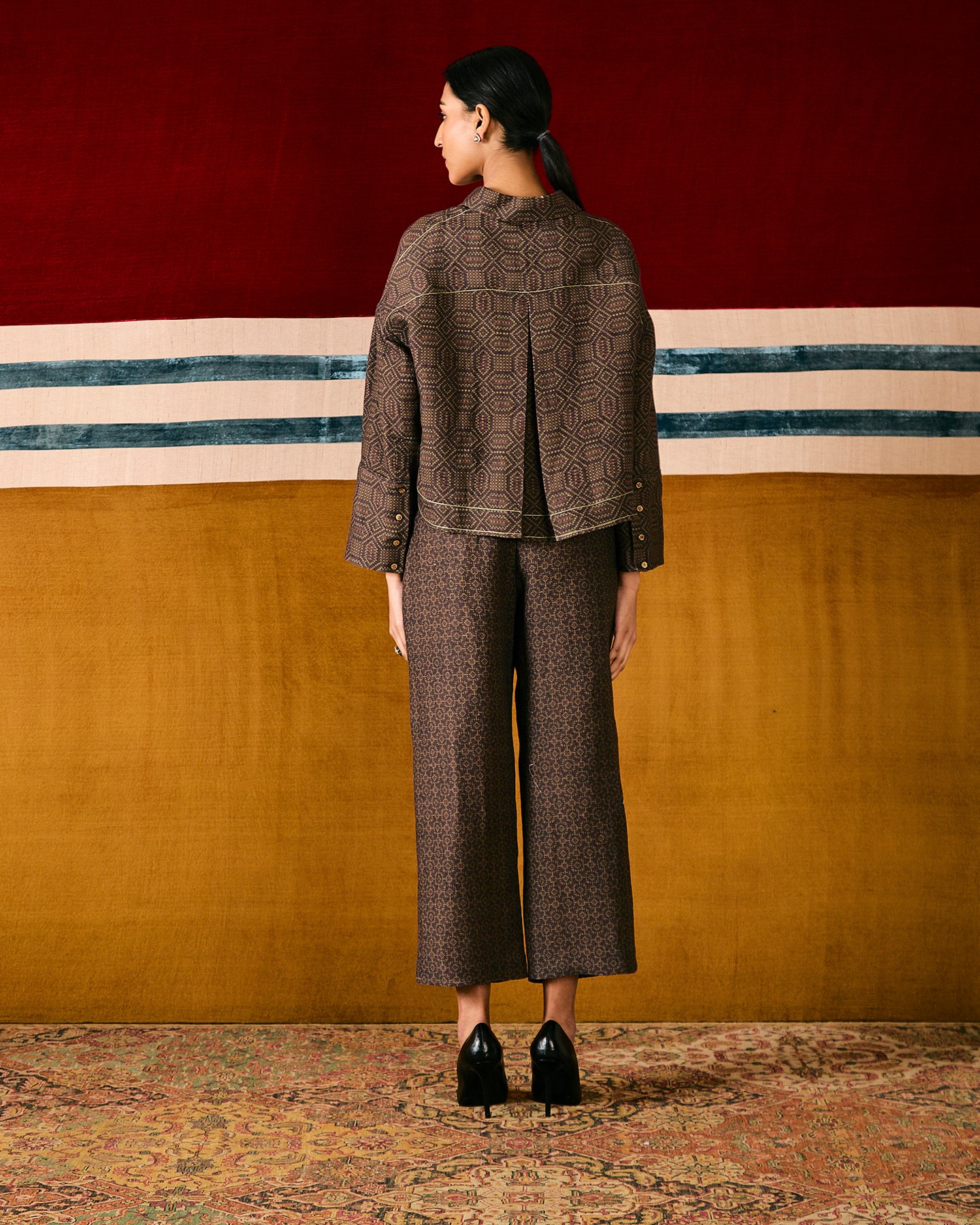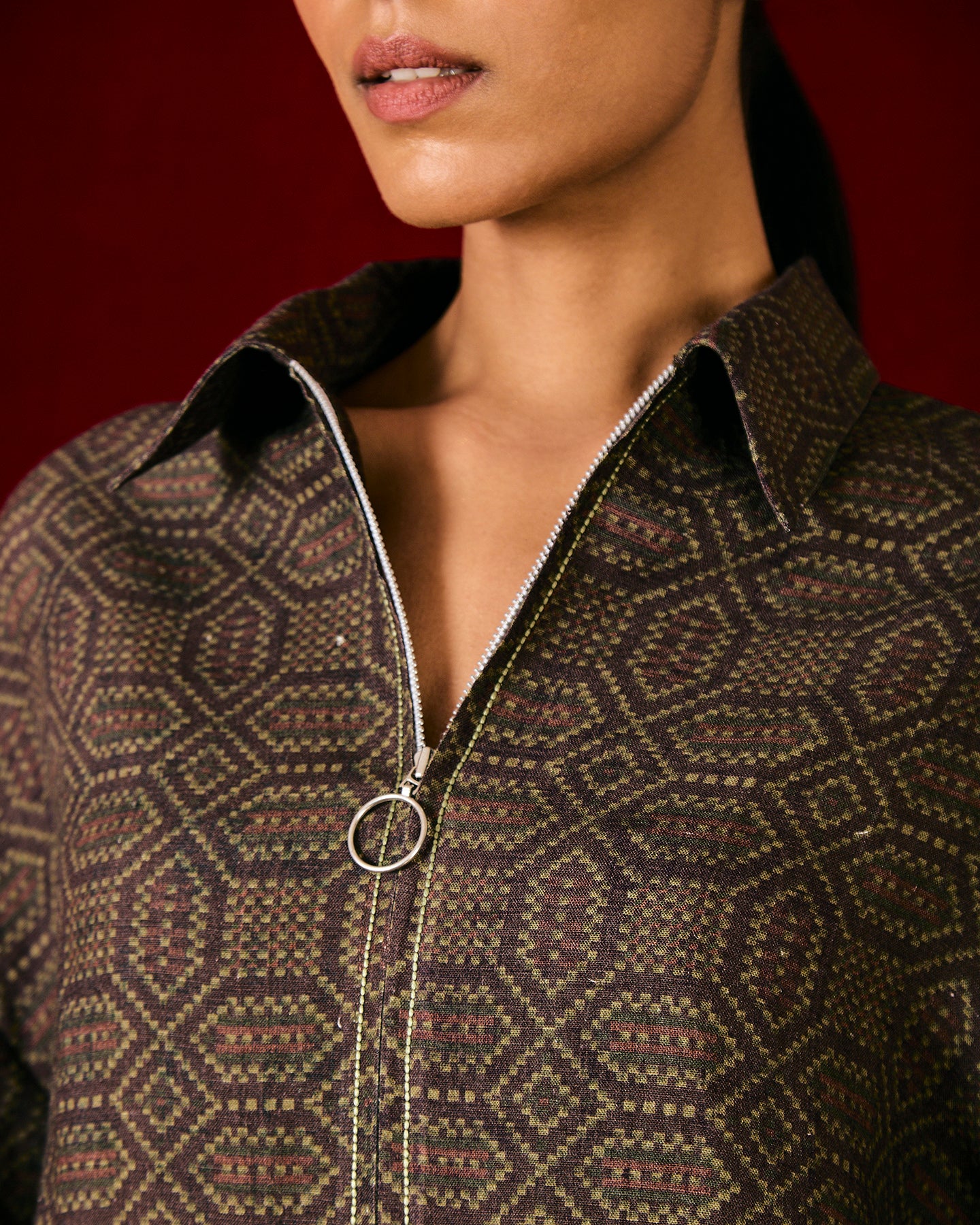 This deep brown pure linen co-ordinate set features an exclusive in-house geometric print. The shirt has a classic collar with front zip, and cuffed full sleeves. It is paired with loose-fit pants. The set is finished with intricate thread work.