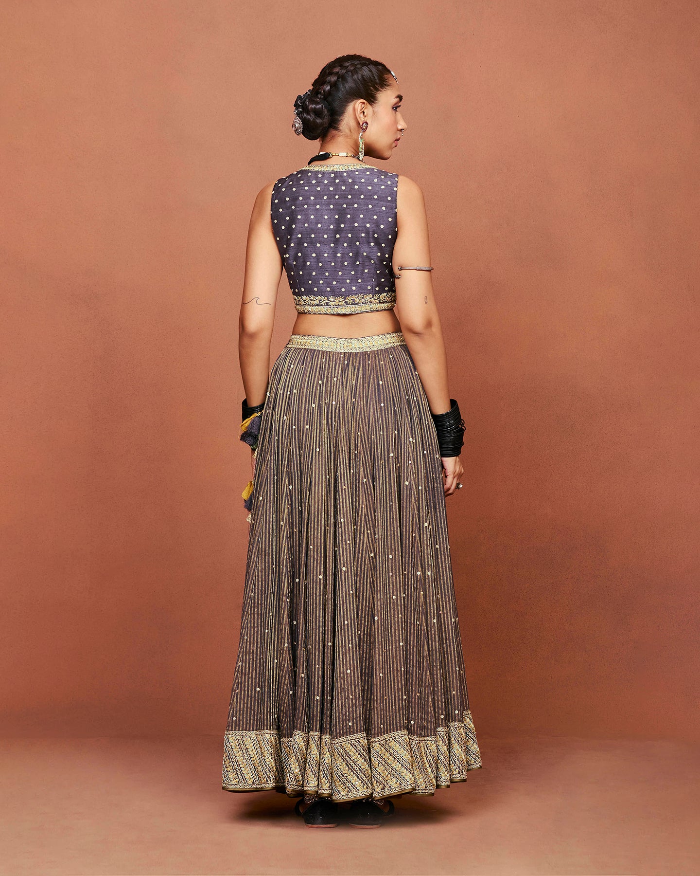 This set features a black and beige raw silk full sleeves short jacket, a charcoal grey raw silk sleeveless blouse, and a black and gold stripe georgette tissue ghagra with side pockets. The set showcases a tribal inspired geometric and floral pattern. Embroidered using appliqué work, silk threads, dori, sequins, and beads.