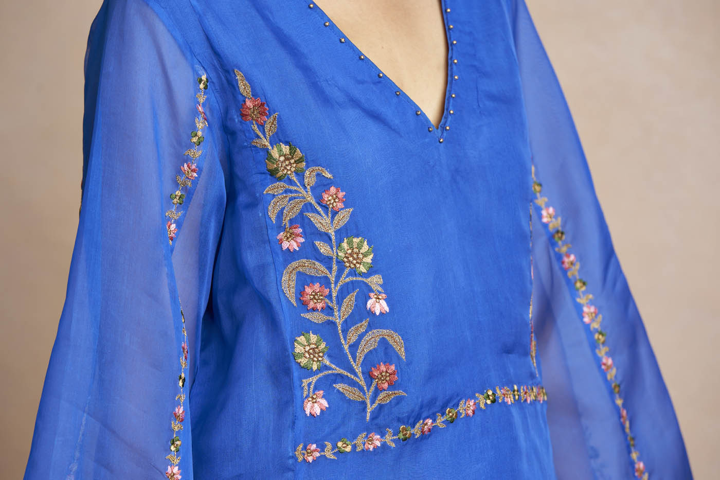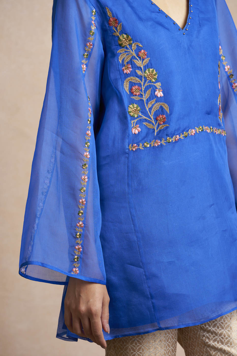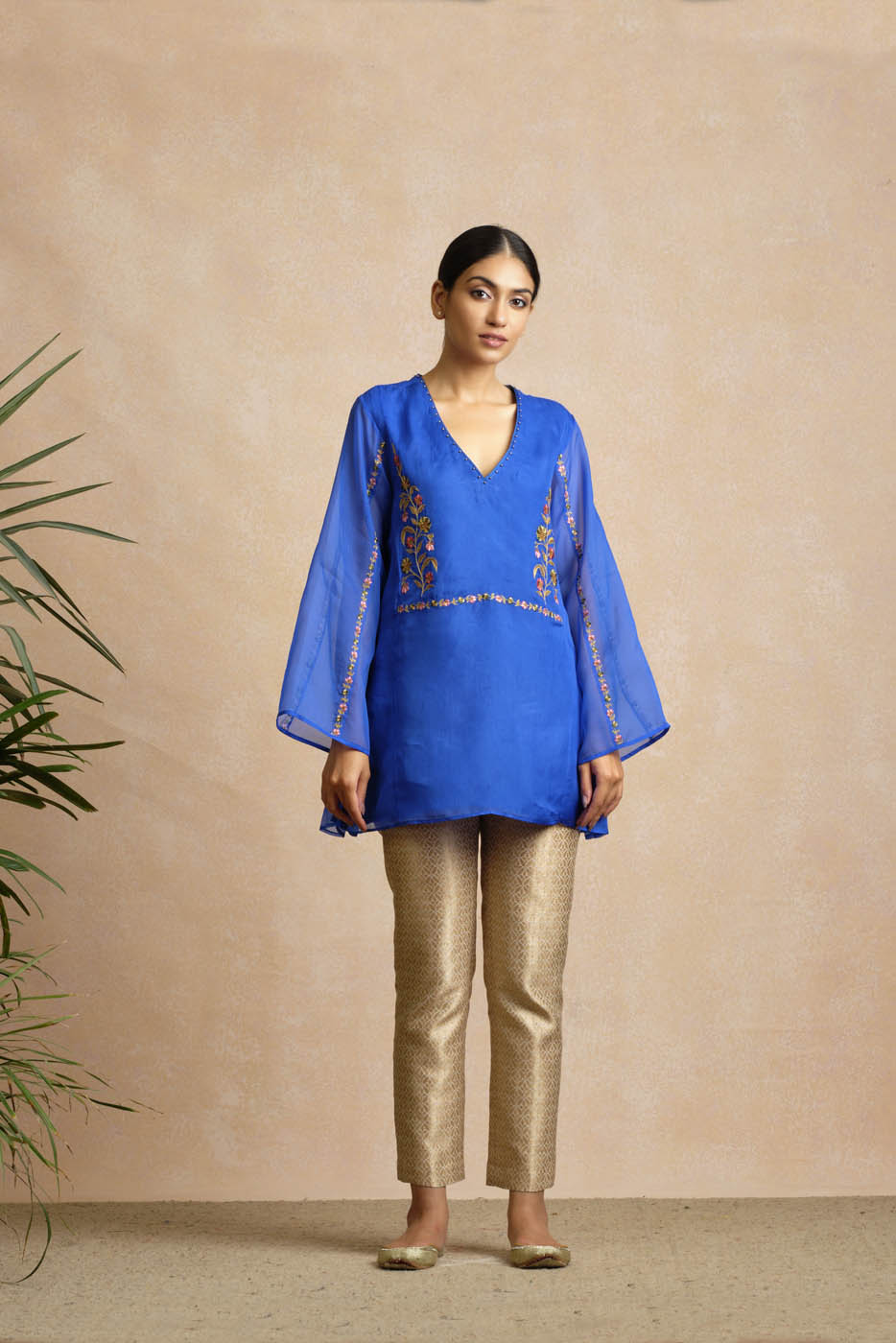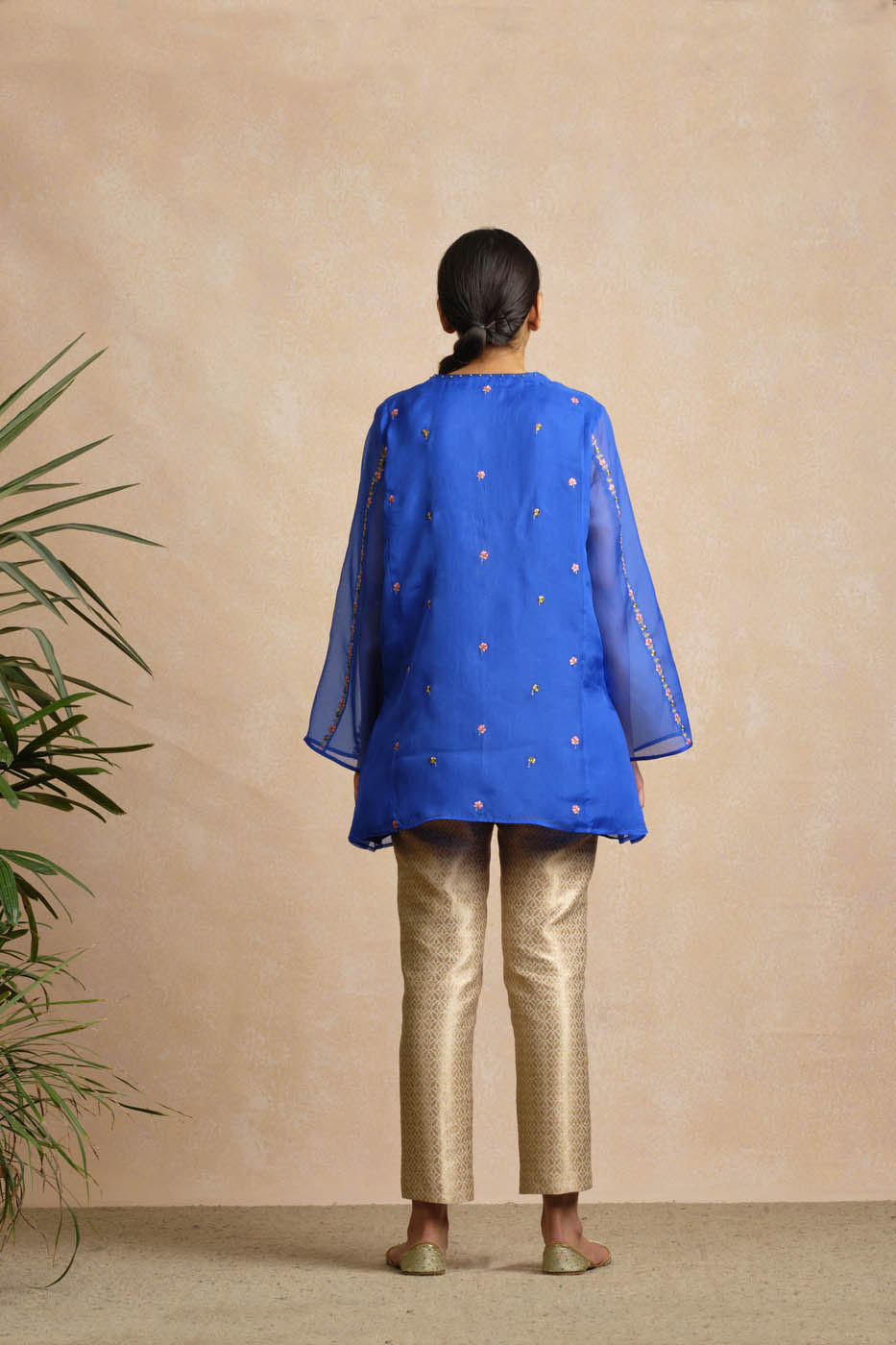 Featuring a blue organza side panel top. You can pair it with you favorite separates.