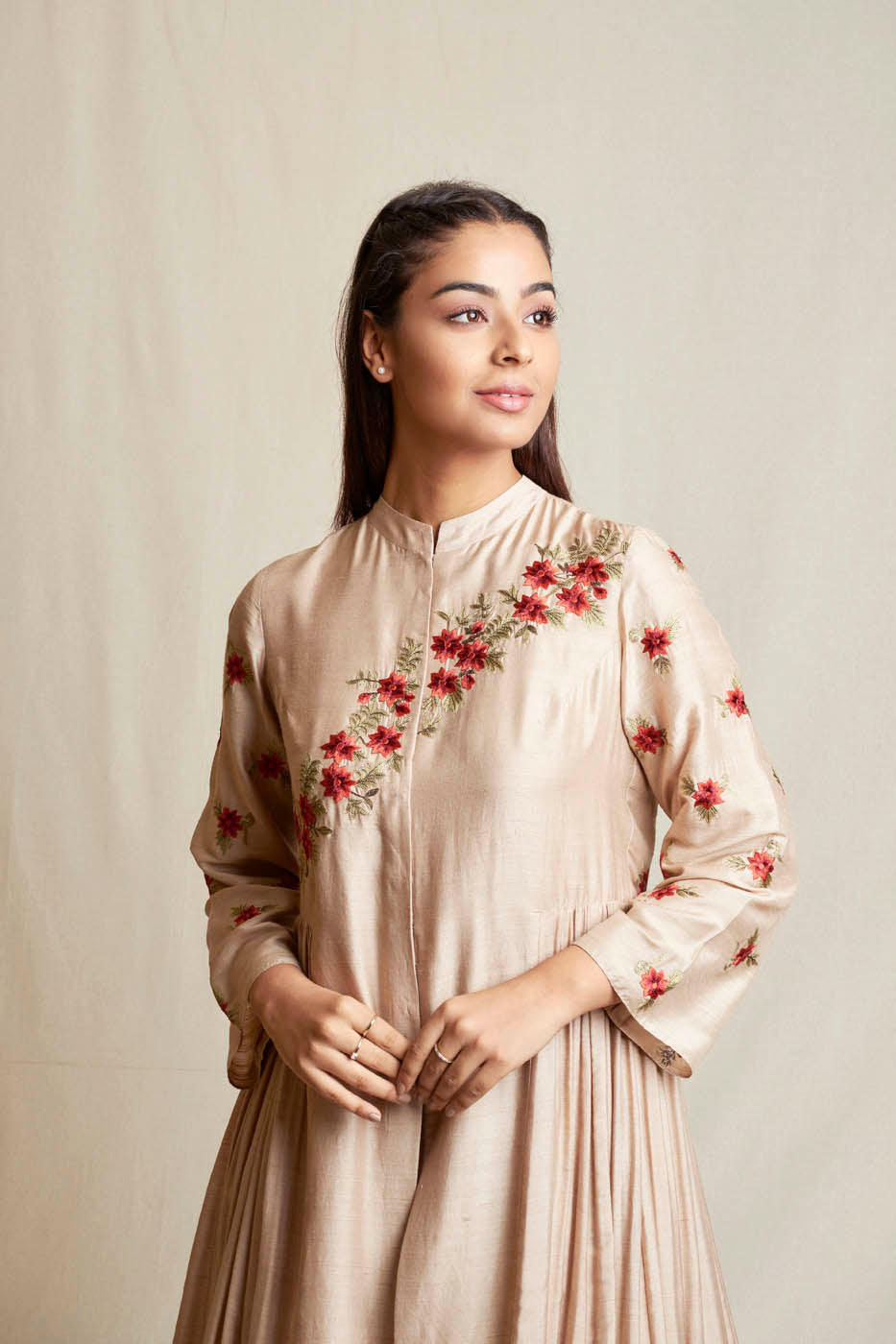 Featuring a clay white kalidar tussar georgette kurta with gather detailing and silk thread embroidery along with pants.