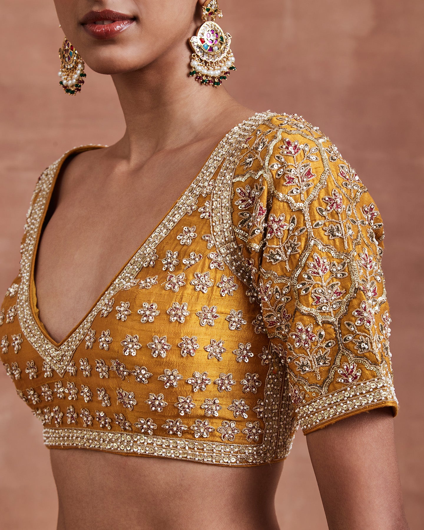 Make a statement in our Mustard Raw silk 30 Kali Lehenga Set. Featuring a 16” wide striped yellow and gold tissue diagonal skirt border, adorned with multi-coloured dori, pearl, and sequin floral motifs. Paired with a multi-coloured dori, sequin, and pearl blouse, and an exquisite gold silk tissue dupatta with embroidered jaal, highlighted with old gold kiran. This ensemble is a true embodiment of regal charm.