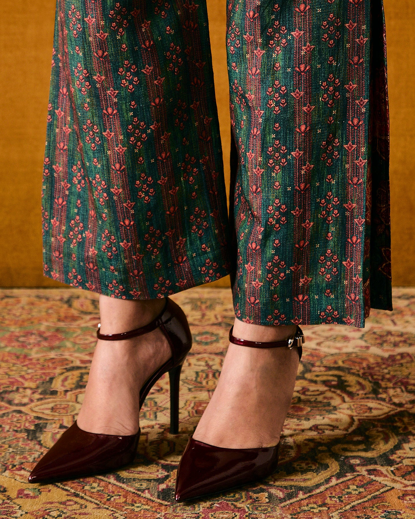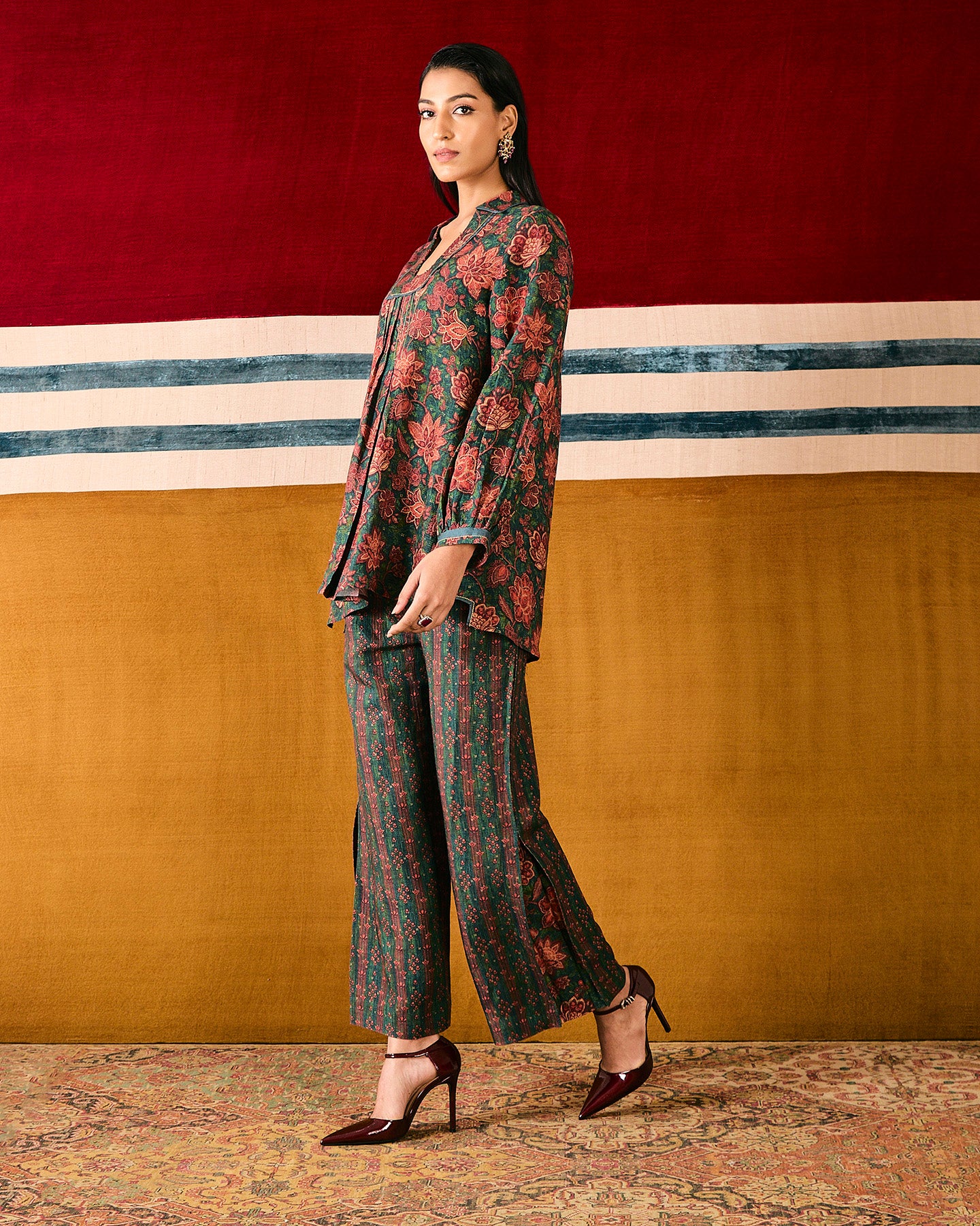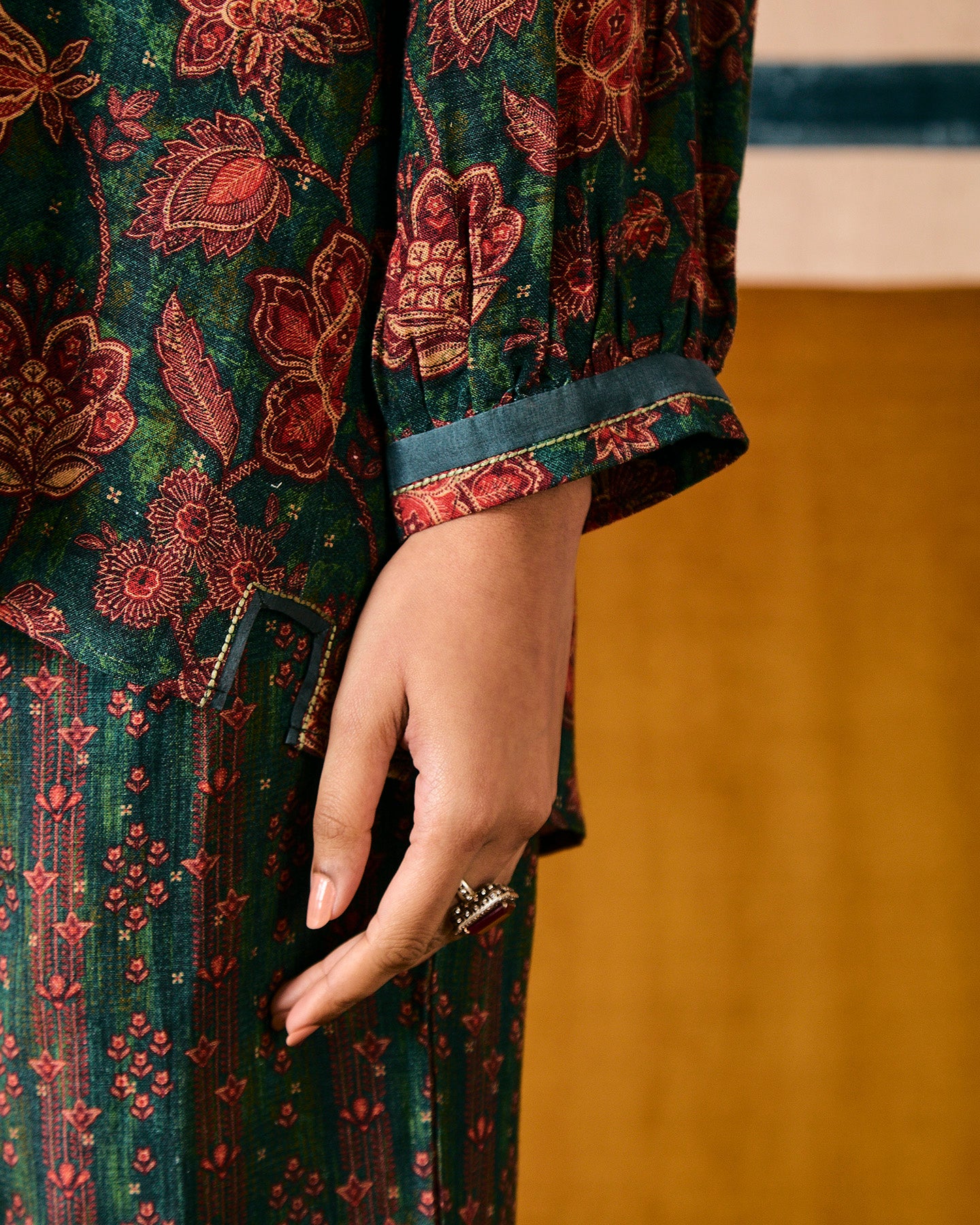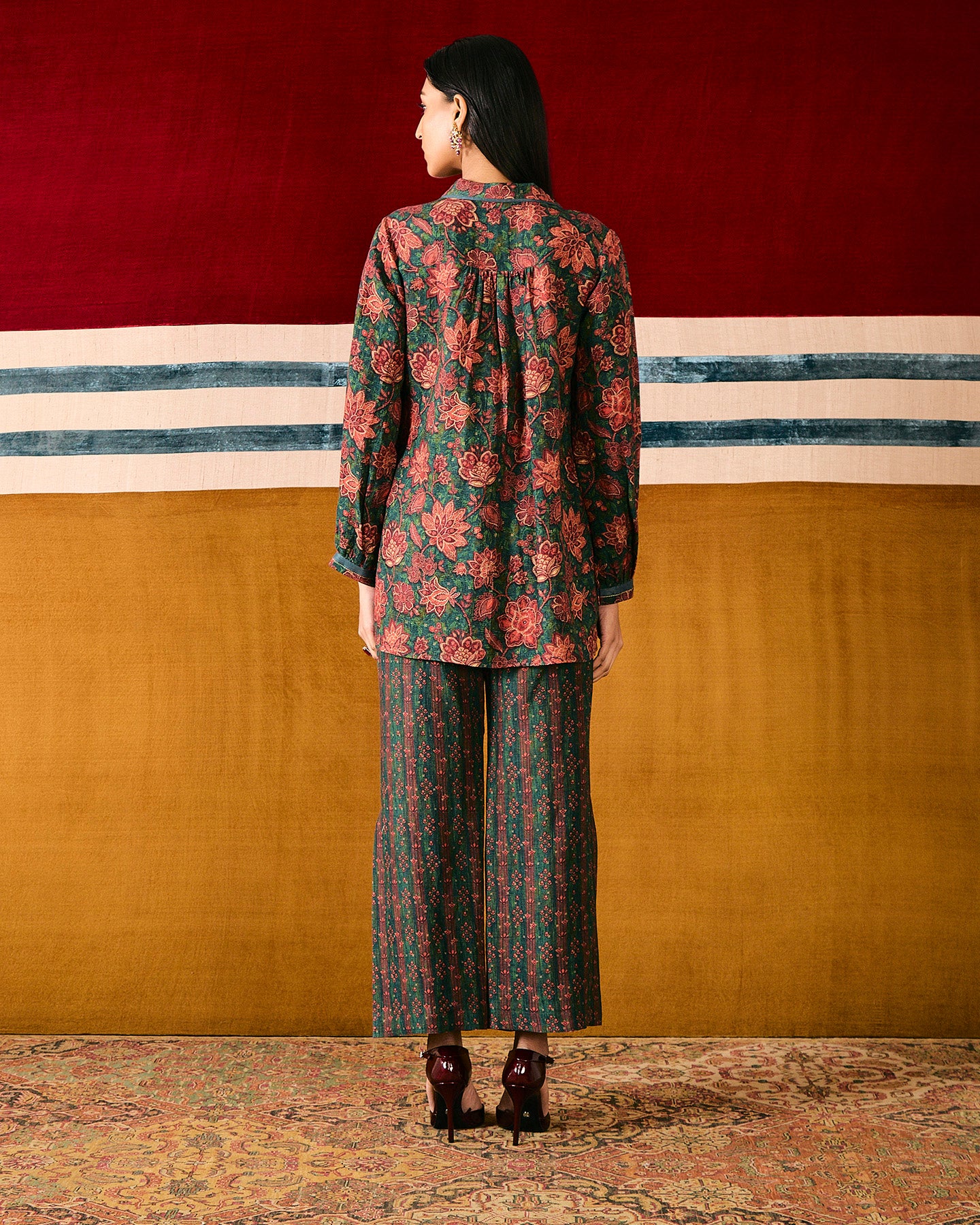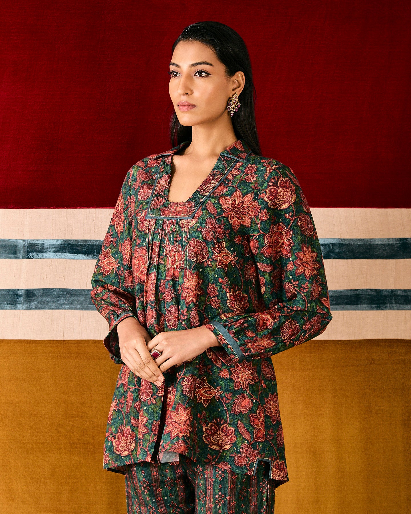 This dark green pure linen co-ordinate set features an exclusive in-house chintz print. The top has a collared square neckline, pin tucks, a box pleat, and three-quarter gathered full sleeves. It is paired with straight-fit pants featuring pockets and a box-pleat on each side. The set is finished with silk organza piping, and enhanced with threads and beads.