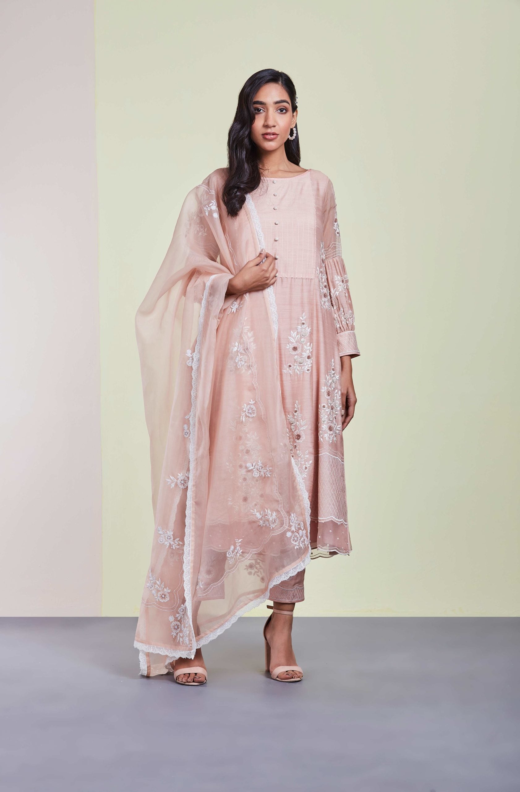 This set features pearl blush tussar georgette panelled kurta with placement embroidery and organza detail an a pair of embroidered pants. It comes along with an embroidered organza dupatta with lace detailing.