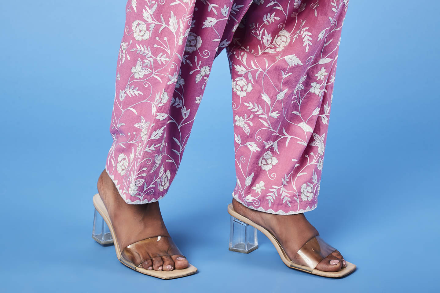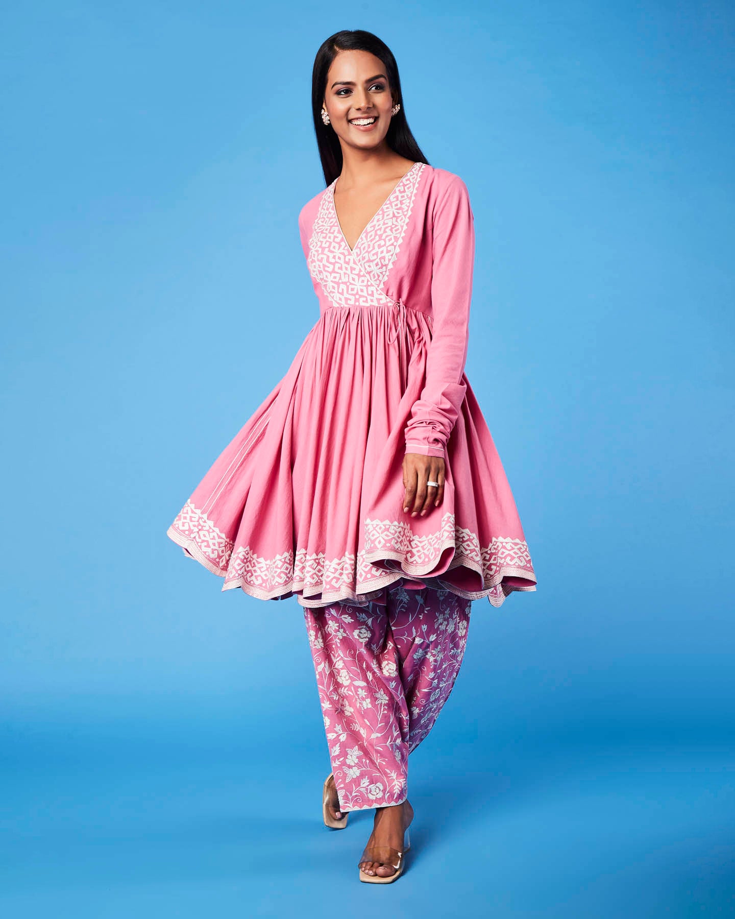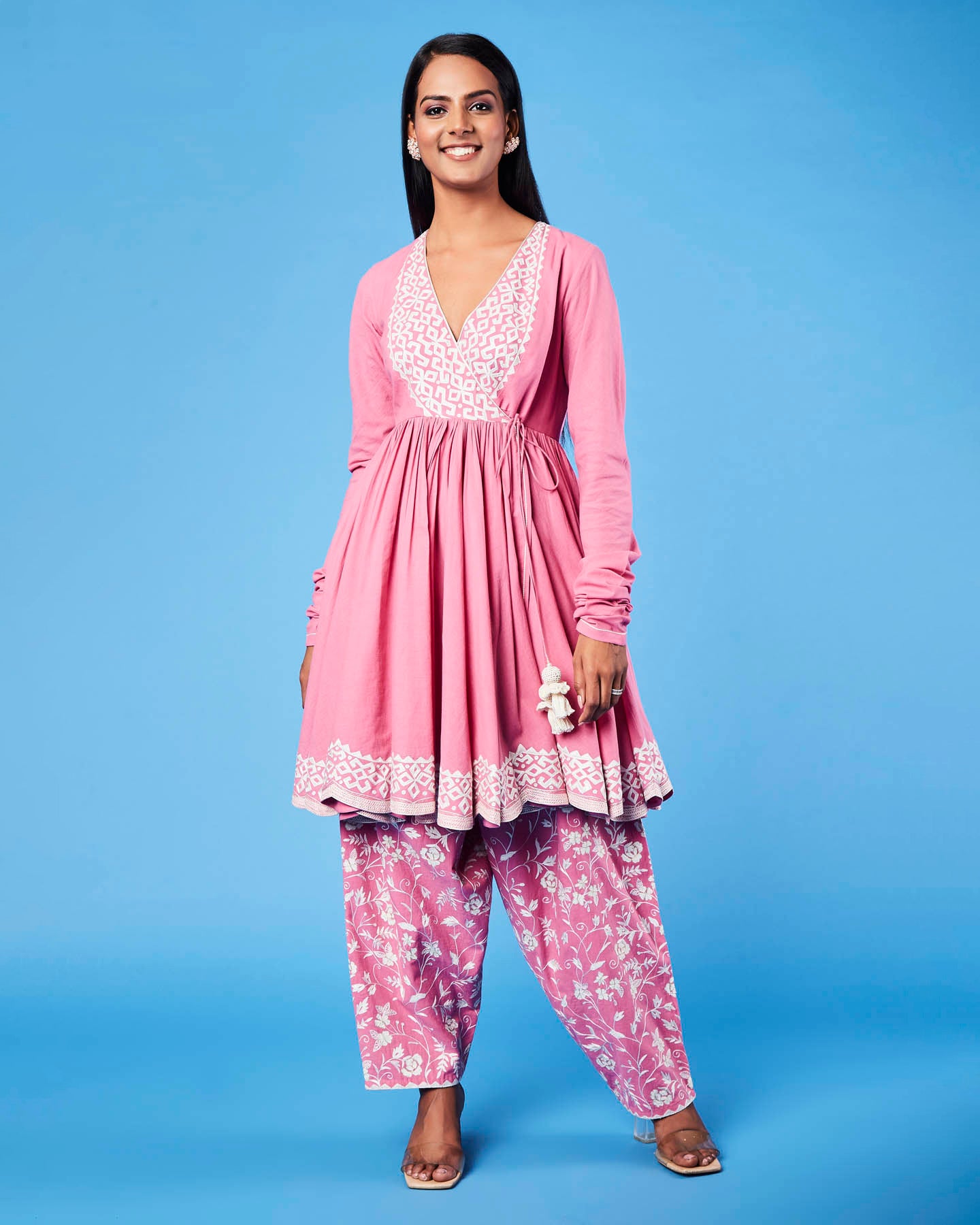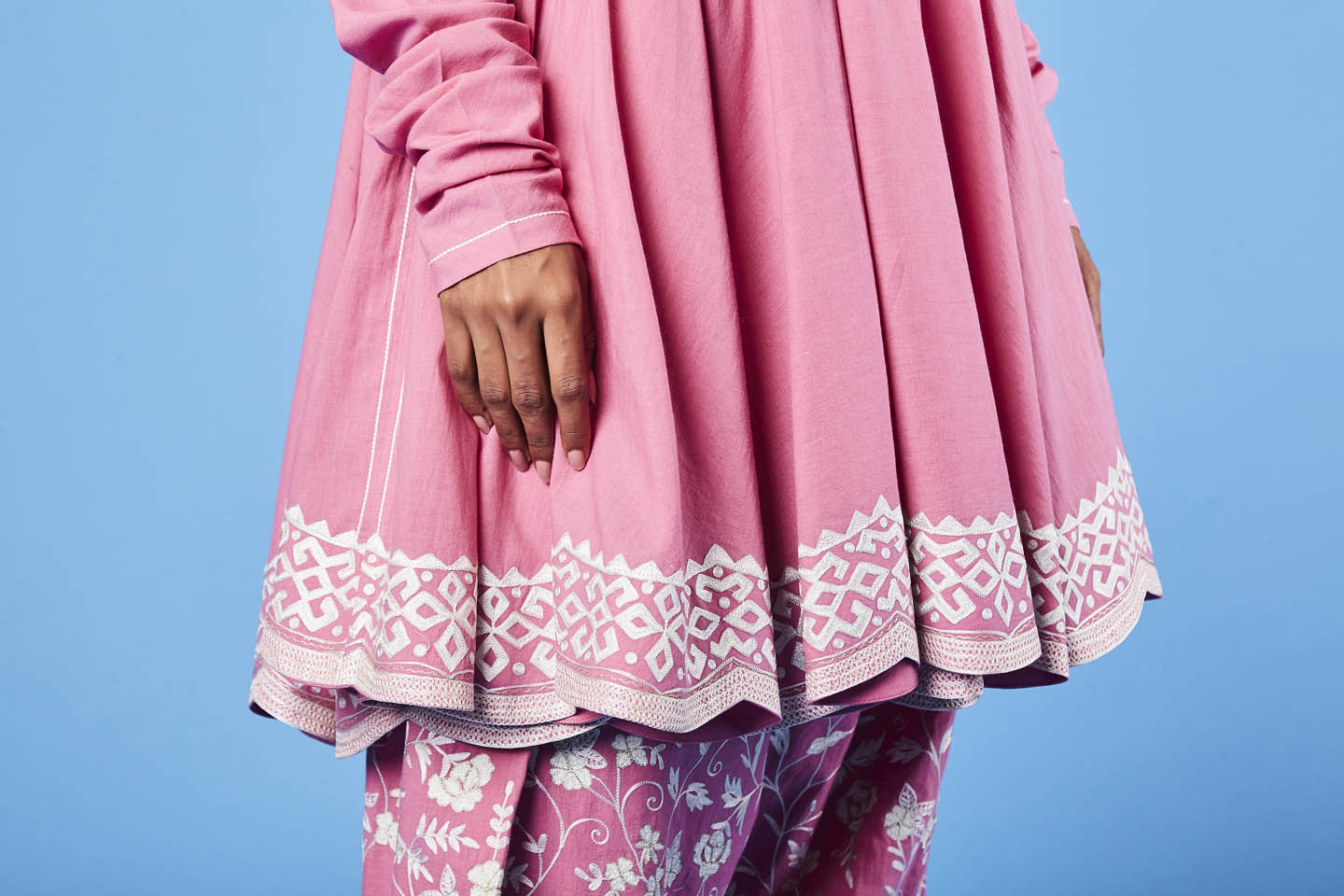 This pink cotton short anarkali has embriodered floral motifs. It comes with an embroidered salwar and a dupatta.