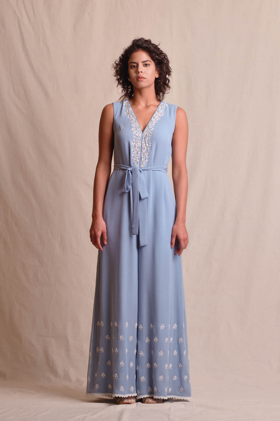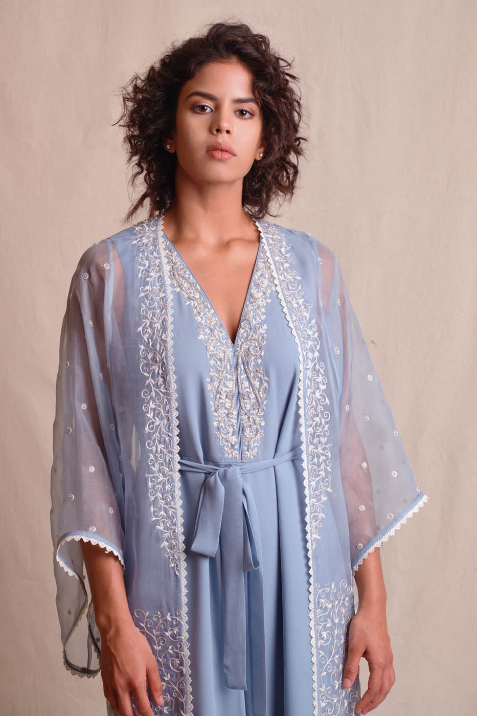 Featuring a loose georgette jumpsuit enhanced with a knotted belt and a silk organza floor length kimono cape.