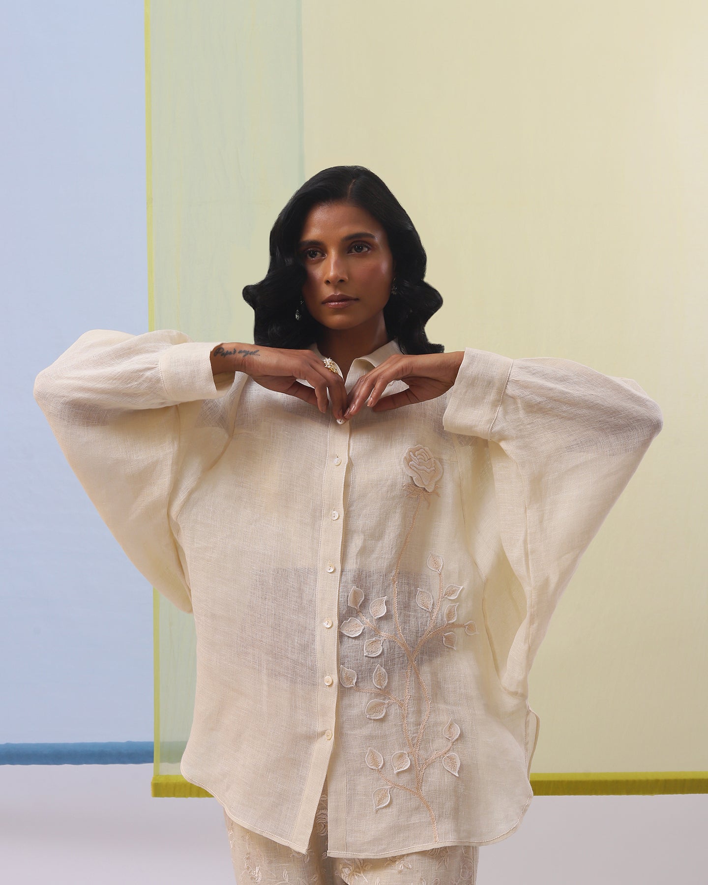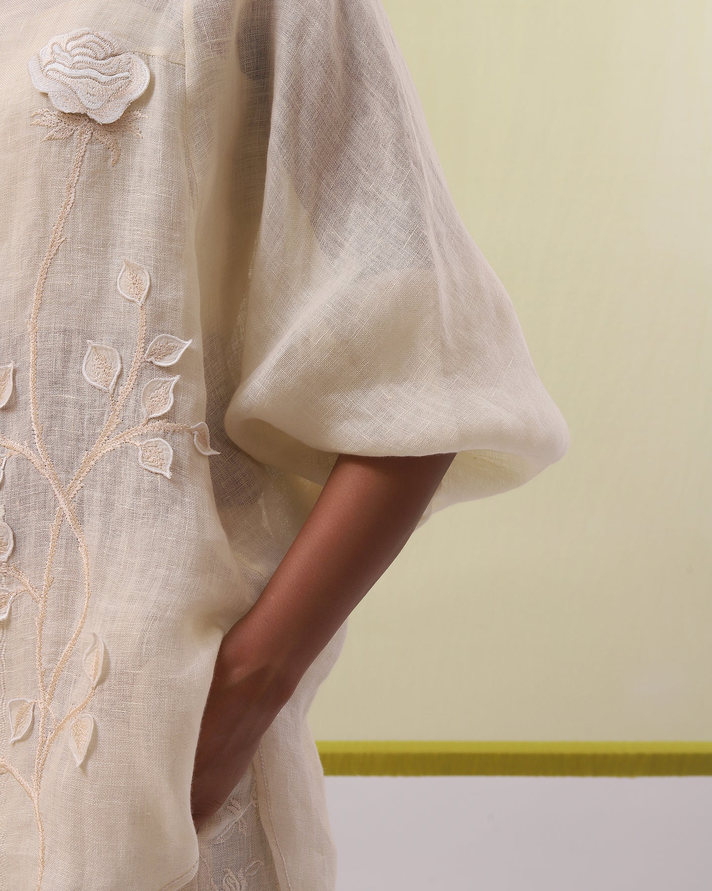 Embark on a journey of refined elegance with our beige pure linen co-ordinate set. The shirt, with its loose fit and classic top collar, whispers tales of timeless allure. Adorned with an embroidered tonal rose flower stem applique and delicately enhanced with silk thread embroidery, it's a symphony of romance and sophistication. Paired with straight-fit pants, embellished with embroidered rose flowers using tonal silk threads, this ensemble is a love letter to refined style, promising to captivate hearts with every step.