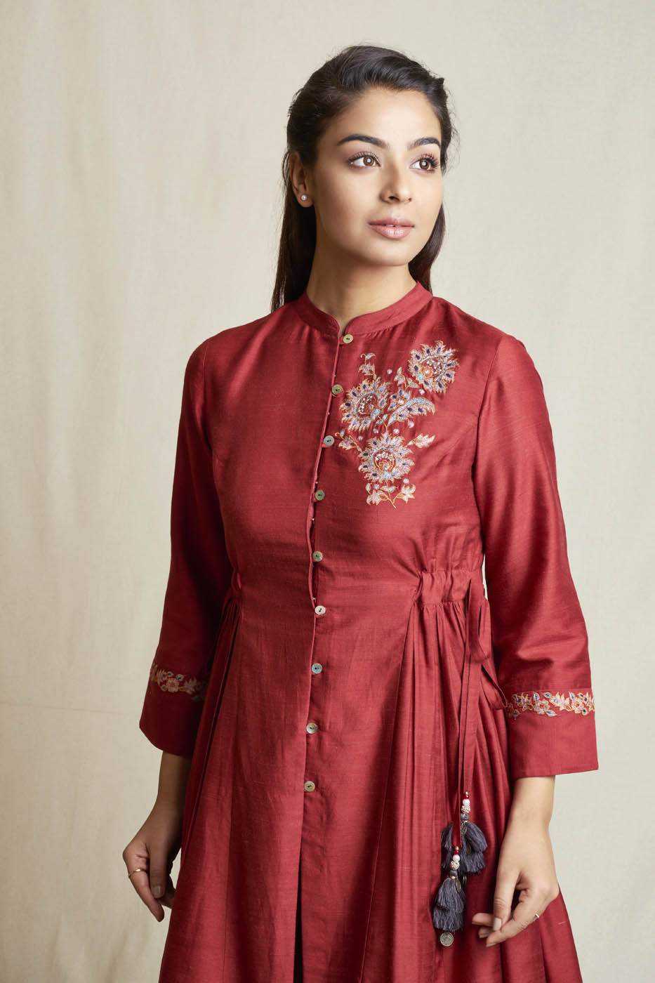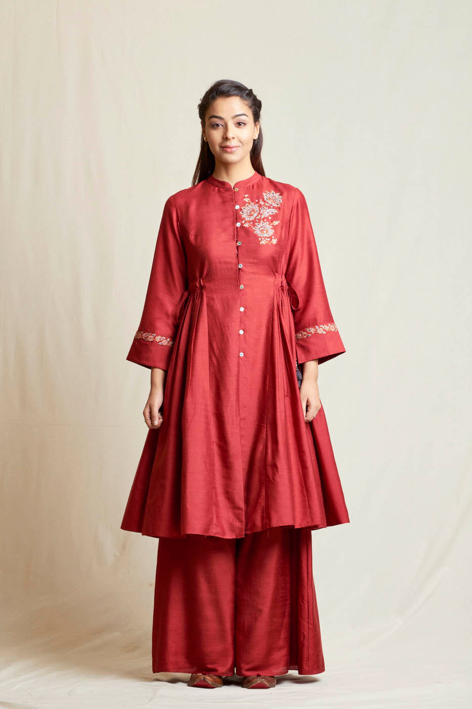 This set features rosewood embroidered kalidar kurta with silk thread work. It is paired with plain palazzos.