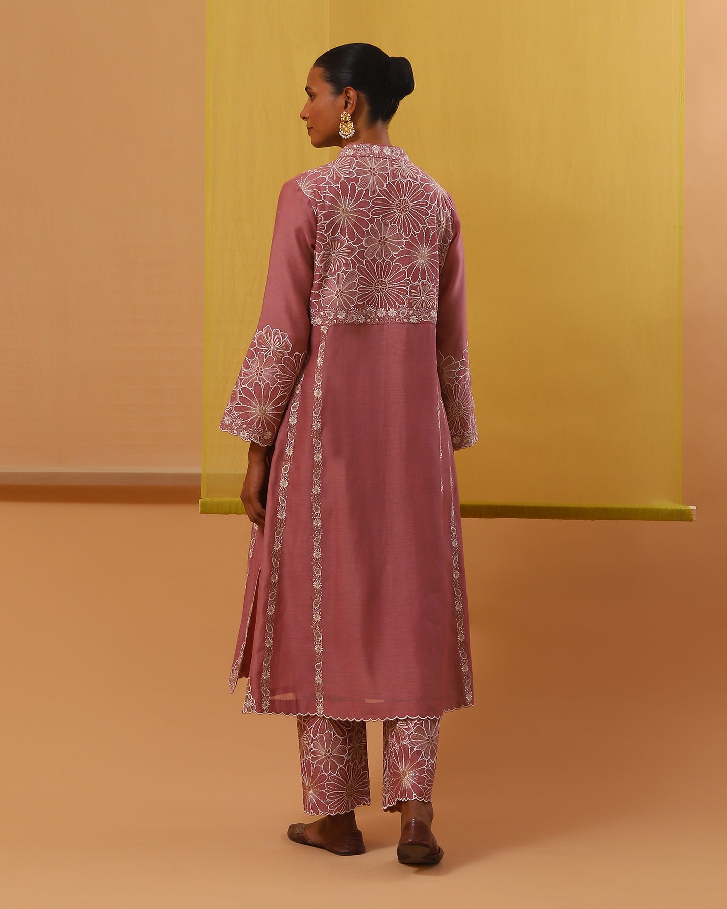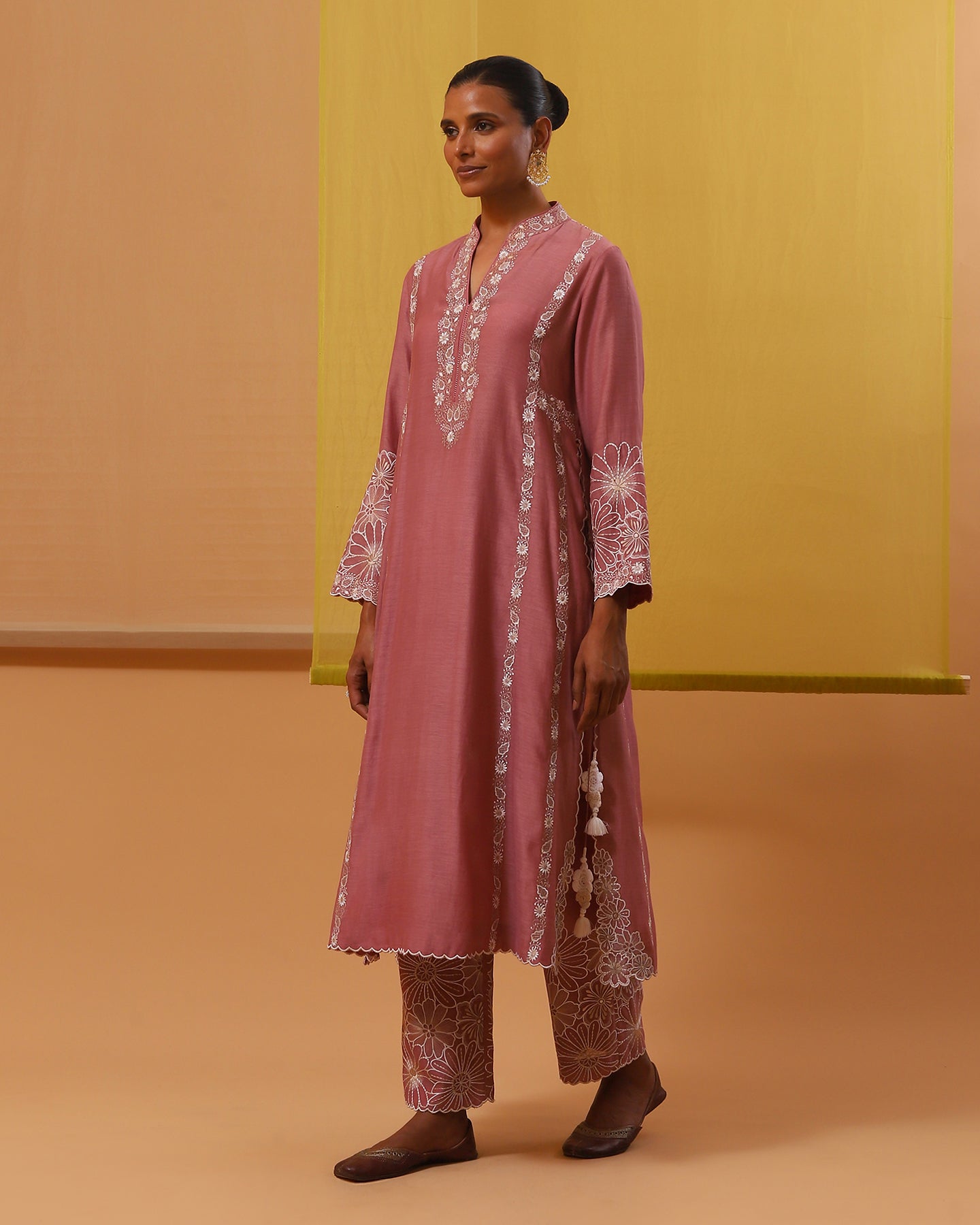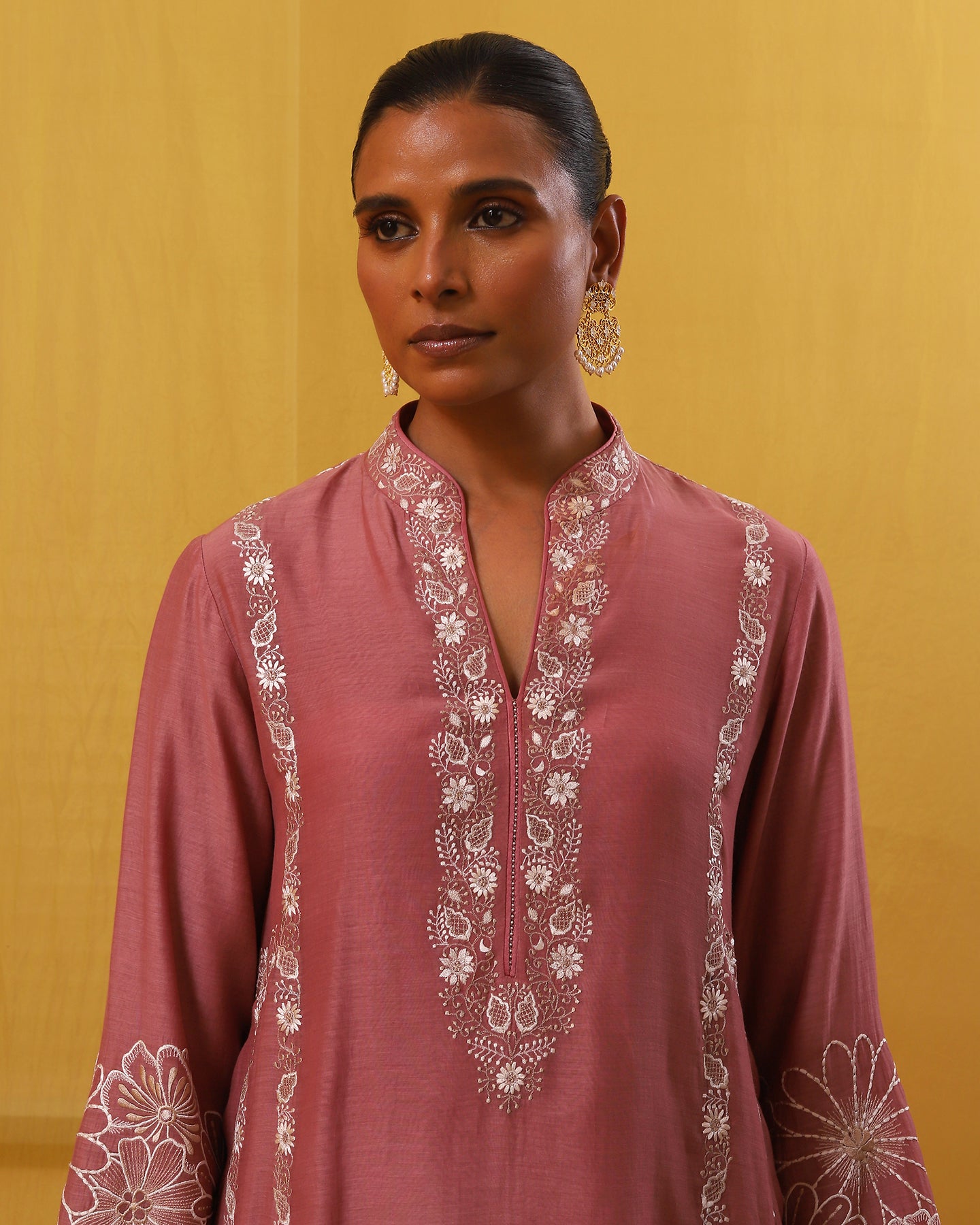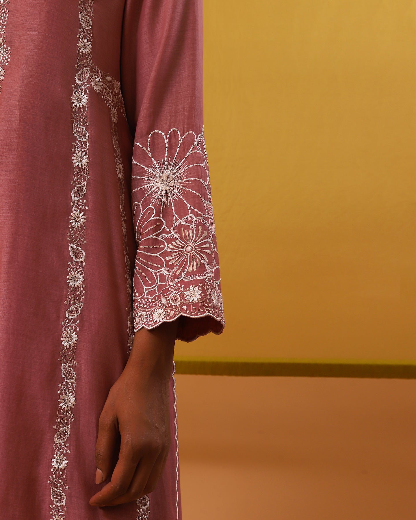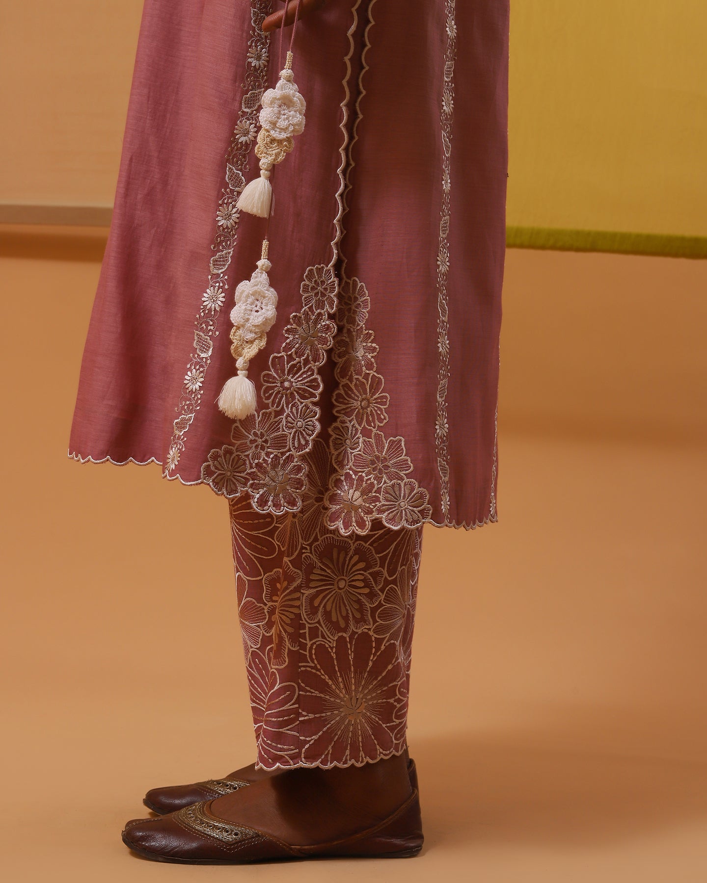 Step into elegance with our rose pink handwoven chanderi mulmul straight kurta set. This exquisite kurta features a stand collar with a slit, three-quarter sleeves, and a scalloped hemline that adds a graceful touch. Paired with ankle-length scalloped pants. The set is accentuated with delicate off-white and beige silk thread embroidered floral motifs. Complete your look with a matching dupatta, enhanced with delicate cutwork, for a truly sophisticated ensemble.