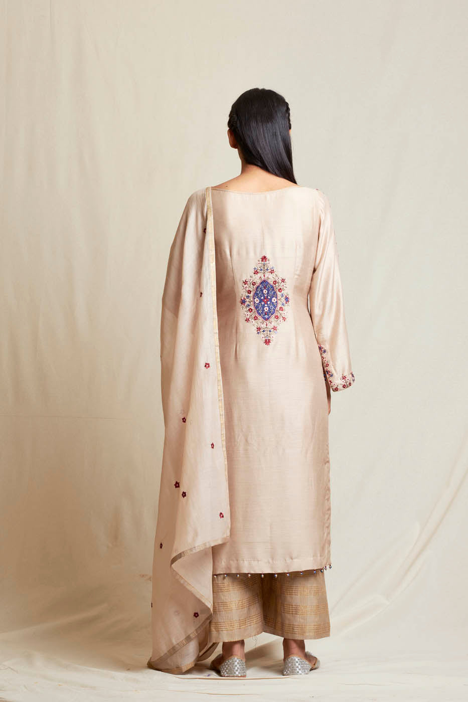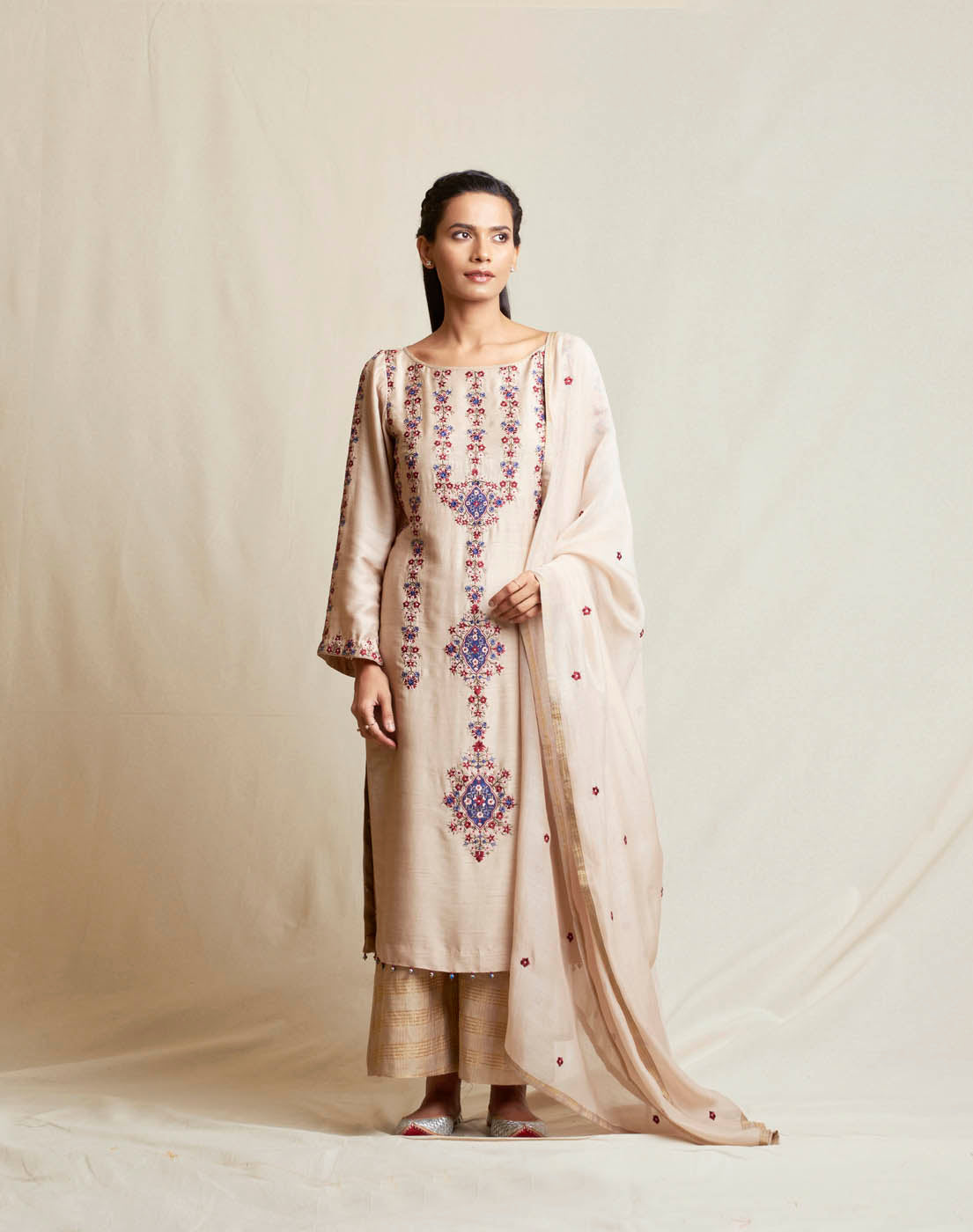 This set features straight suit in tussar georgette embroidred with silk threads and accentuated with bugle bead tassels on sleeves. It is paired with a plain palazzo and an embroidered silk cotton dupatta.