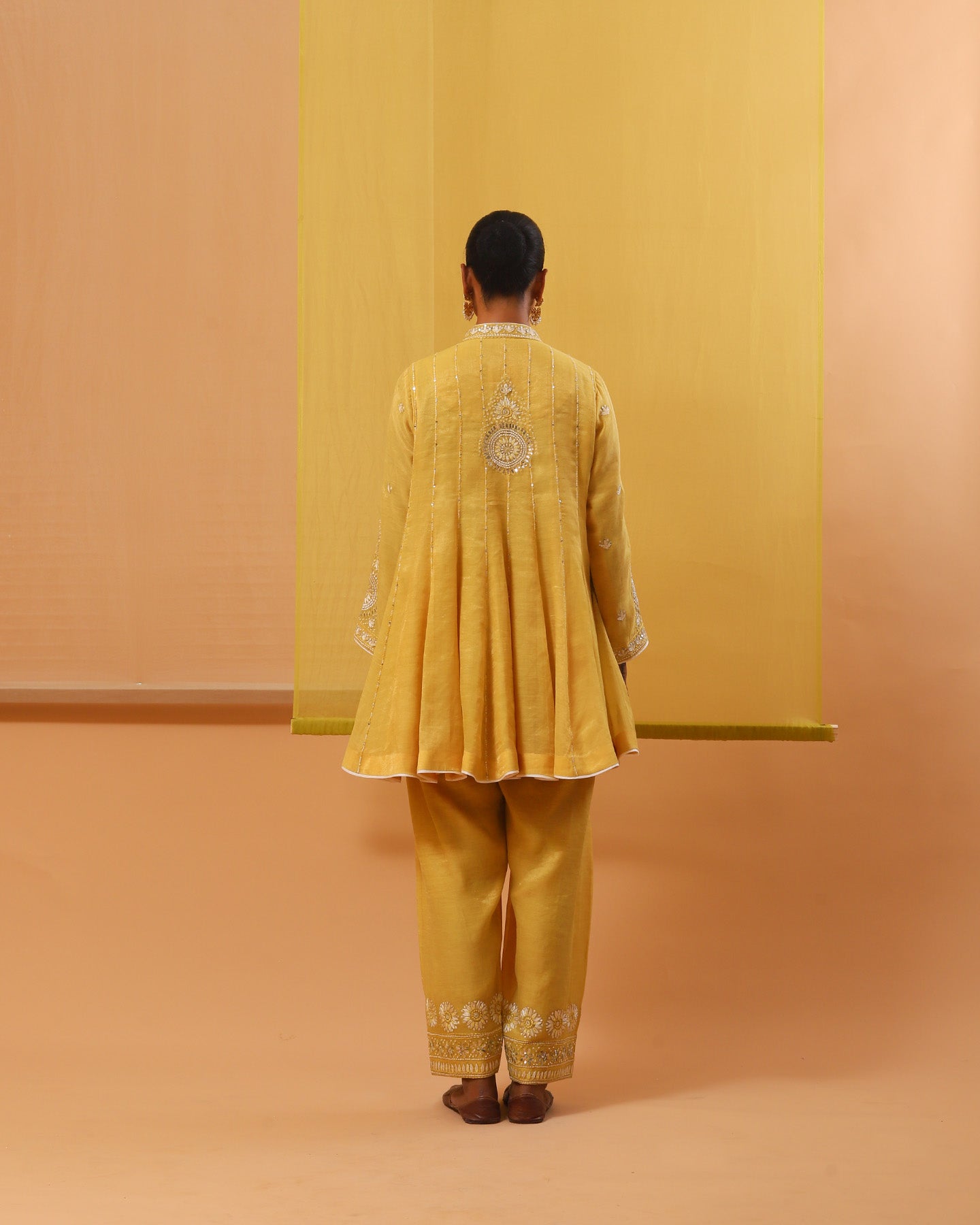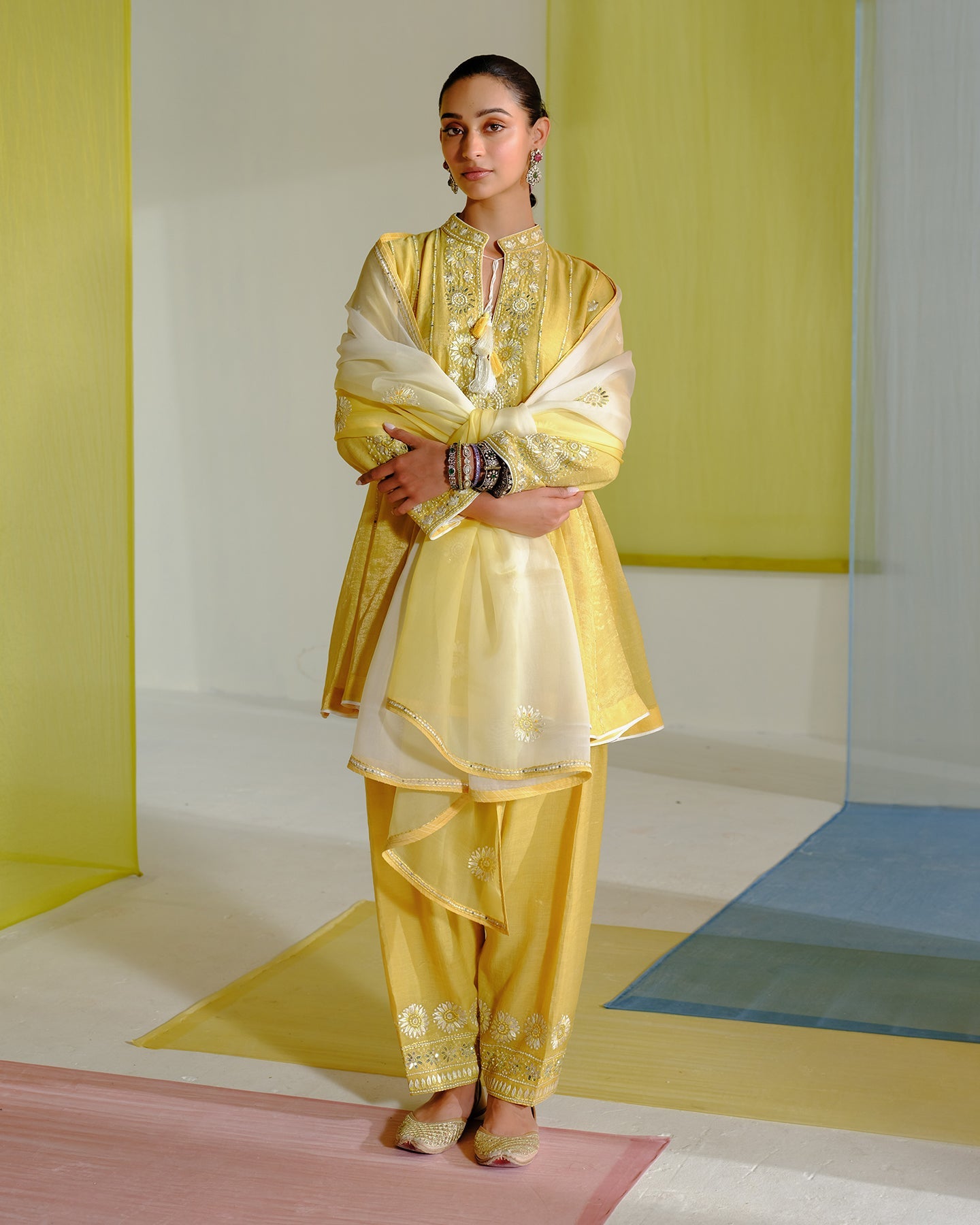 Elevate your style with our vibrant yellow handwoven cotton tissue short anarkali. This stunning piece features a band collar with a slit, three-quarter sleeves, and is perfectly paired with a matching Pakistani salwar for a seamlessness. Adorned with intricate embroidery in yellow and beige silk threads, embellished with sequins and pearls throughout, this outfit exudes elegance. Complete your look with a pure silk organza dupatta in a yellow and off-white ombre effect, featuring matching silk thread embroidery and accents of sequins and pearls for a touch of glamour.