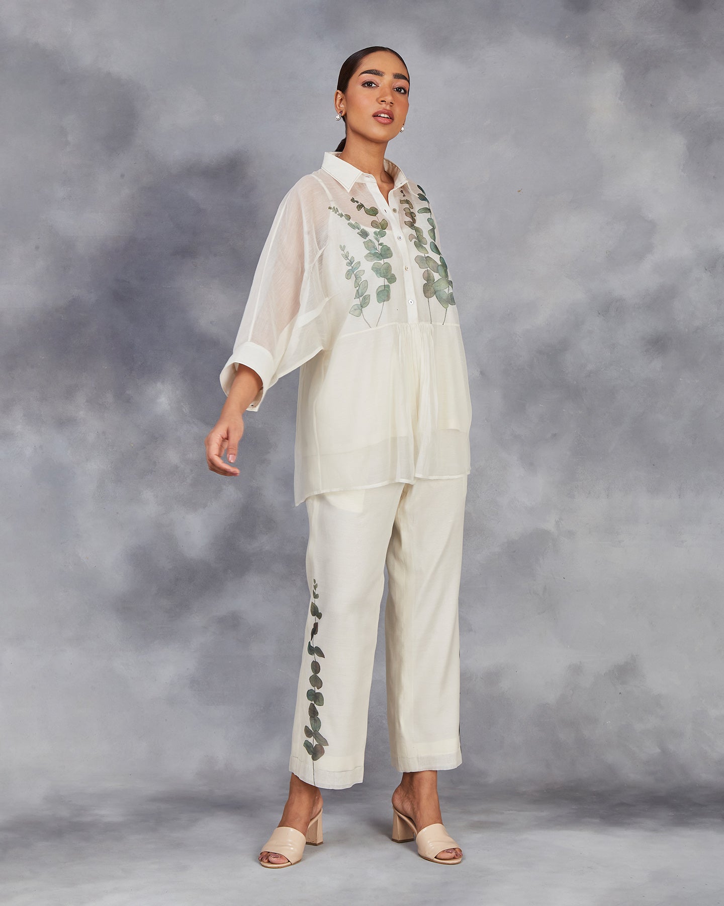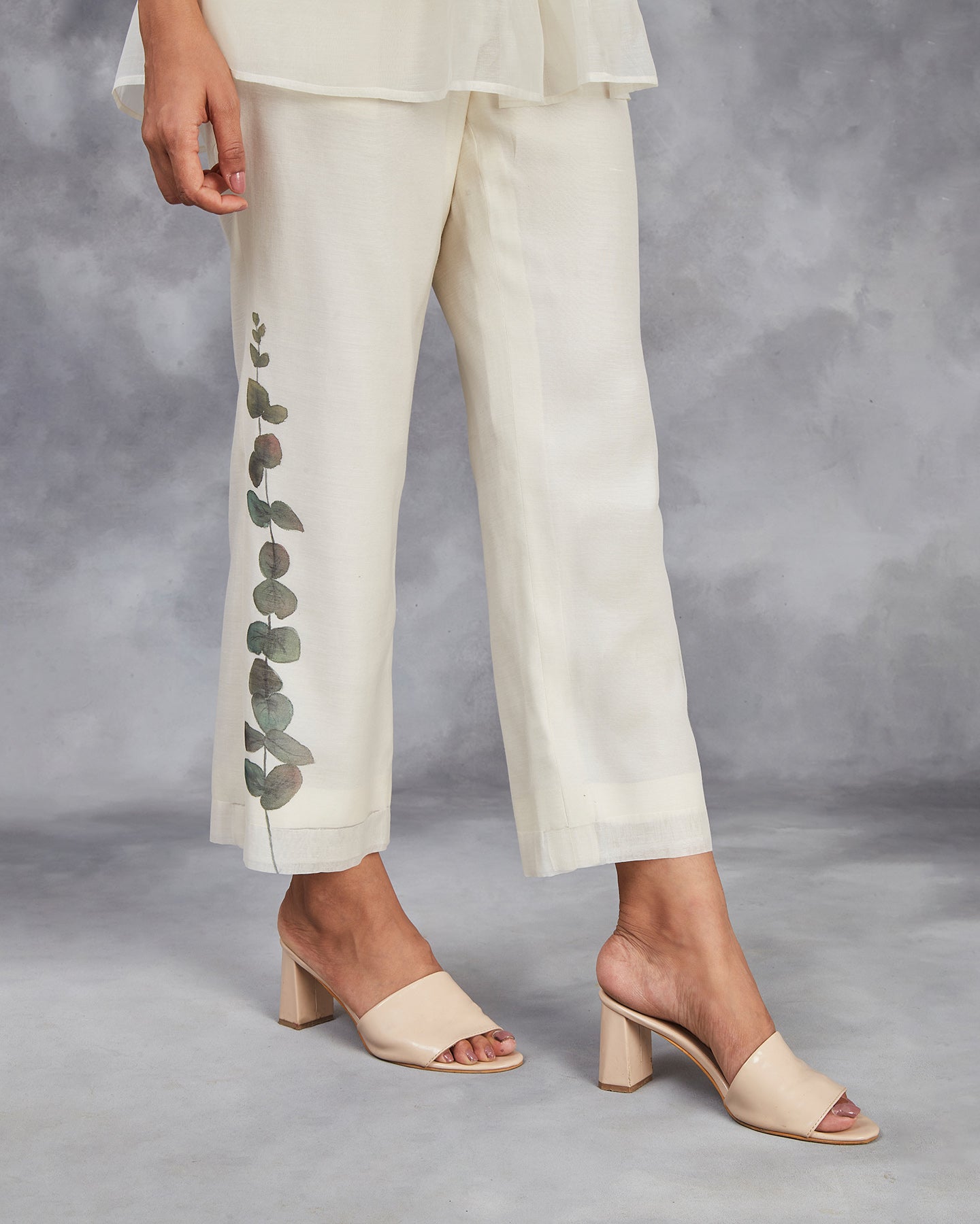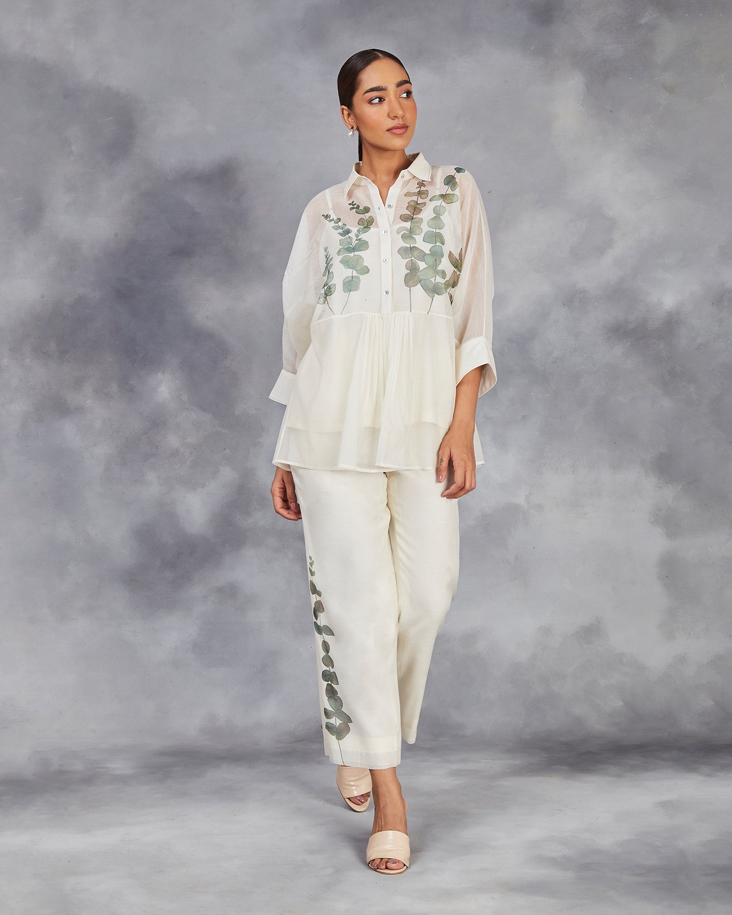 Elevate your wardrobe with our handwoven chanderi mulmul co-ordinate set in off-white. The top features a shirt collar, front placket with gathers, and three-quarter sleeves with cuffs. Paired with matching straight pants. Adorned with hand-painted lovely eucalyptus leaves. This set offers a perfect blend of traditional craftsmanship and modern style.