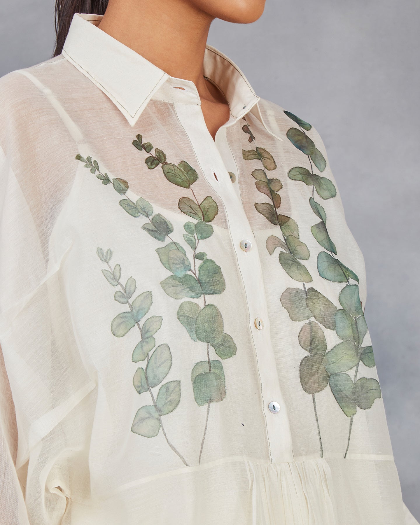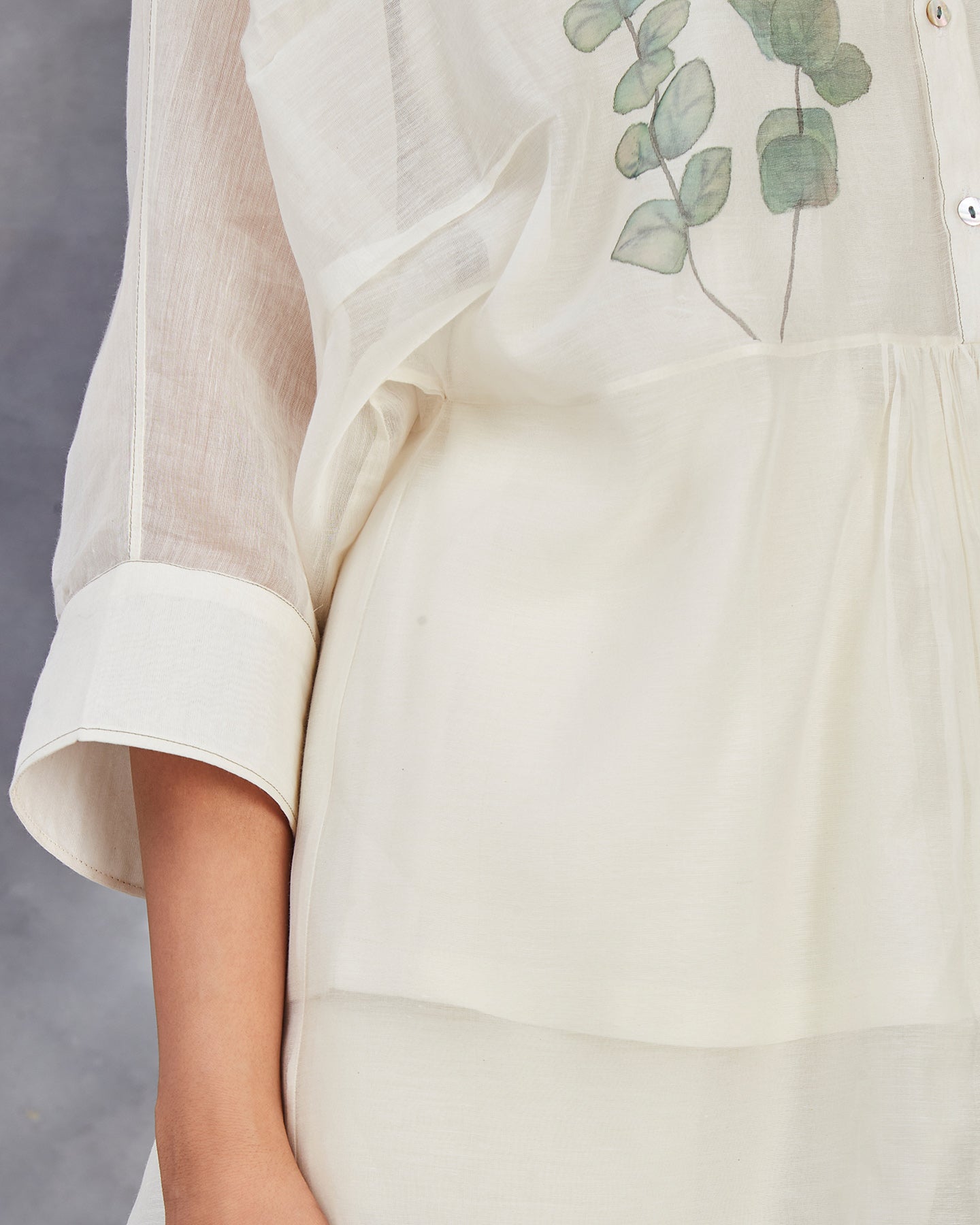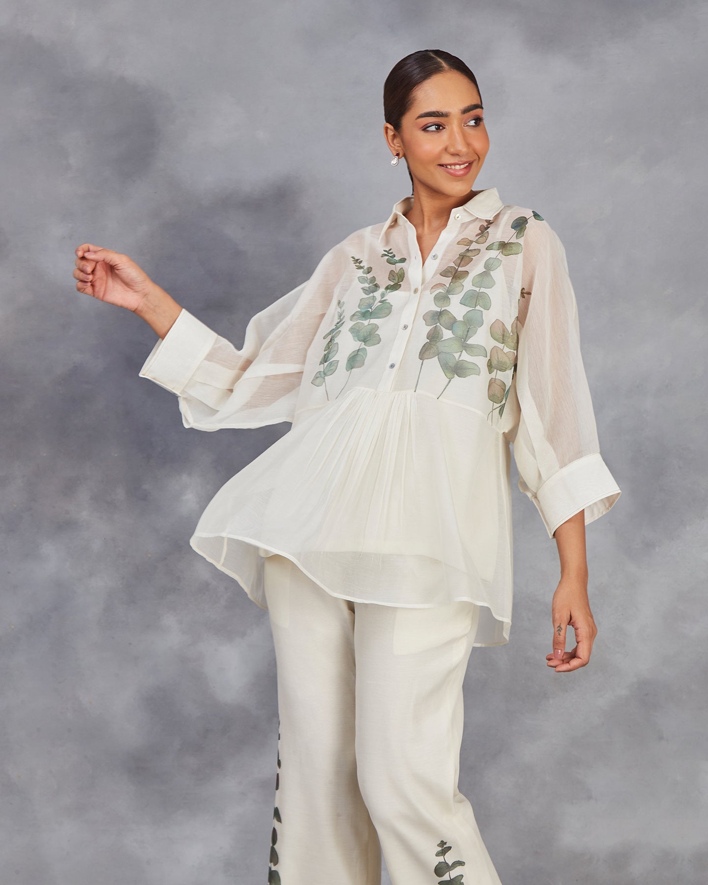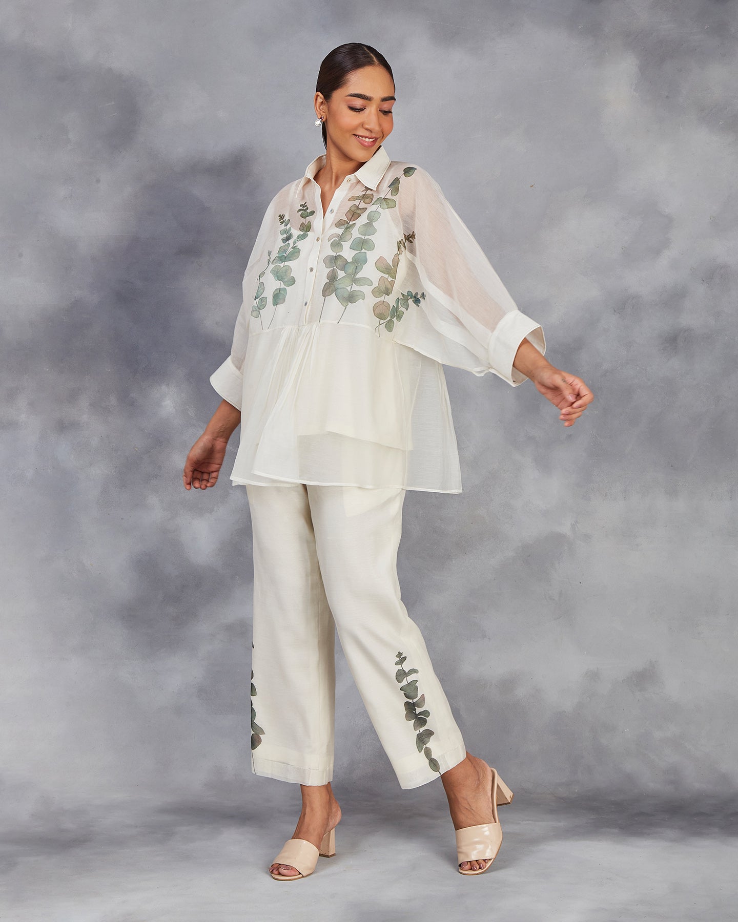 Elevate your wardrobe with our handwoven chanderi mulmul co-ordinate set in off-white. The top features a shirt collar, front placket with gathers, and three-quarter sleeves with cuffs. Paired with matching straight pants. Adorned with hand-painted lovely eucalyptus leaves. This set offers a perfect blend of traditional craftsmanship and modern style.