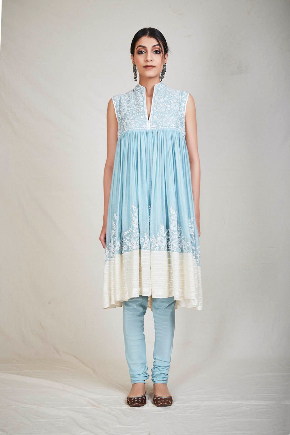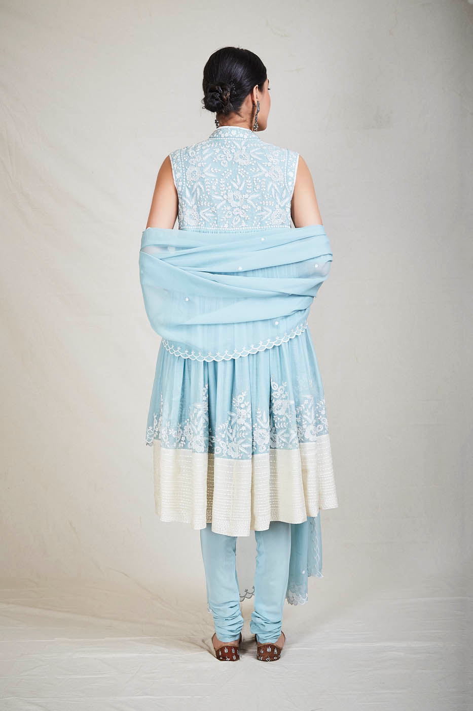 This is a pale turquoise colour mul A-line suit enhanced with embroidered floral motifs. It comes with a pair of churidars and a chiffon dupatta.