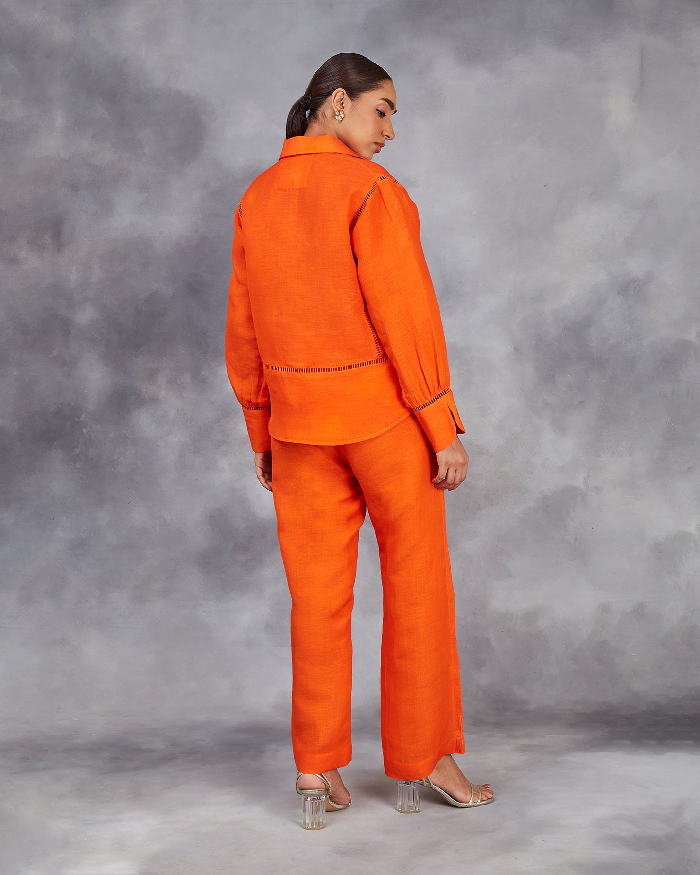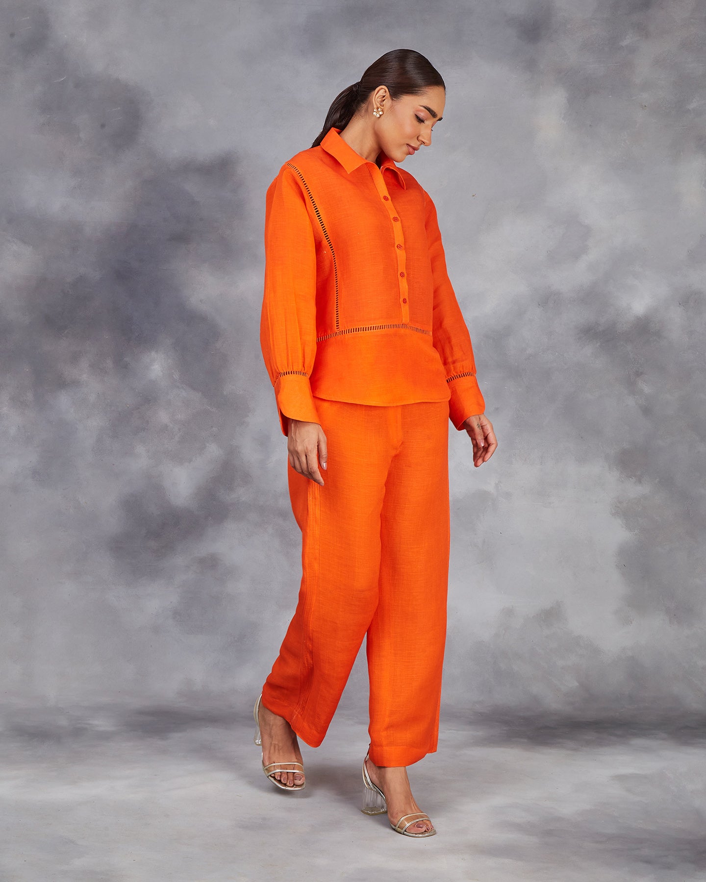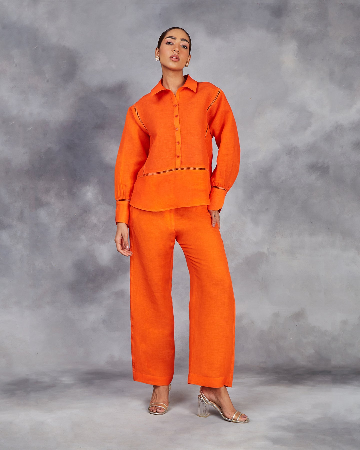 A striking orange pure linen co-ordinate set. The shirt features a classic collar, a front placket, full sleeves with modified cuffs, and delicate beading. It comes with a pair of loose pants adorned with silk thread embroidered vertical lines. This set seamlessly combines contemporary style with elegant craftsmanship.