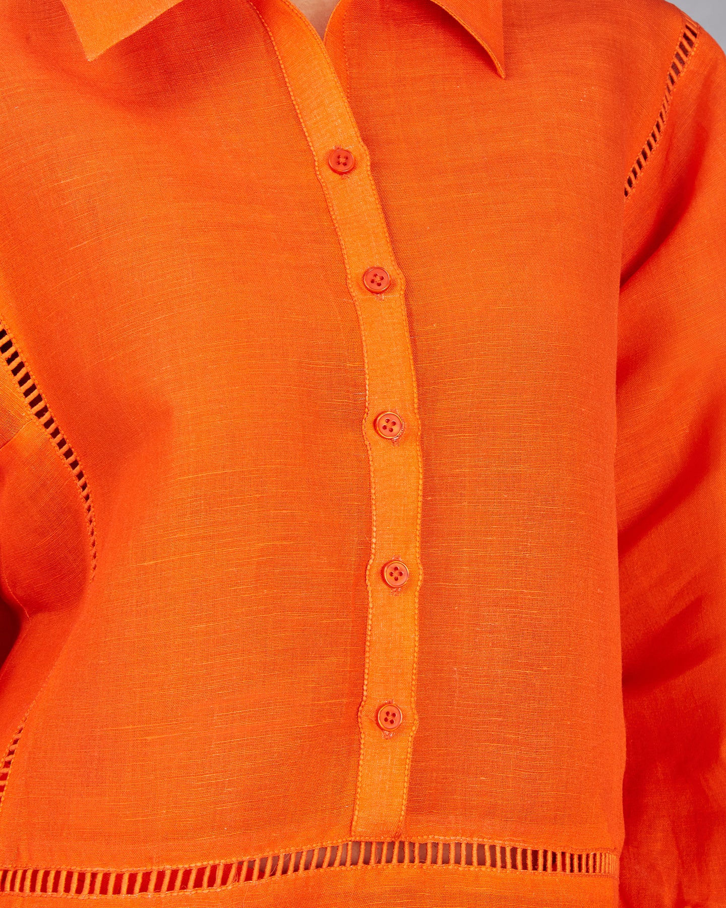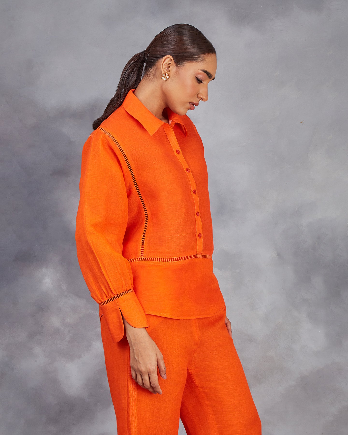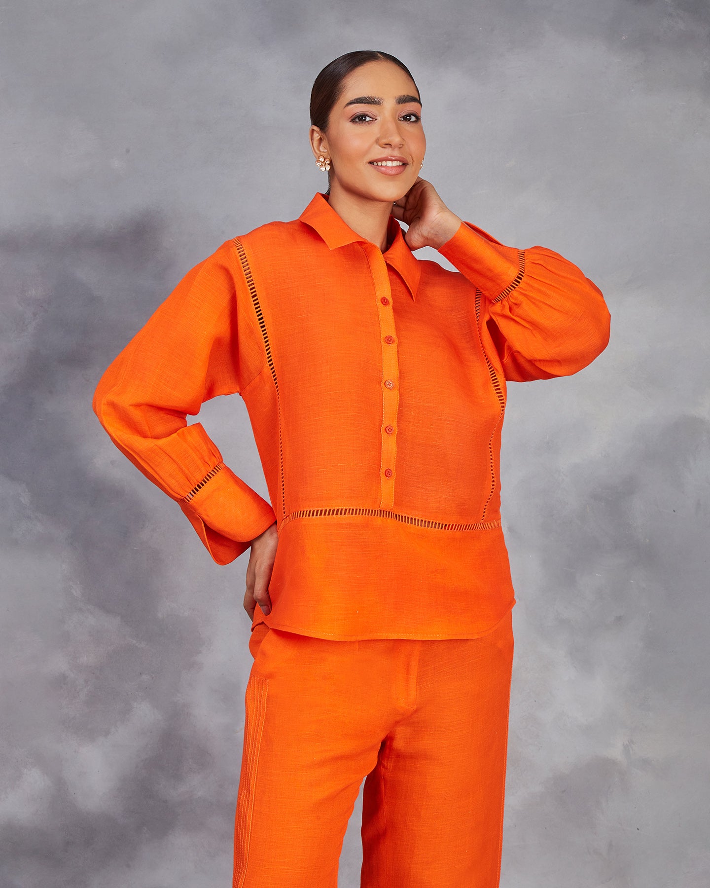 A striking orange pure linen co-ordinate set. The shirt features a classic collar, a front placket, full sleeves with modified cuffs, and delicate beading. It comes with a pair of loose pants adorned with silk thread embroidered vertical lines. This set seamlessly combines contemporary style with elegant craftsmanship.