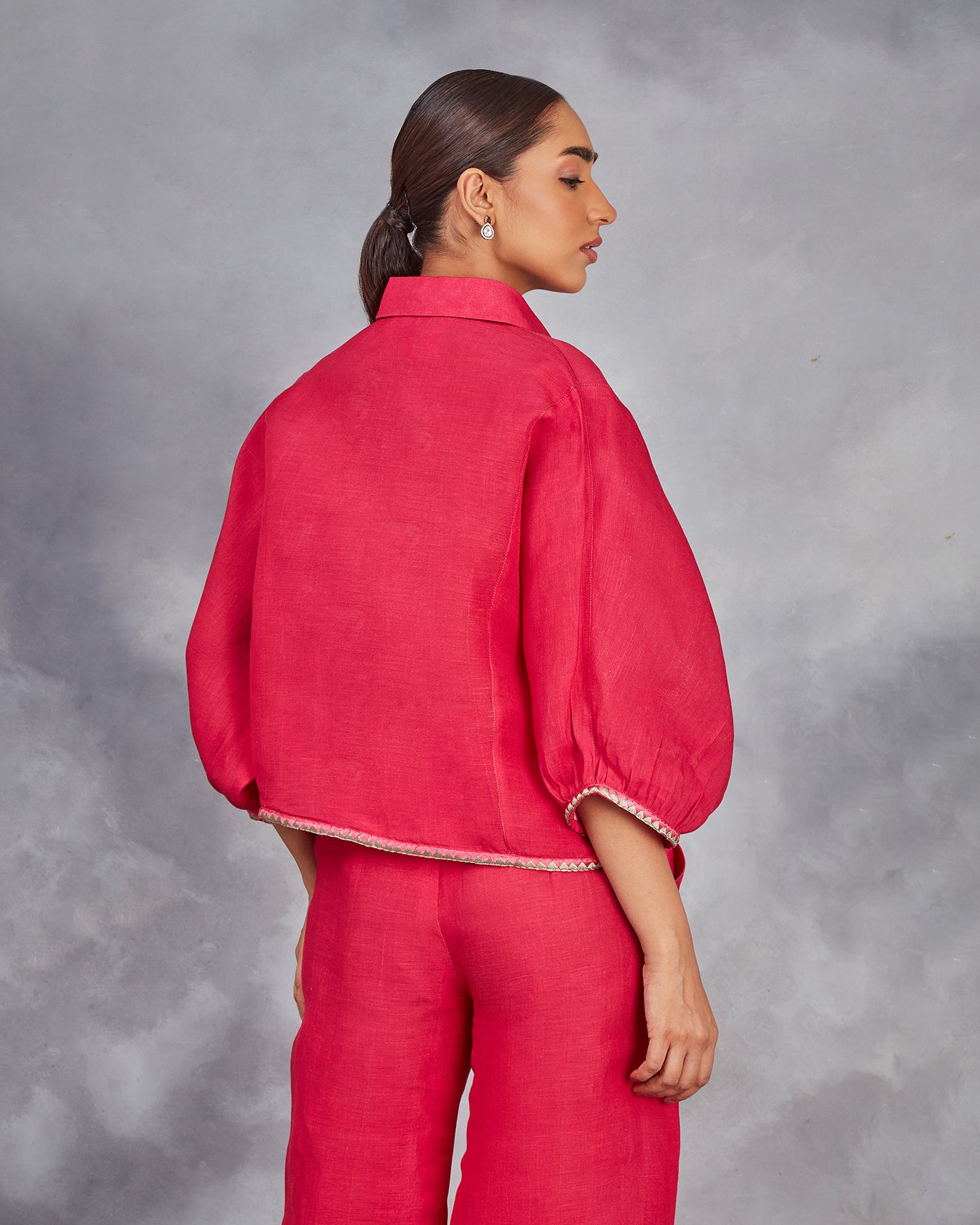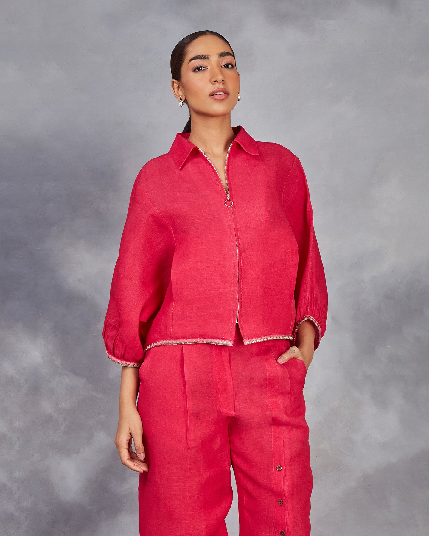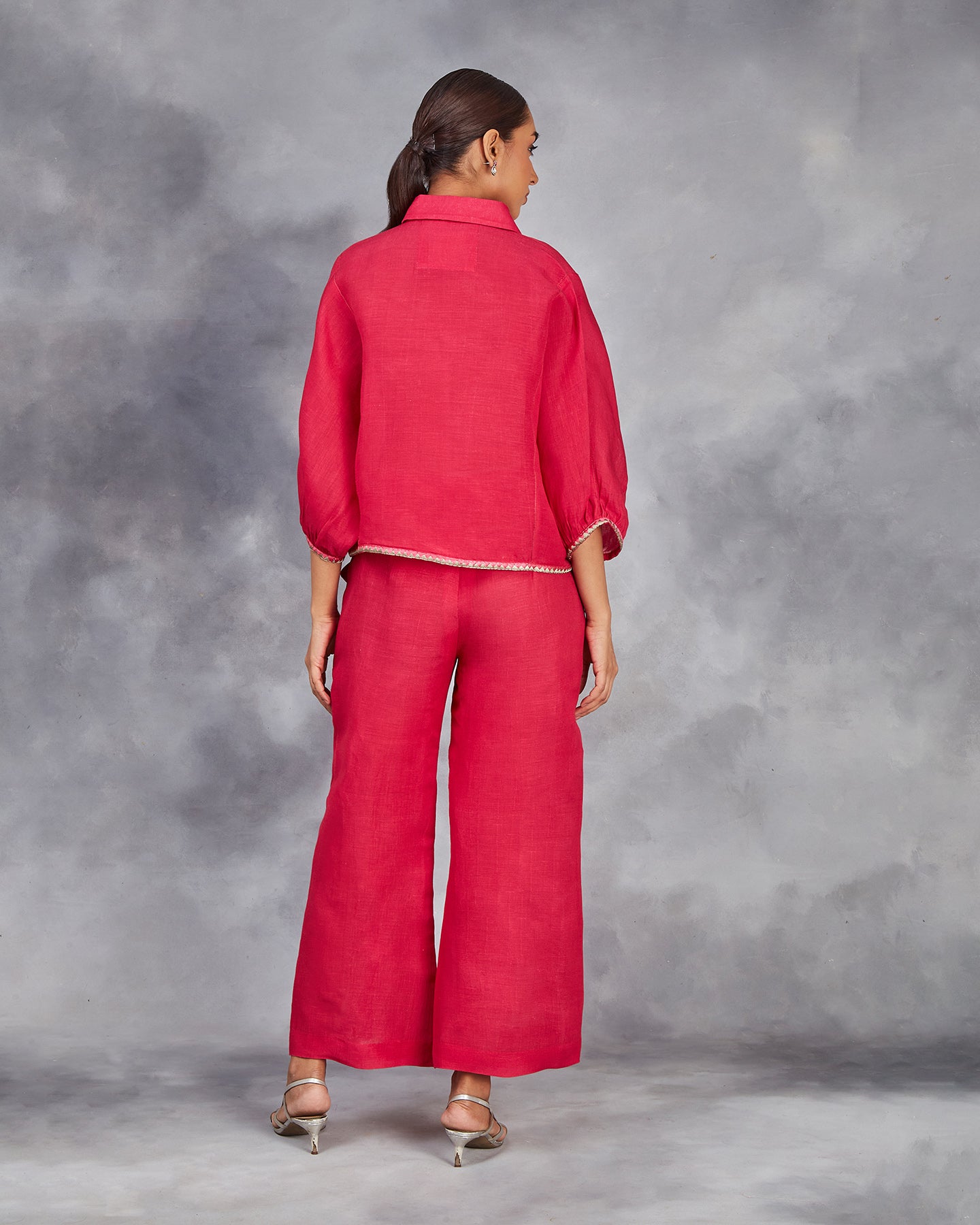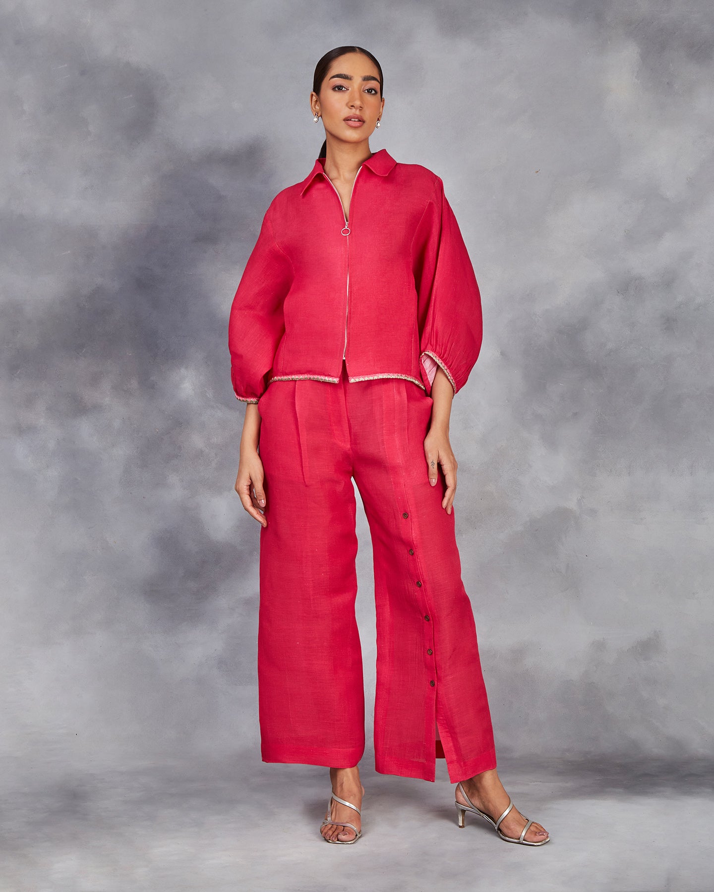 This is a stunning magenta co-ordinate set crafted using pure linen. The shirt boasts a classic collar with a front zip and modified kimono sleeves. Delicate silk thread embroidery adorns its hemline. It is paired with stylish flared pants which have a long slit with buttons. This set combines contemporary design with elegant detailing.