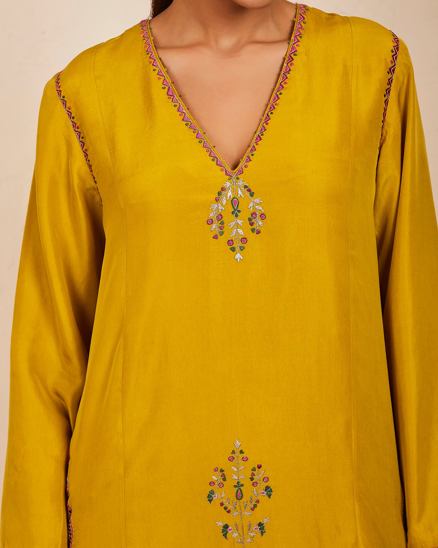 This is a mustard silk Pakistani kurta with a pair of wine pants and a silk dupatta. All finely embroidered with silk threads.
