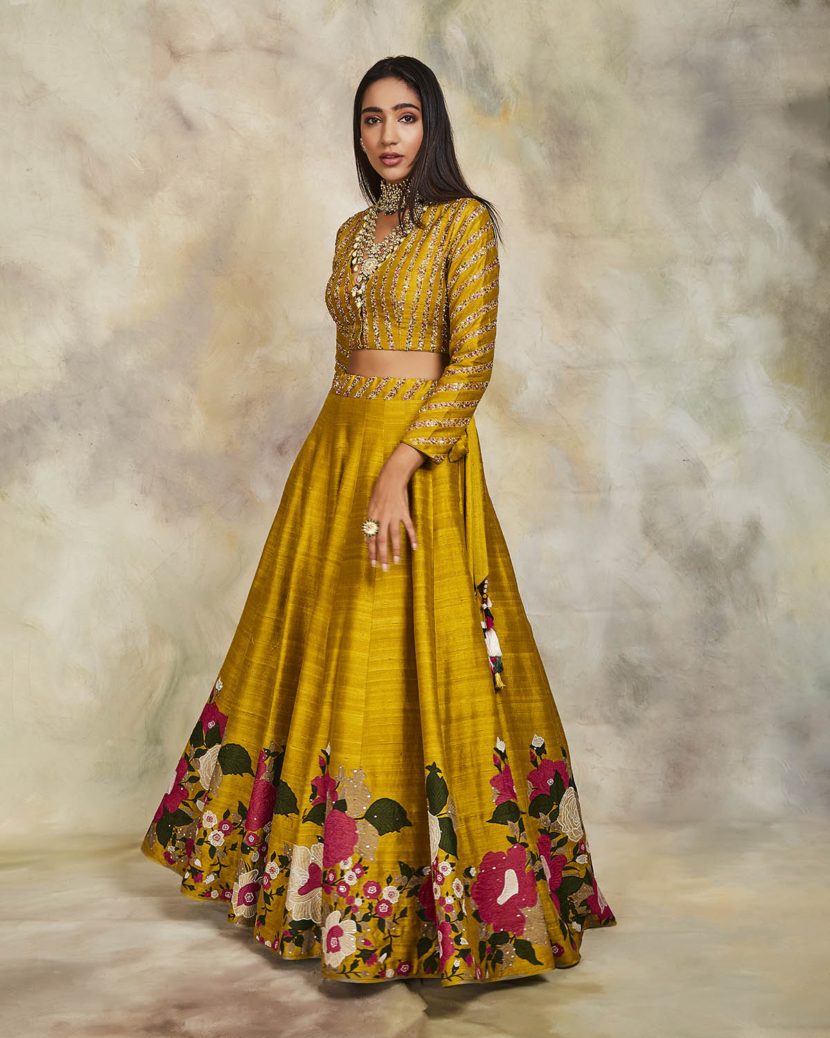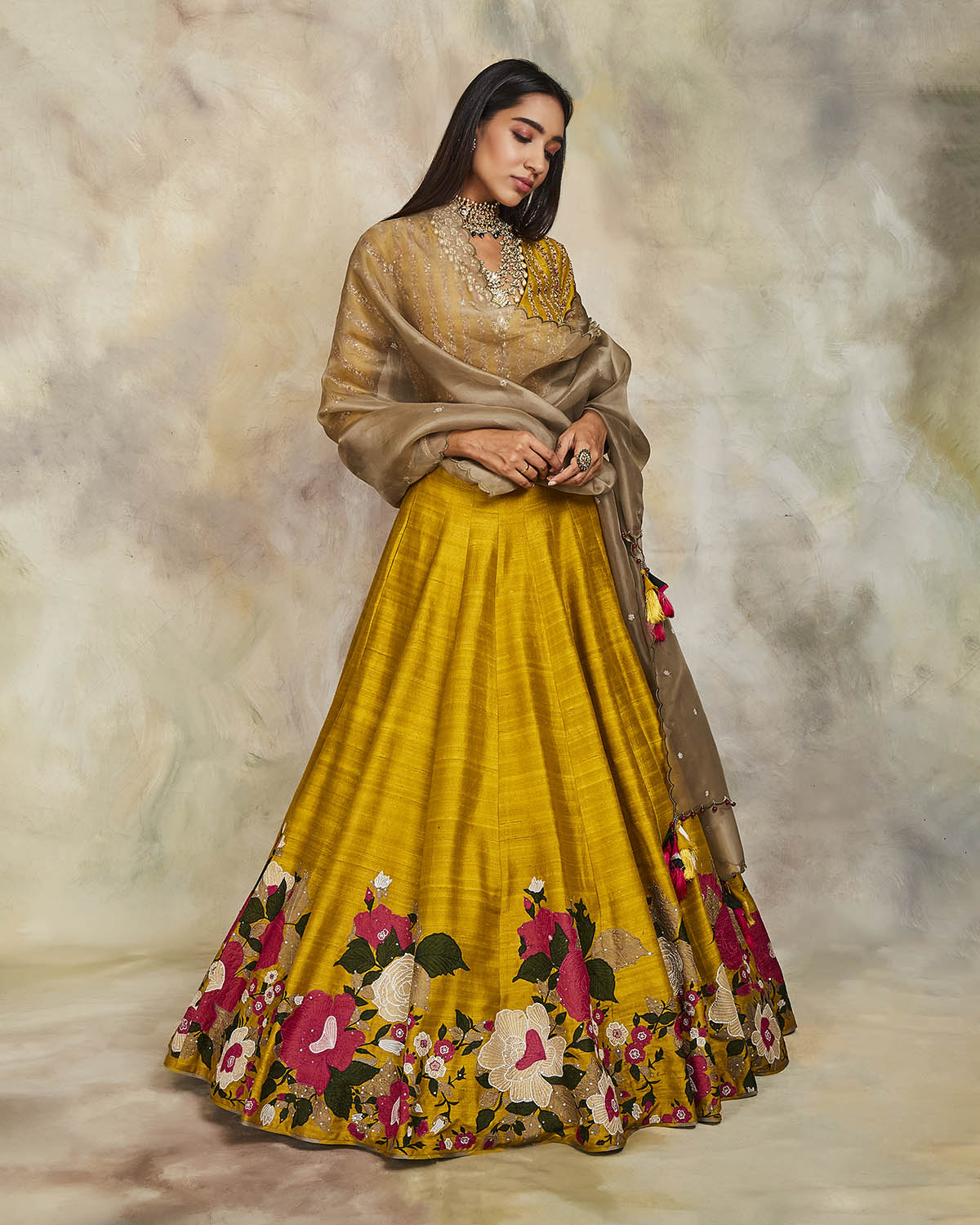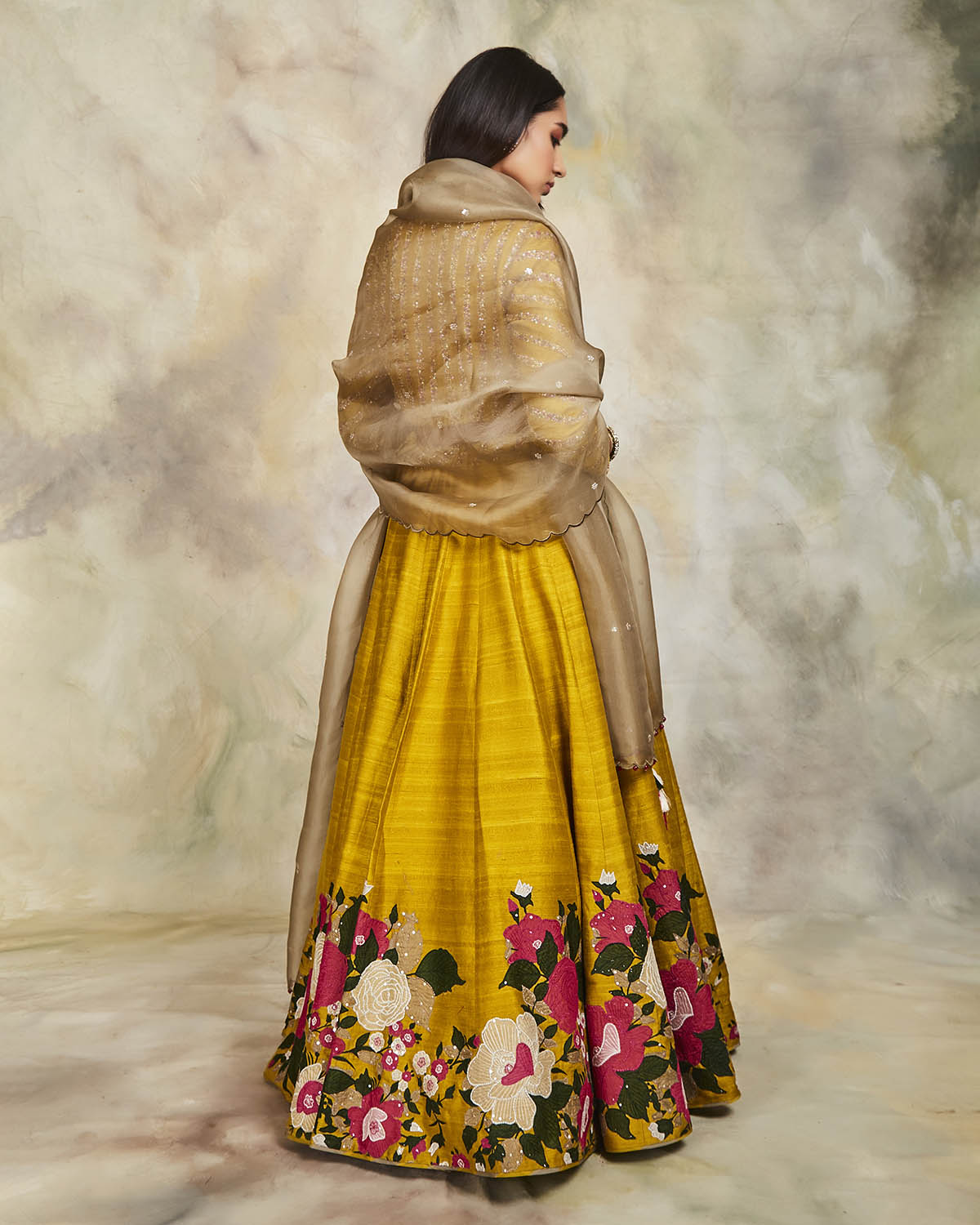 This mustard raw silk lehenga has been enhanced with applique and sequins, matched with a sequin embroidered blouse. The set comes with an olive organza dupatta embroidered using sequins and scallops on the edges.